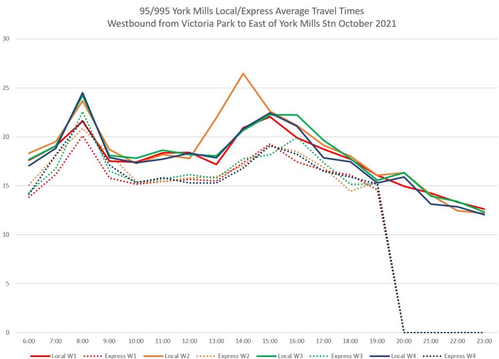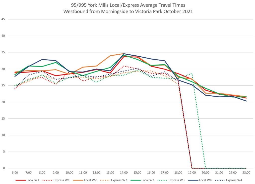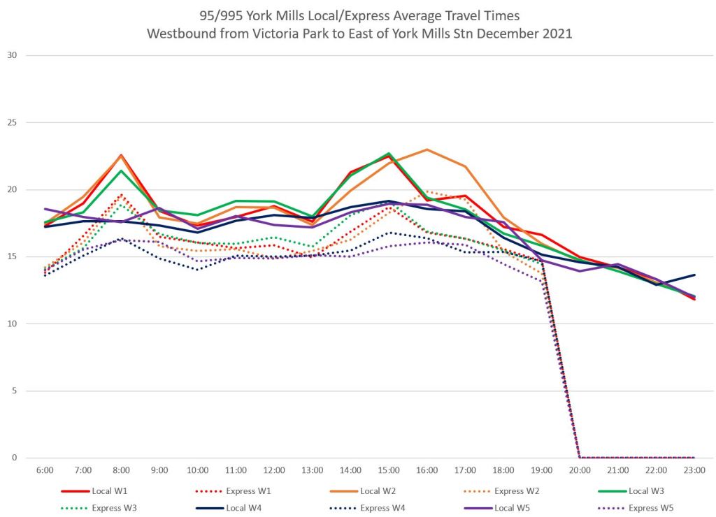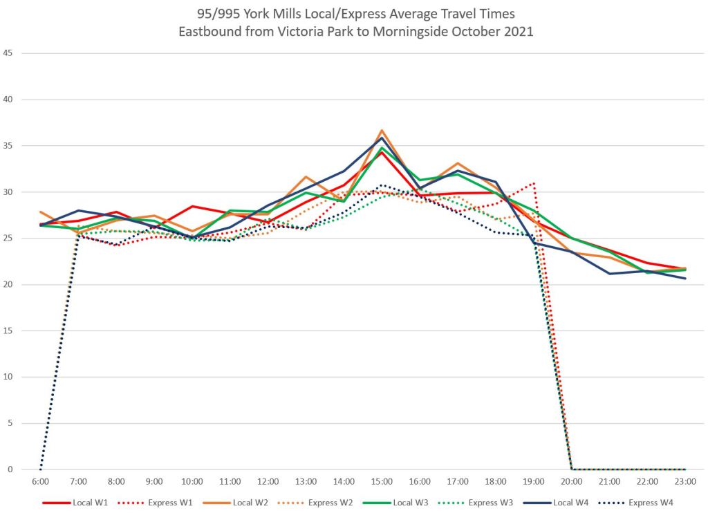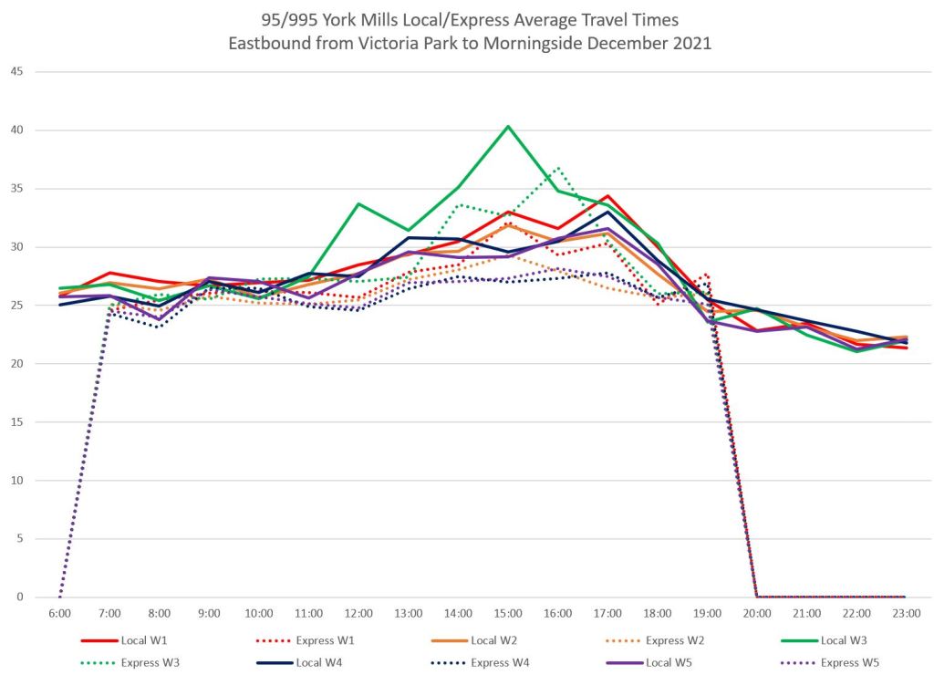 These charts compare the travel times for local and express trips between Morningside and York Mills Station. Morningside is used as the eastern screenline to pick up all of the trips entering the route from UTSC on the evening 95B service.