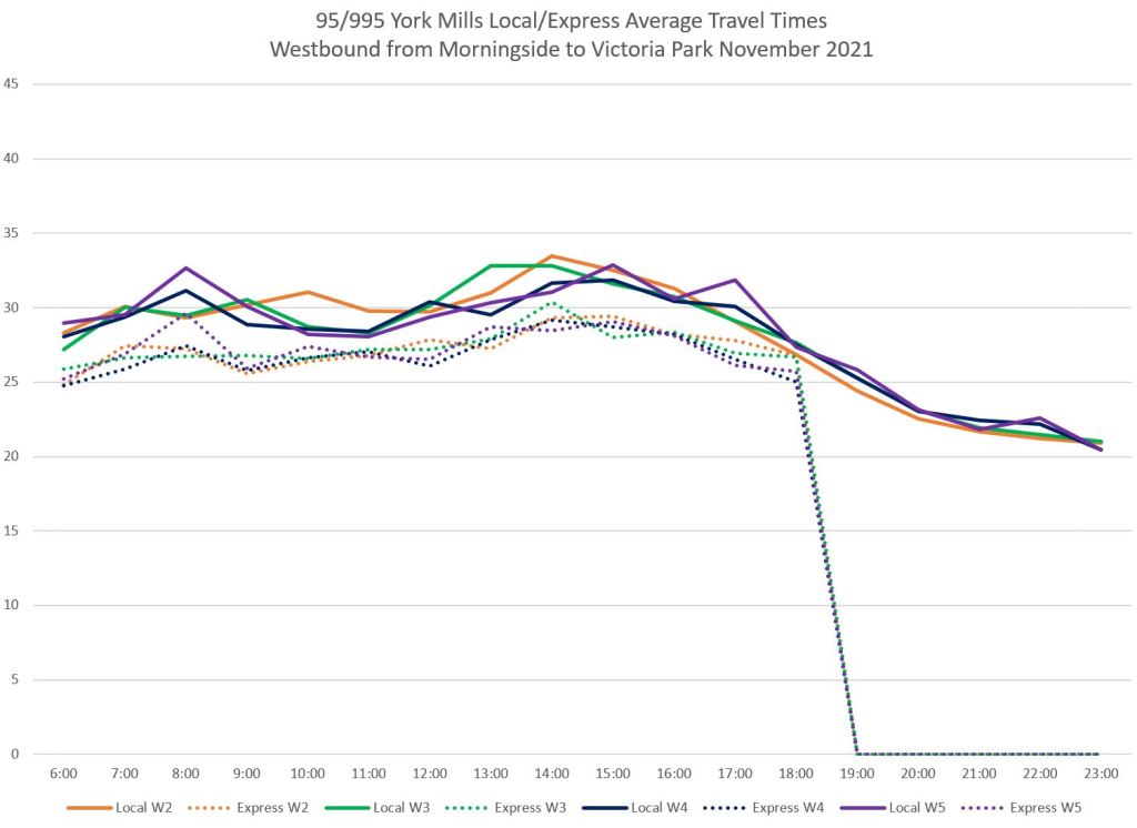 Generally speaking, there is less than five minutes’ difference in travel times for the express buses westbound.