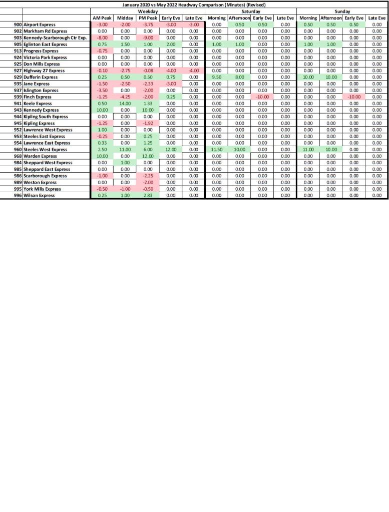The charts below show the difference in headways (in minutes) between January 2020 and May 2022. Negative values (red) indicate vehicles that arrive less frequently while positive ones (green) show more frequent service. For example, Line 1 Yonge-University now operates every 3’36” in the AM peak compared to 2″21″ pre-pandemic, a difference of 1’15”.