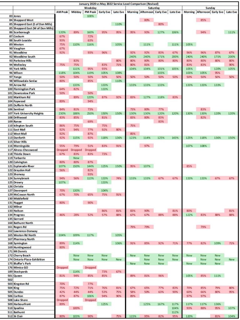 In a few cases there have been vehicle type changes on a route such as the restoration of streetcar service on 505 Dundas. The percentages are relative to the scheduled vehicles per hour with no adjustment for capacity. Similarly, a few bus routes have changed between regular sized and articulated vehicles.