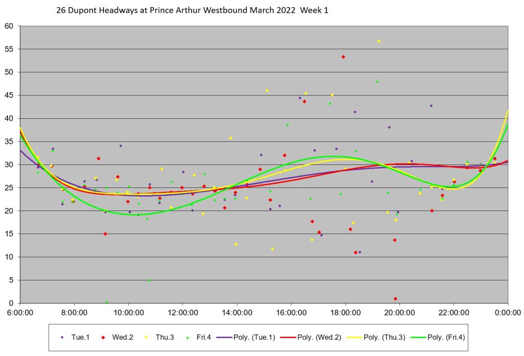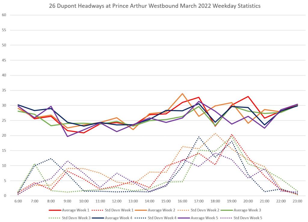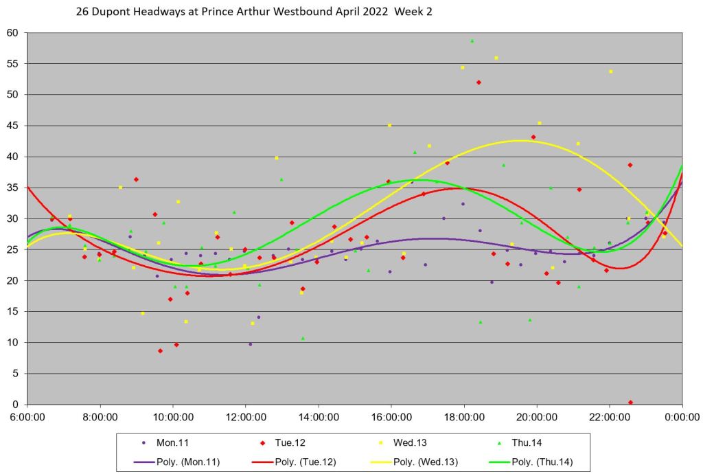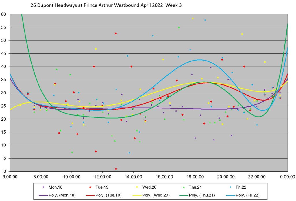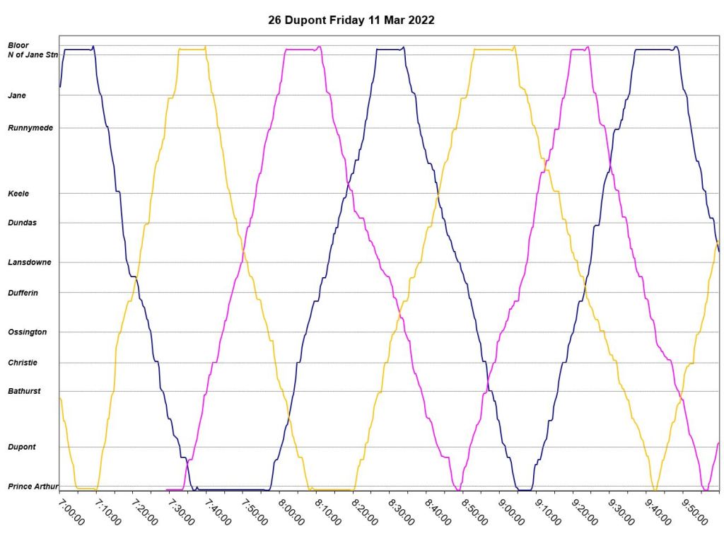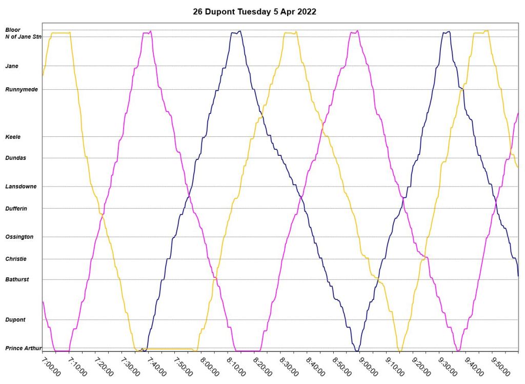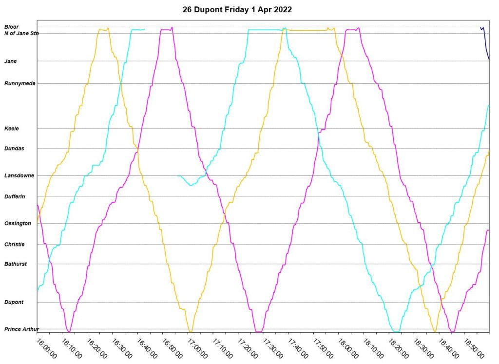 - By the PM peak, there is a large gap after “Yellow” compounded by “Turquoise” taking a long break after 6pm, and “Mauve” short turning at Keele/Dundas at 5:40pm.