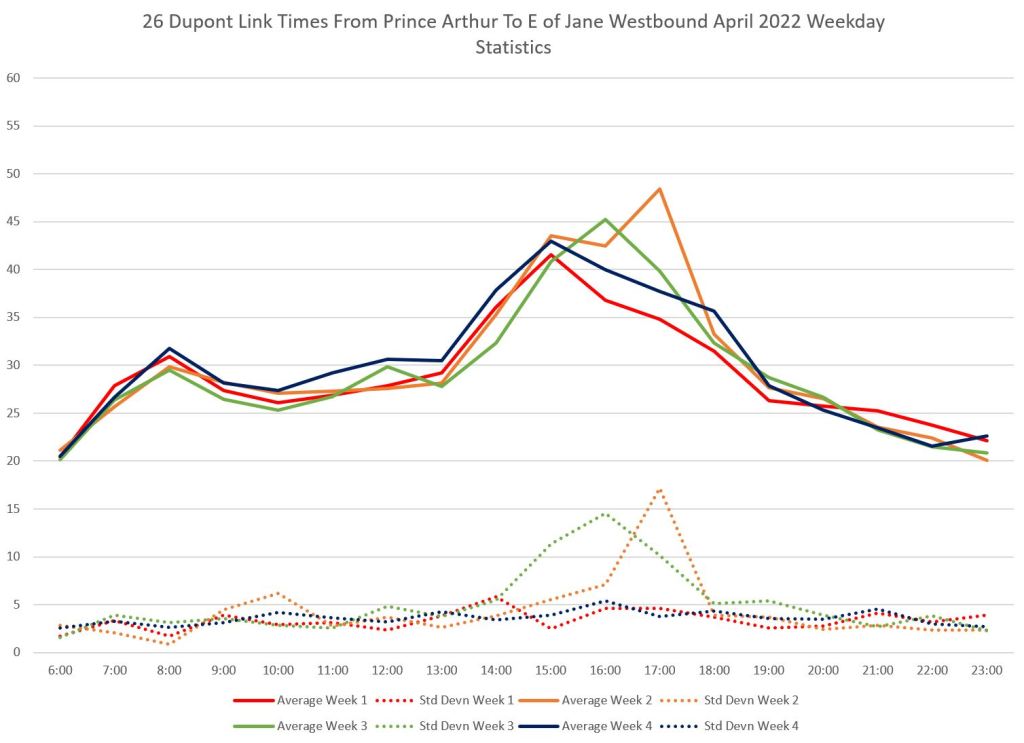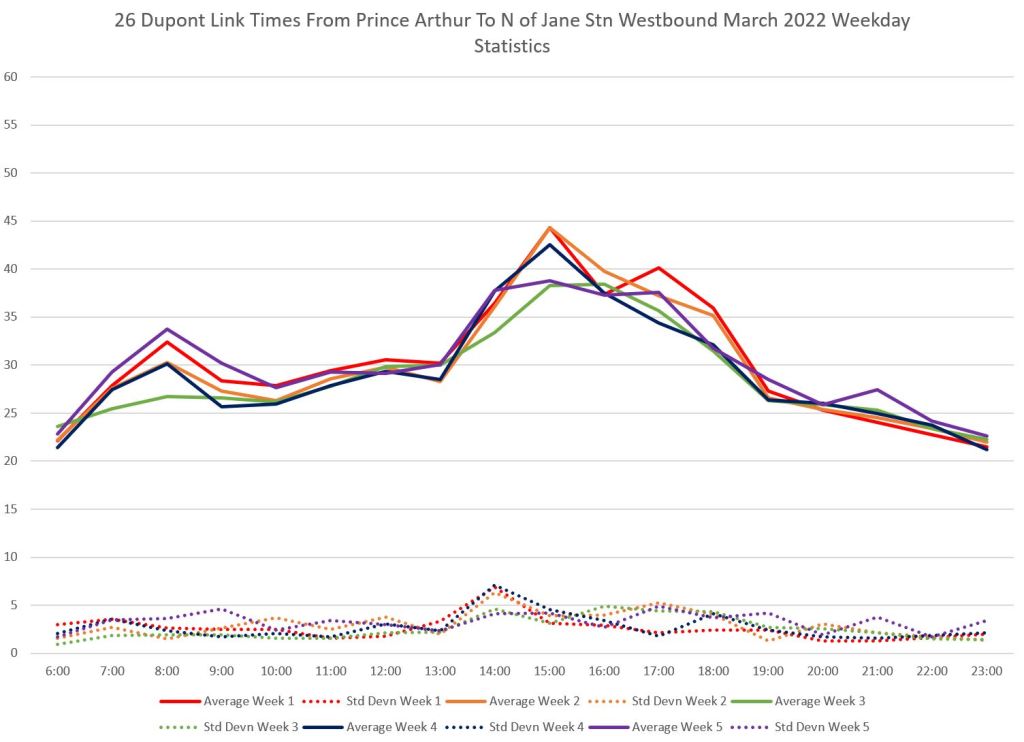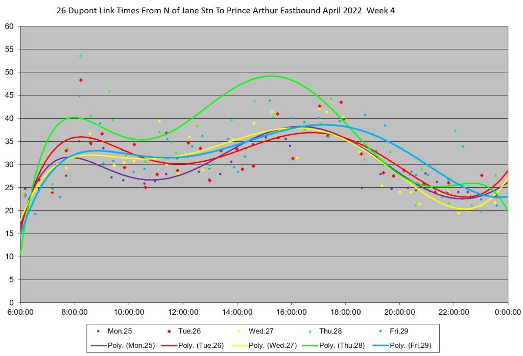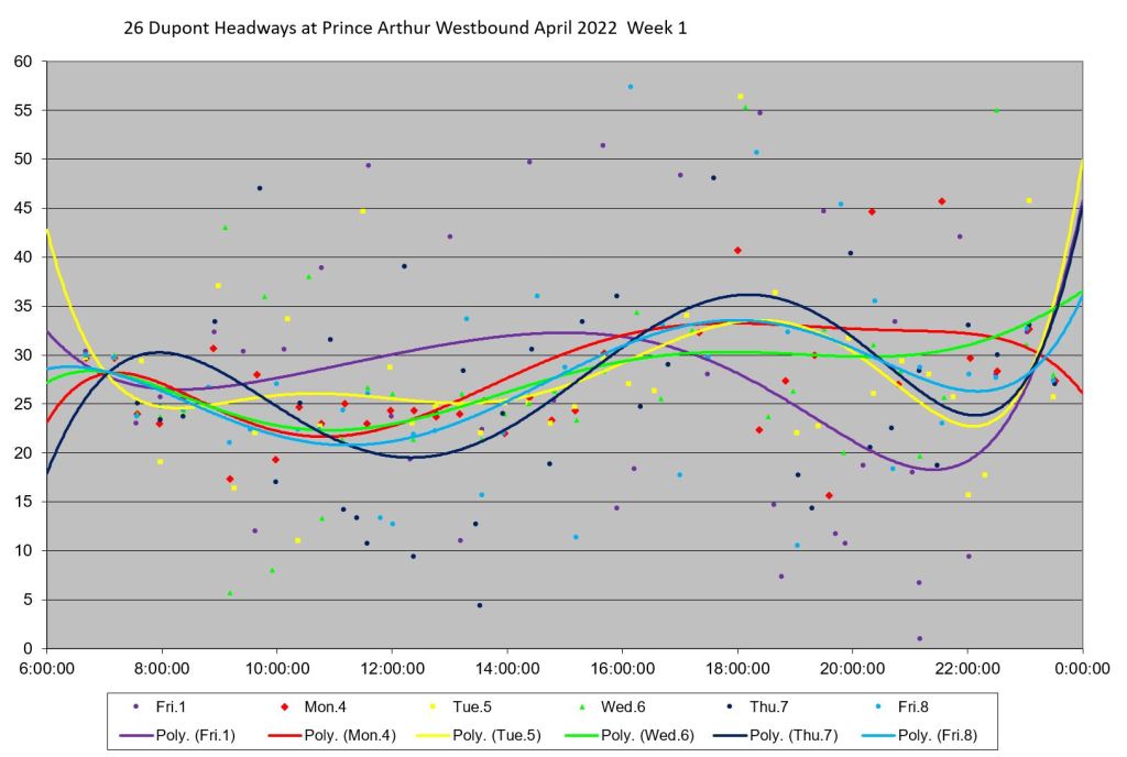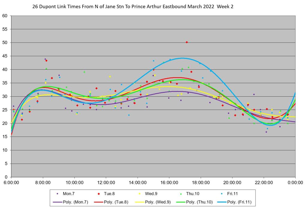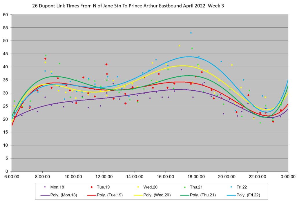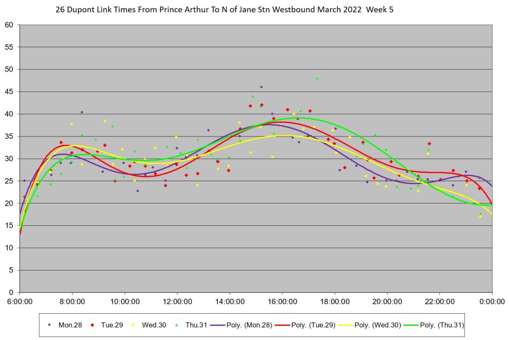 - By the PM peak, there is a large gap after “Yellow” compounded by “Turquoise” taking a long break after 6pm, and “Mauve” short turning at Keele/Dundas at 5:40pm.