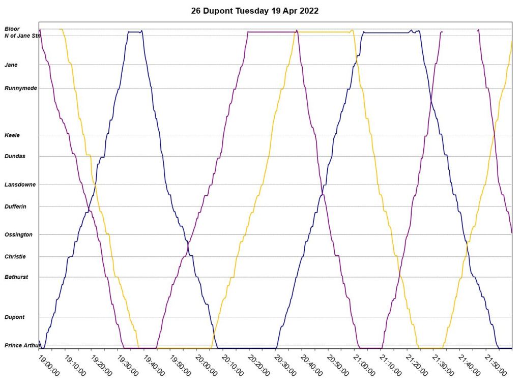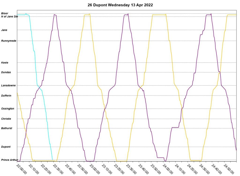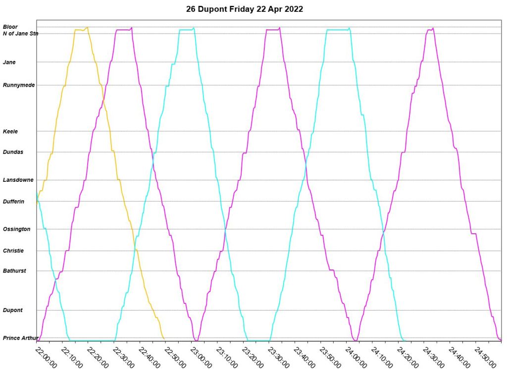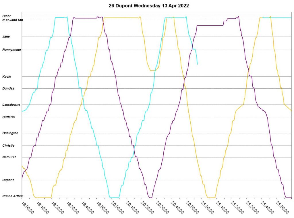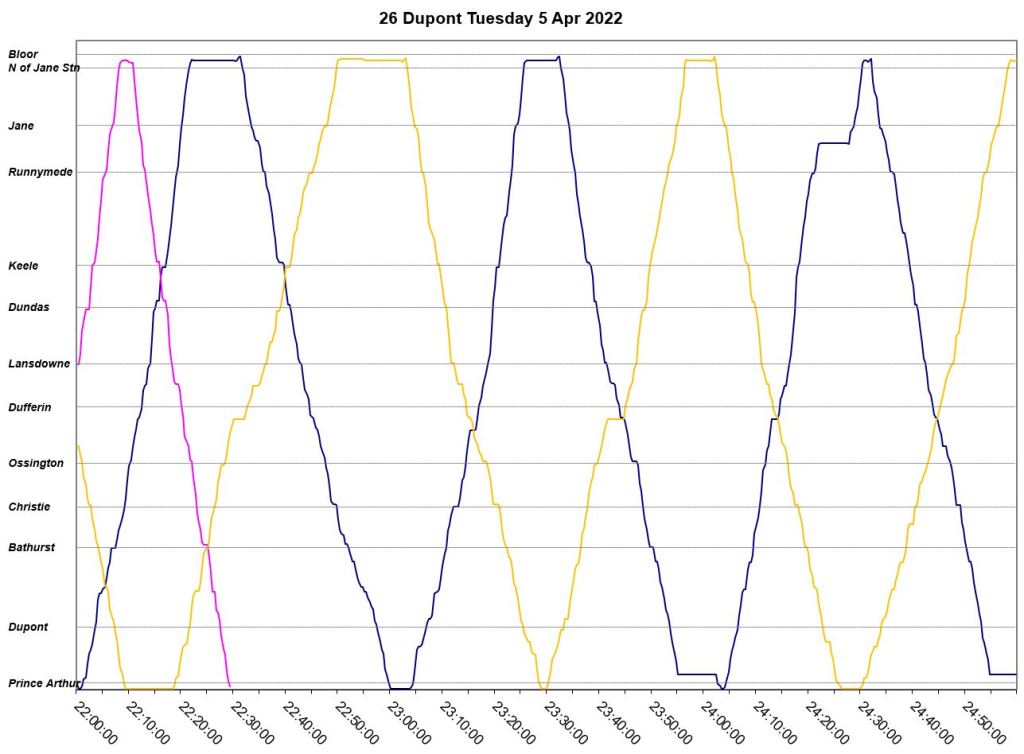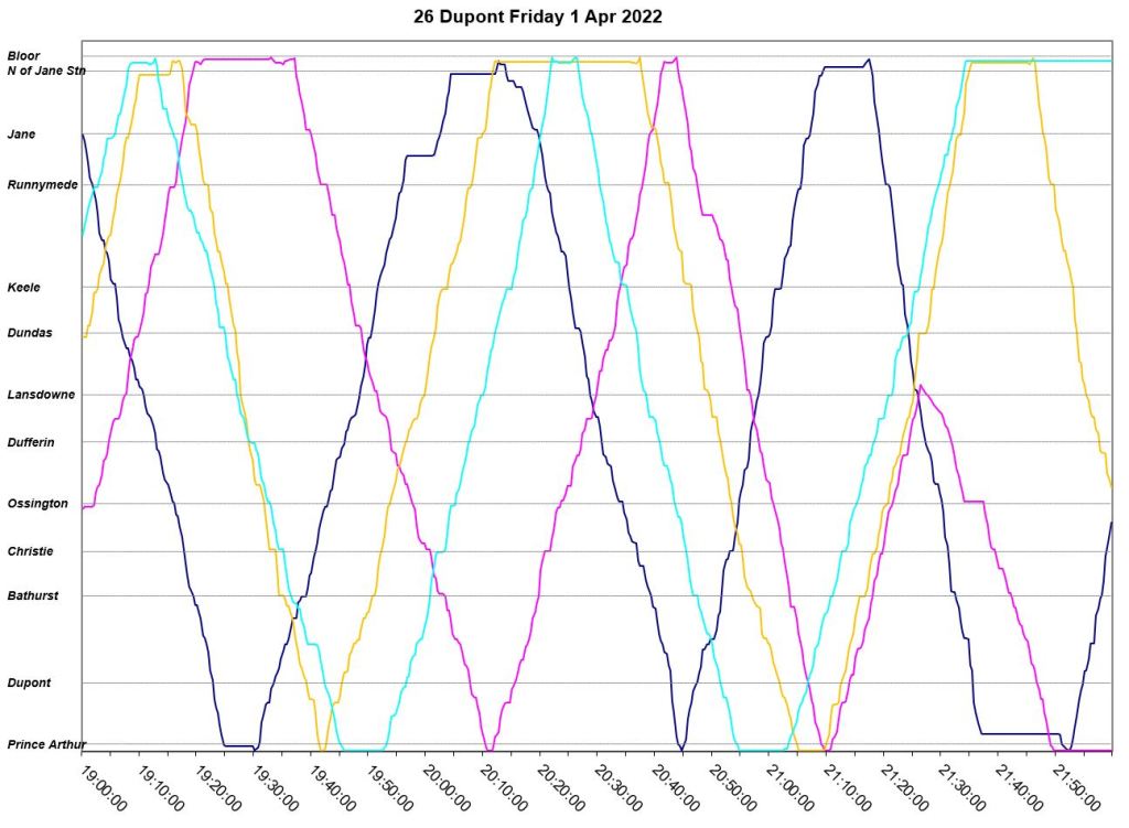 An unscheduled fourth bus, “Dark Blue” appears at Jane Station just before 7pm, but even this does not correct the headway problems. The two late evening buses adjust their trips to get on time for service after 10pm. “Pink” short turns westbound at Lansdowne at about 9:20pm, and “turquoise” takes a long layover at Jane.