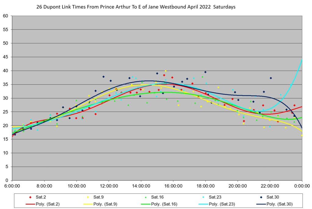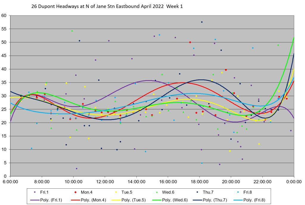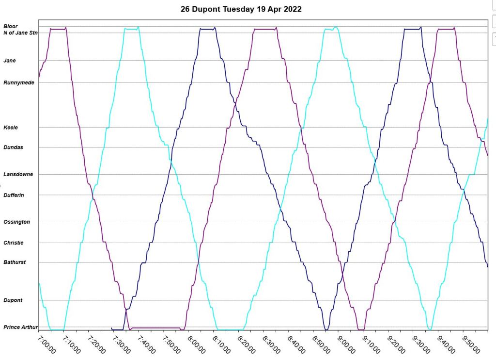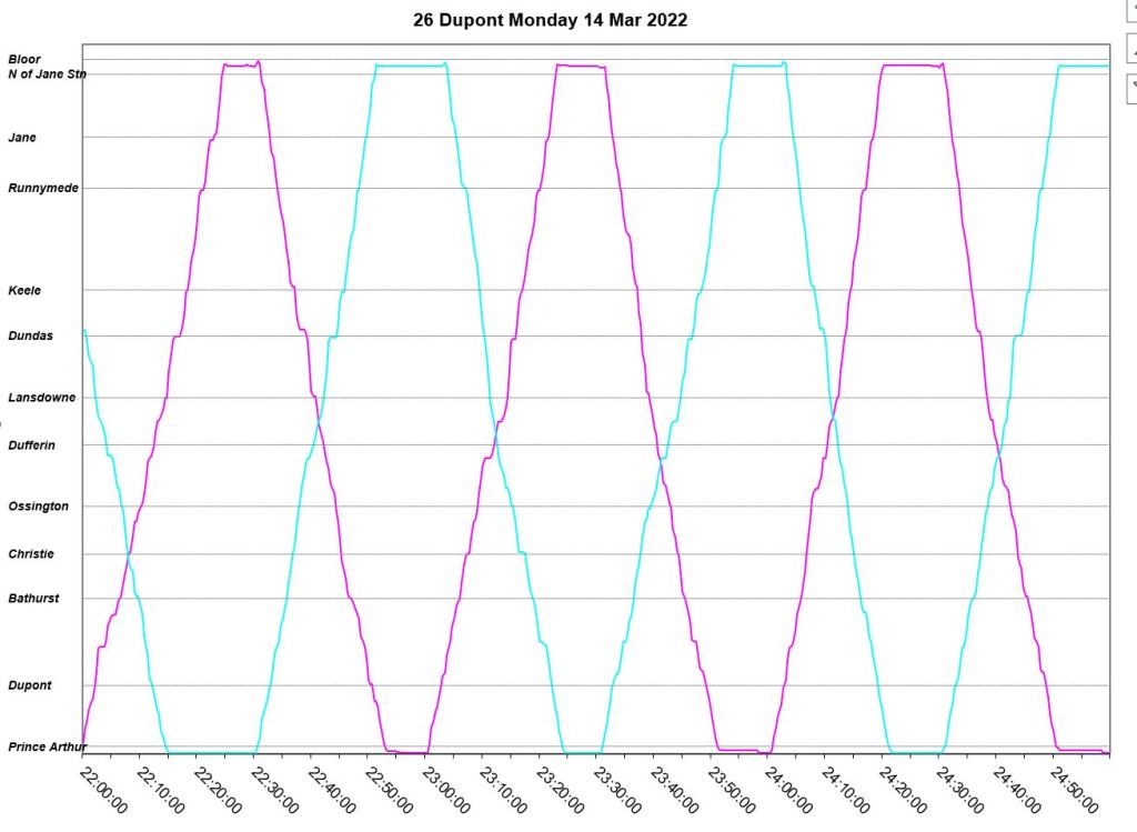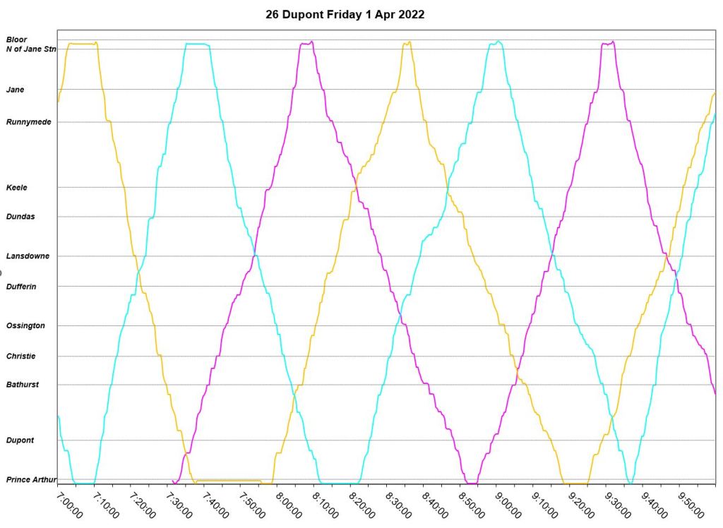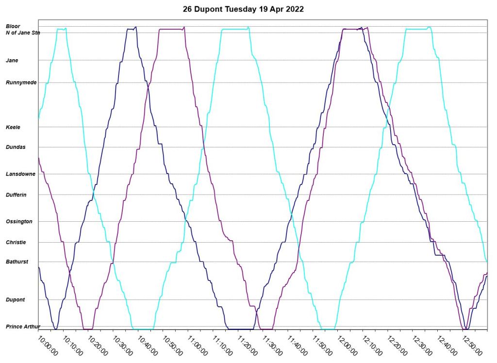 An unscheduled fourth bus, “Dark Blue” appears at Jane Station just before 7pm, but even this does not correct the headway problems. The two late evening buses adjust their trips to get on time for service after 10pm. “Pink” short turns westbound at Lansdowne at about 9:20pm, and “turquoise” takes a long layover at Jane.