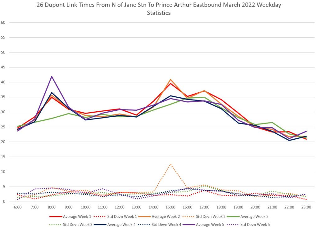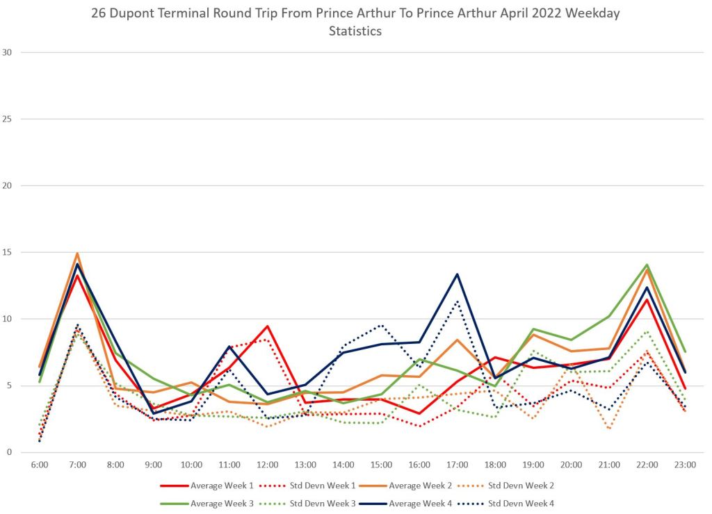 Of particular note are the values in the weekday afternoon and early evening. The scheduled round trip time, including terminal layovers, during this period is 72 minutes (36 each way) but the actual time required just to traverse the route exceeds this regularly. The buses simply cannot stay on time. There is a similar problem on Saturdays, but not on Sundays when the travel times stay within the schedule.