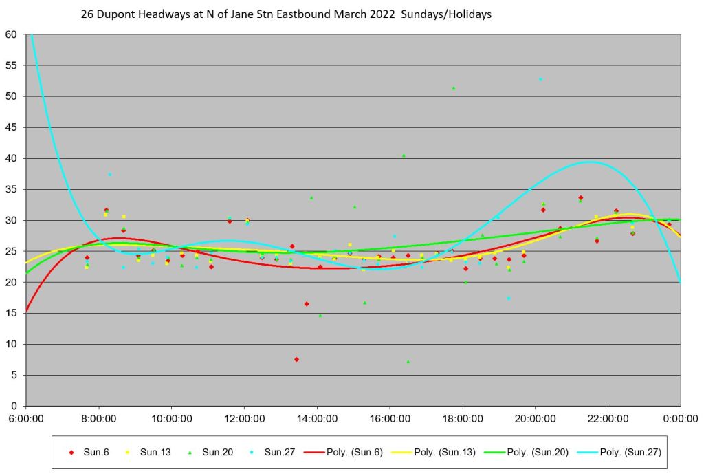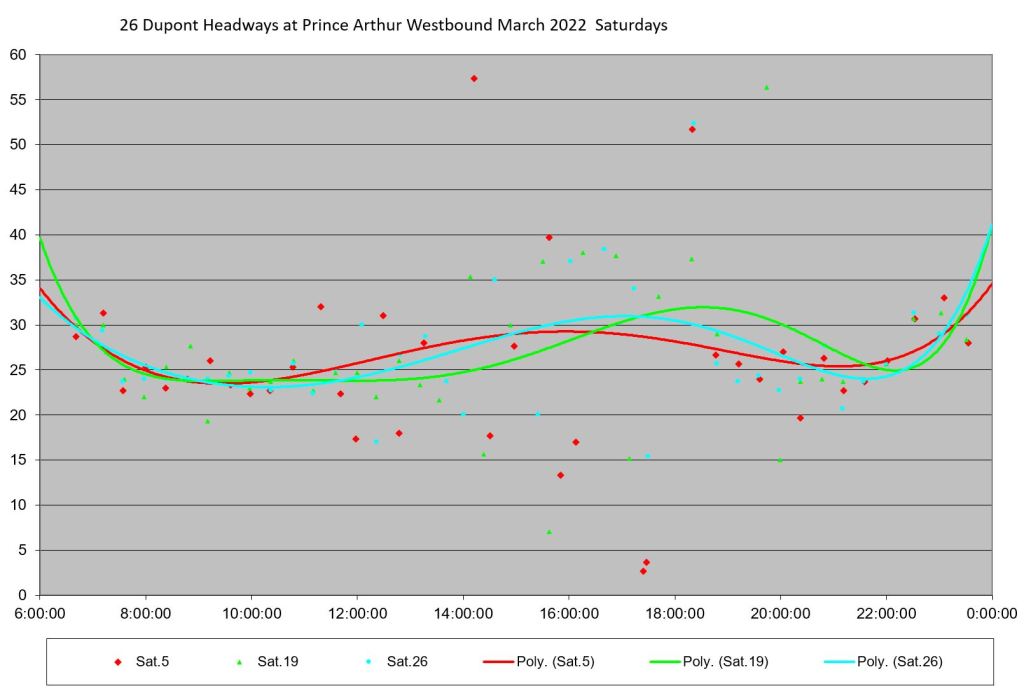 The final two charts show the data for Saturdays and Sundays. Note that the Sunday values are much better behaved with headways staying quite regular throughout the day.