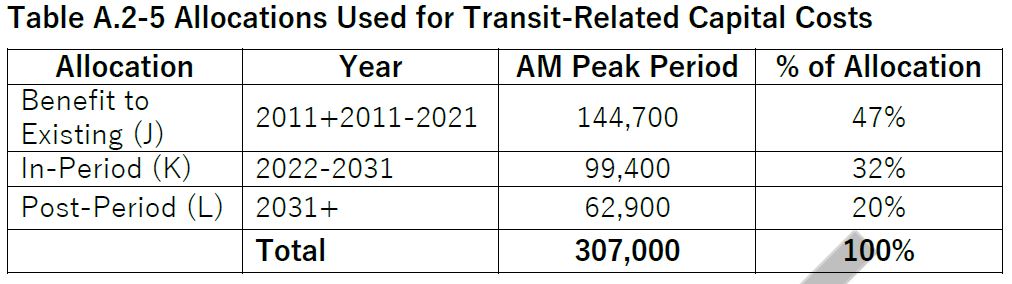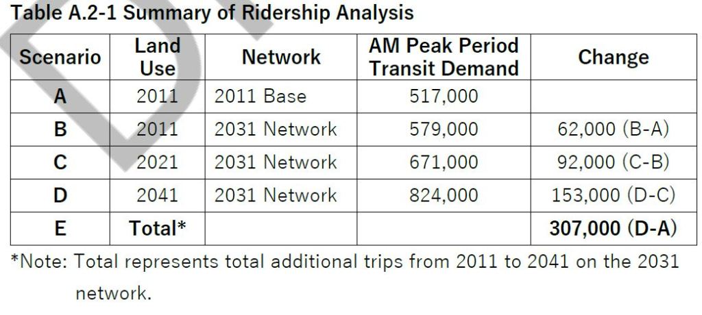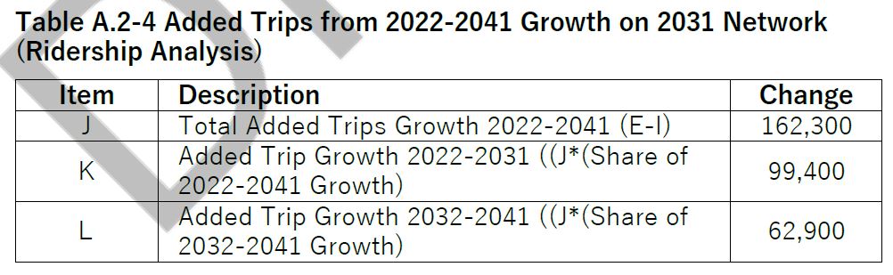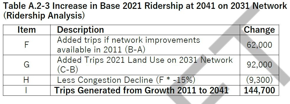 First, the ridership change that would have occurred if the planned network were already in place is calculated. This 144,700 AM peak trips are considered as a benefit to existing riders and developments, and therefore are not due to new developments for the period of the 2022 DC bylaw.