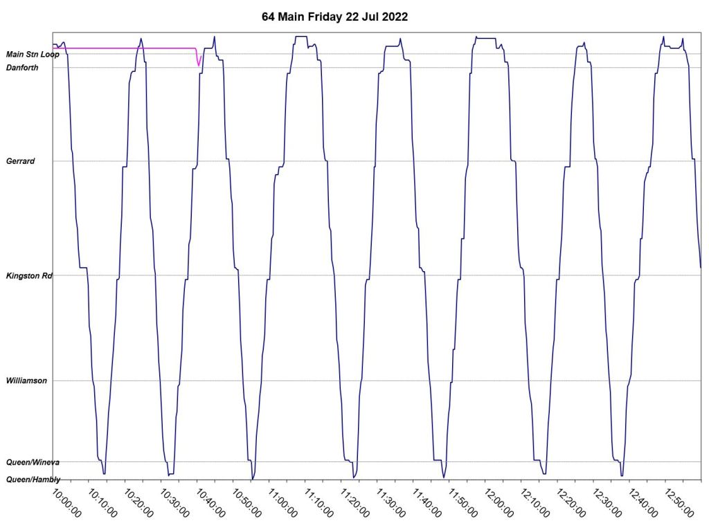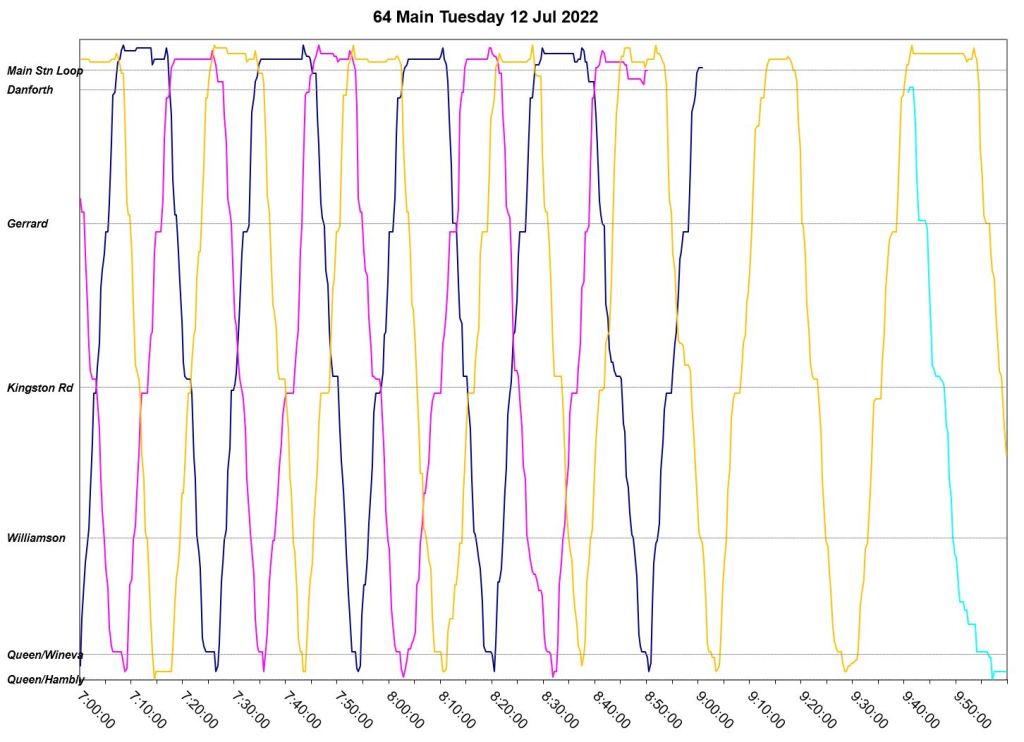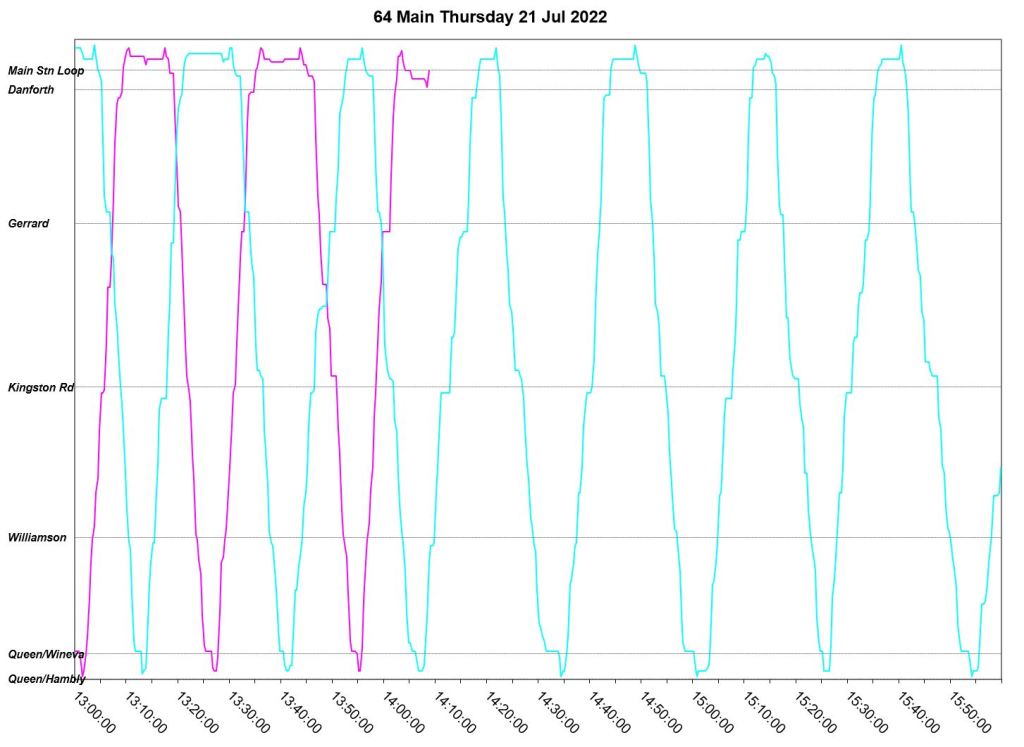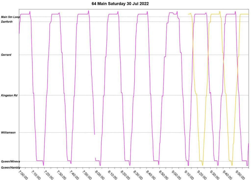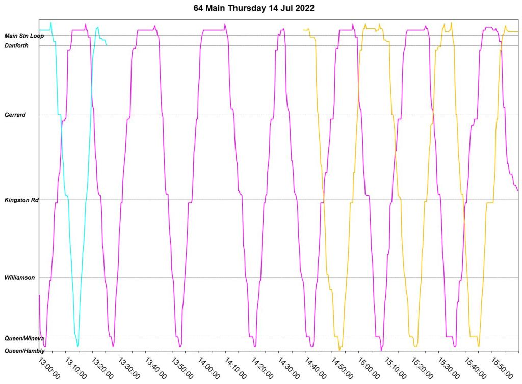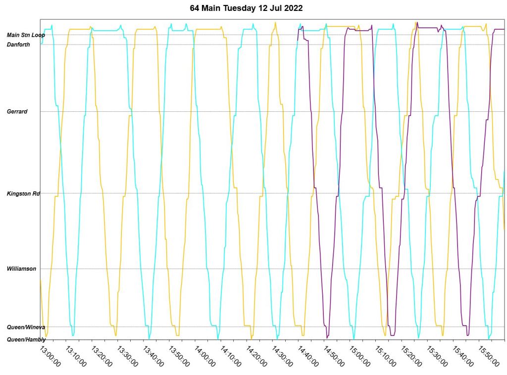 July 12 begins with a three-bus AM peak, but loses two of these after 9am leaving only one in service. A second bus joins in just before 10am, but the two buses run as a pair until noon when a somewhat more reliable, albeit uneven, headway is established. Reason for the missing bus: Fire suppression alarm activated with light flashing. Bus operated private to Birchmount Garage for change off.