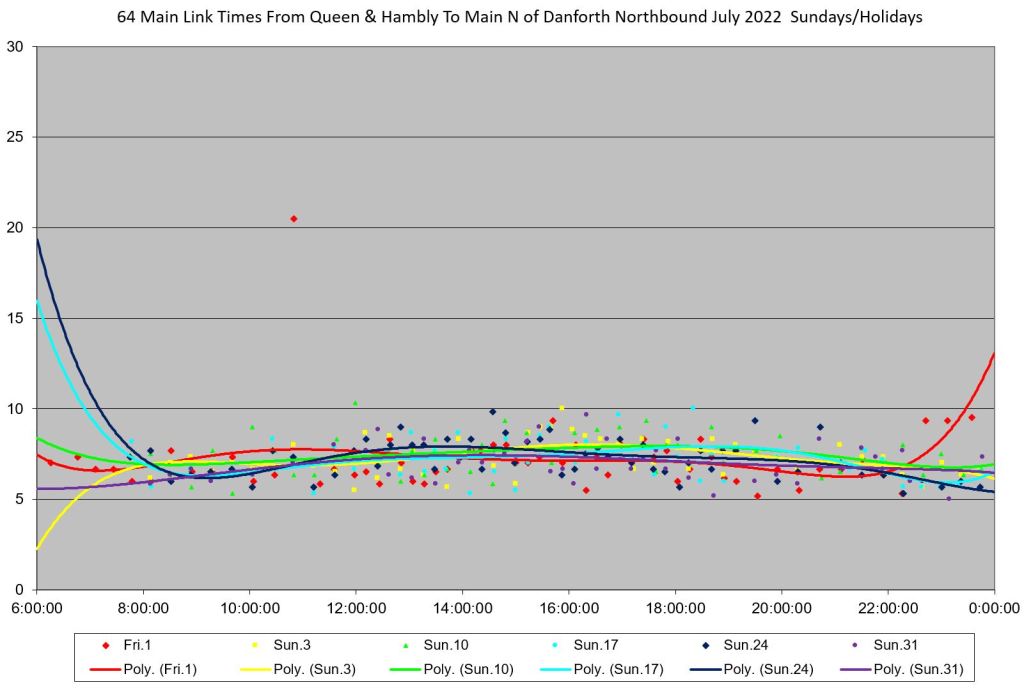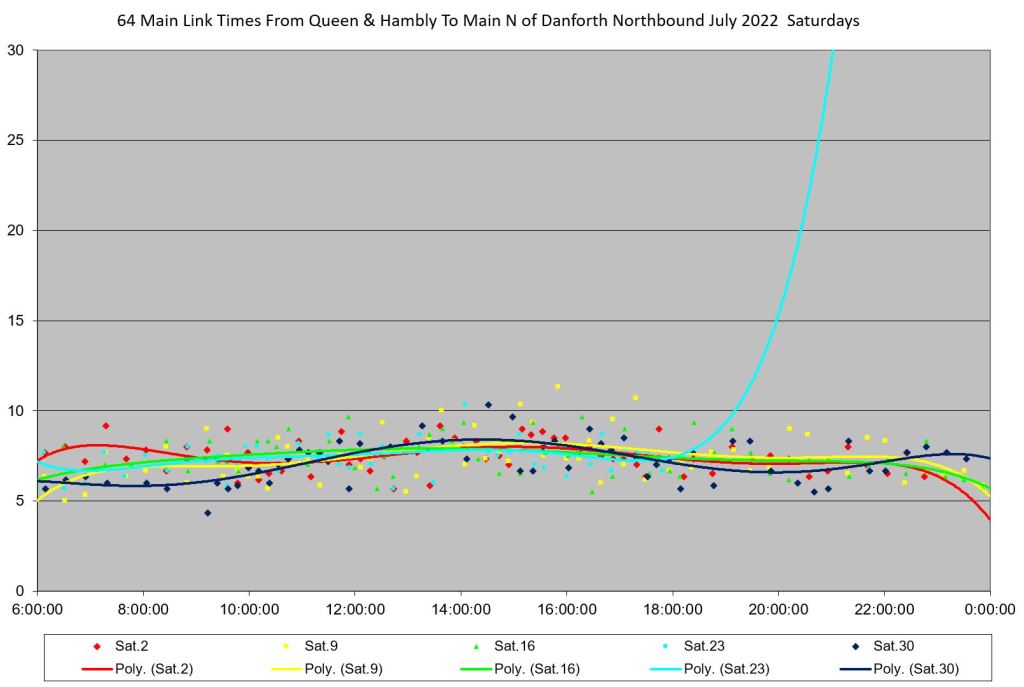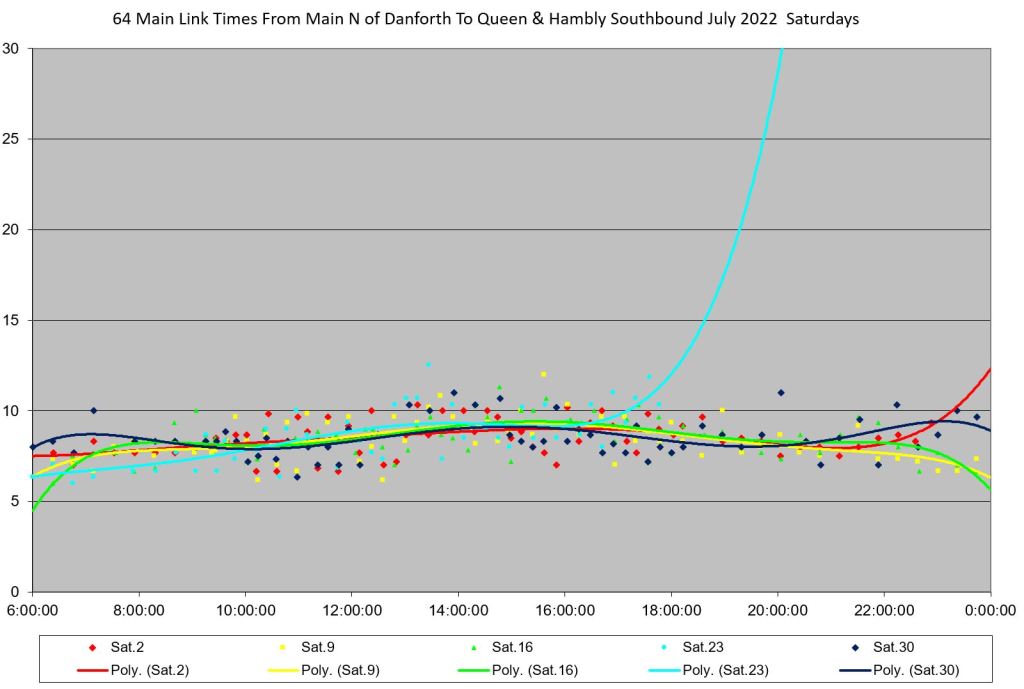 Note that the Beaches Jazz Festival fell on Thursday, July 21 through Saturday, July 23. However, the disruption to service began considerably earlier in the day than the hours when the south end of the route would have been affected. These days are reviewed in more detail later in the article.