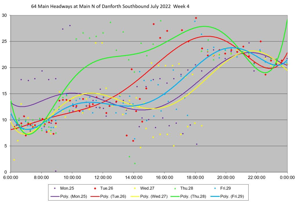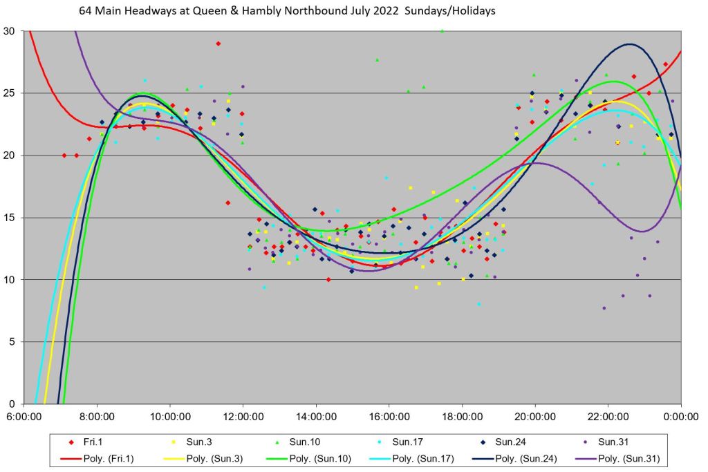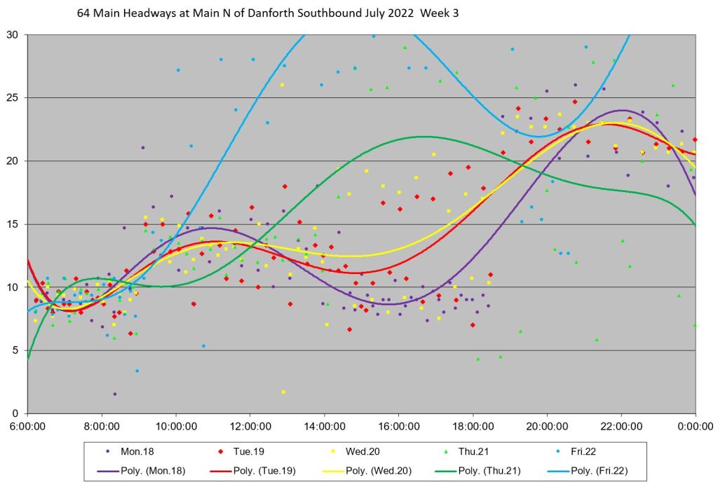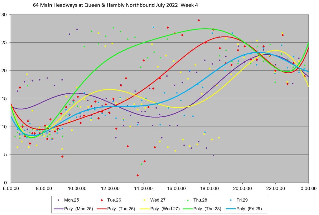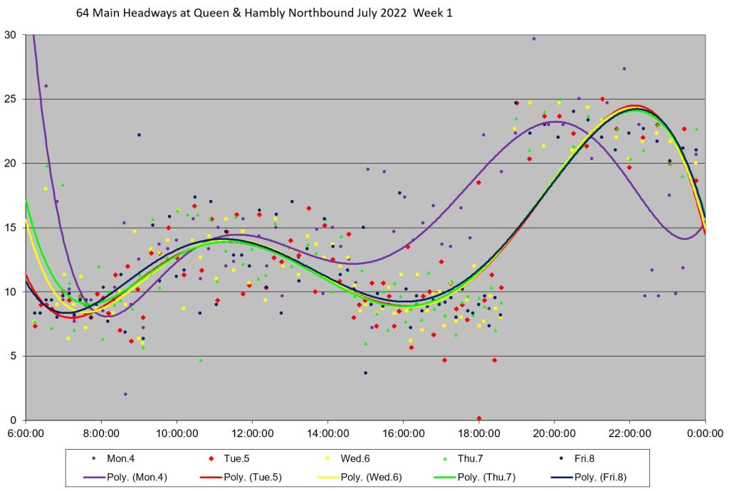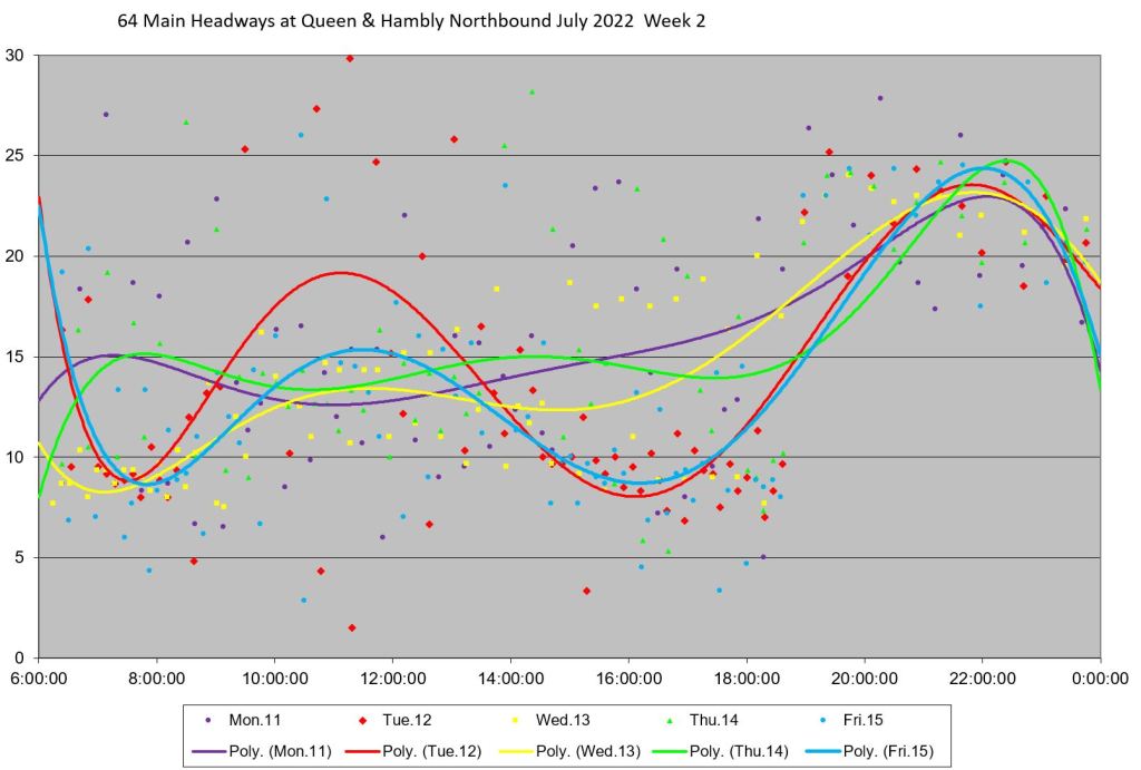Unlike some routes, the day by day headway trends do not all lie in the same path on the charts, and the quality of service varies substantially over the month. Among days with badly-behaved headways are: