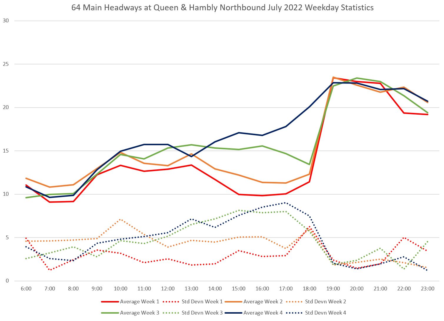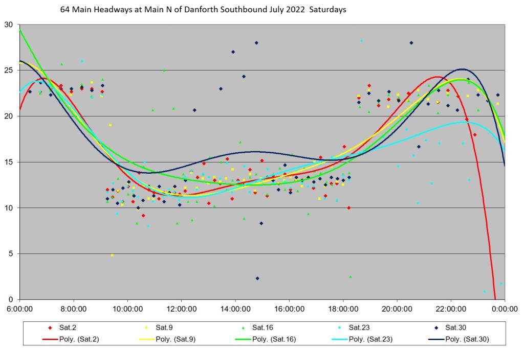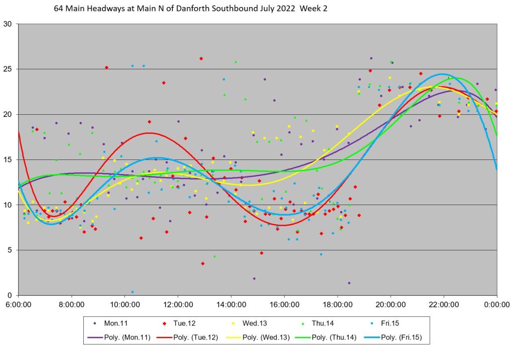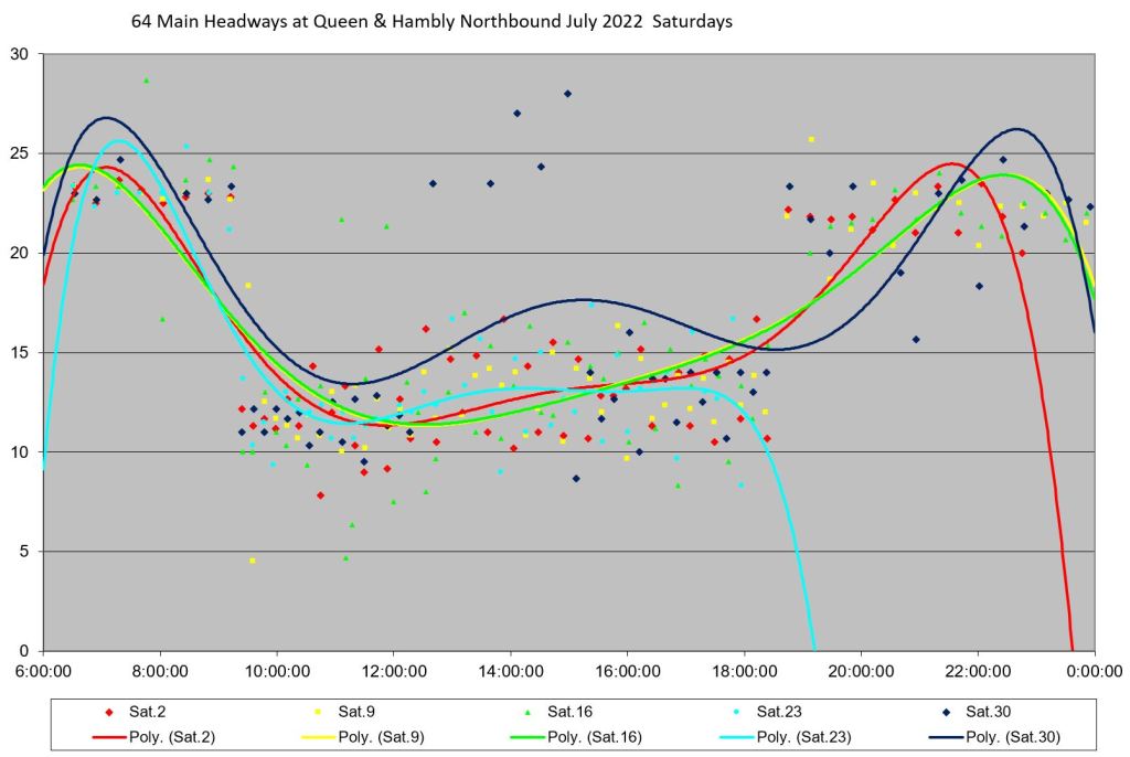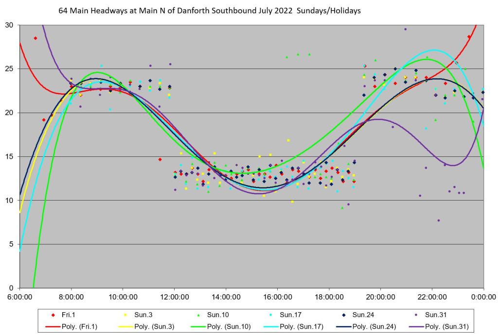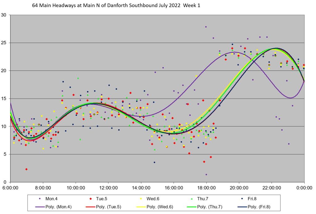 Unlike some routes, the day by day headway trends do not all lie in the same path on the charts, and the quality of service varies substantially over the month. Among days with badly-behaved headways are: