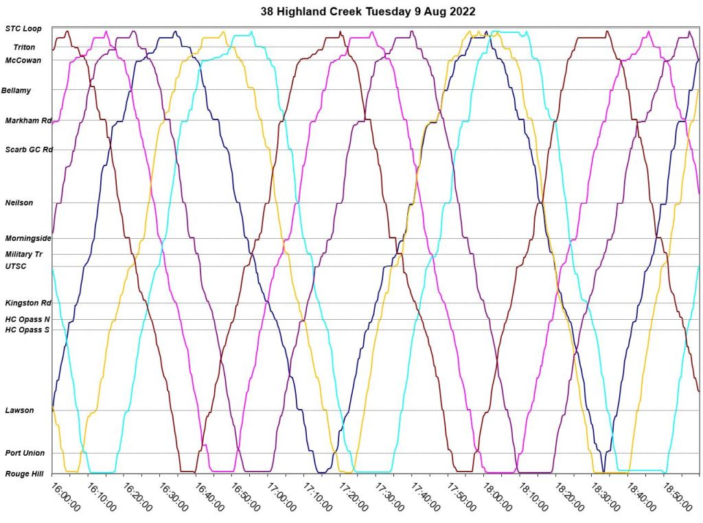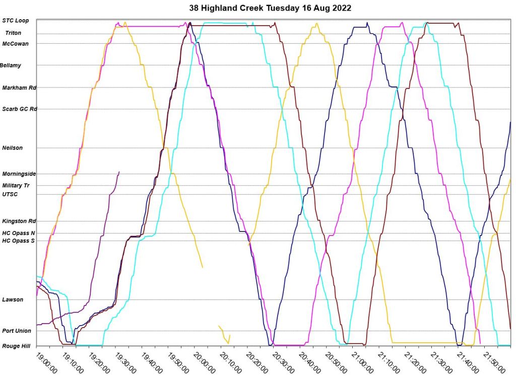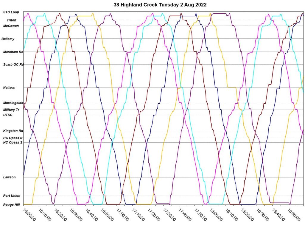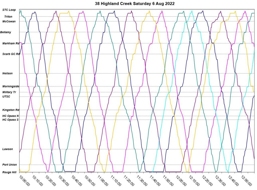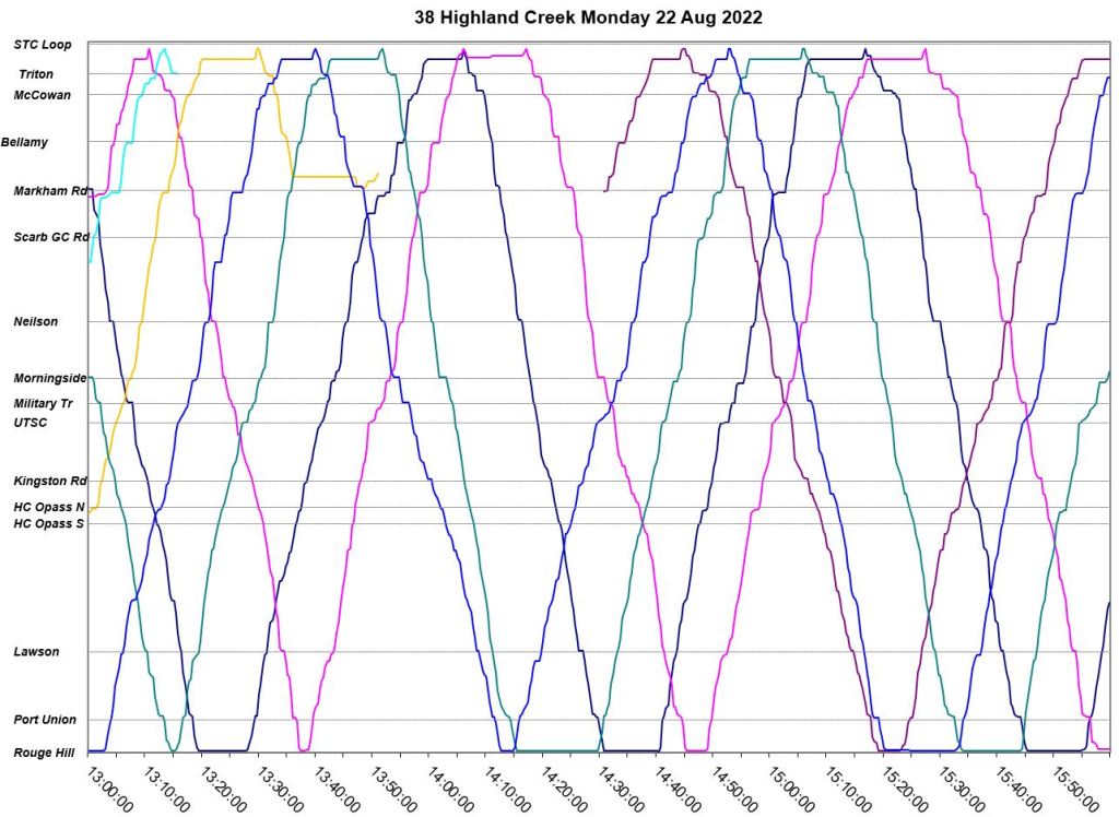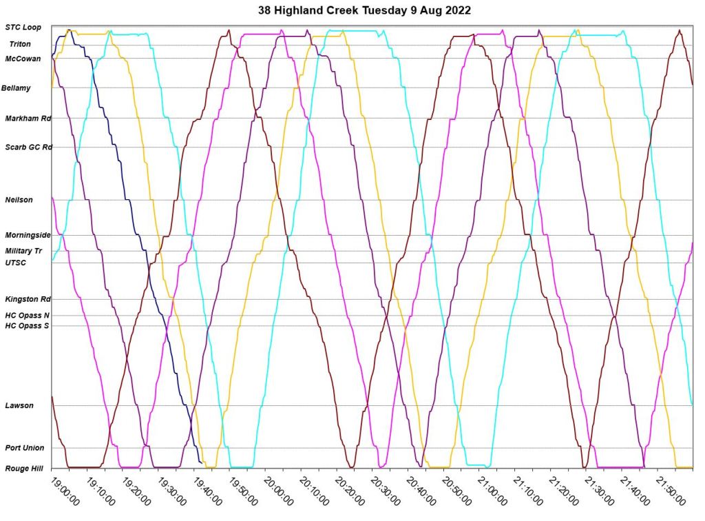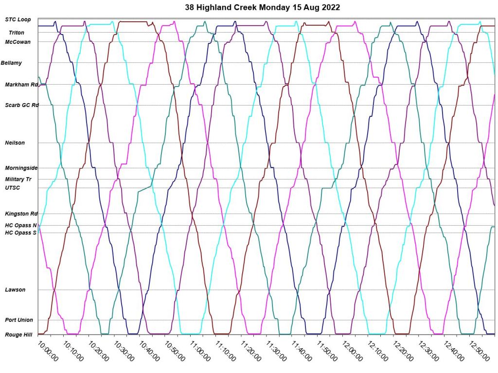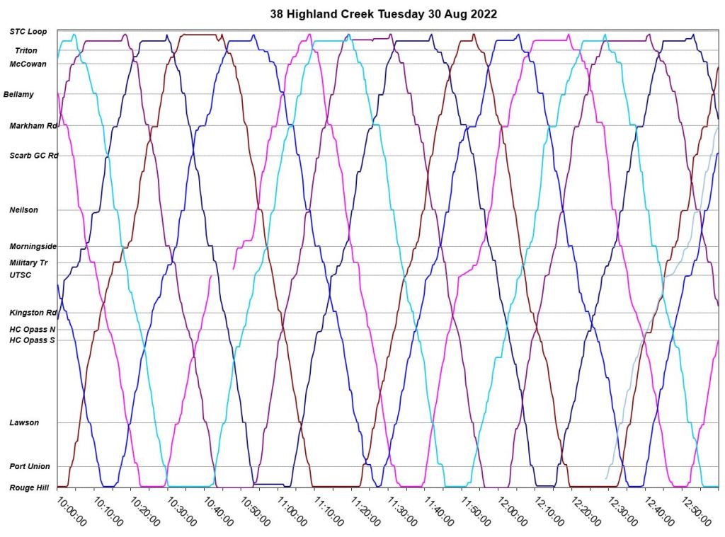 Back on August 20, when I was part of a Twitter thread about lousy service on 7 Bathurst, the day of the TTC’s birthday party at Hillcrest, one person said “I have the same problem on Highland Creek”. When I looked at the tracking data, the result was stunning, and not in a way anyone would like to see.