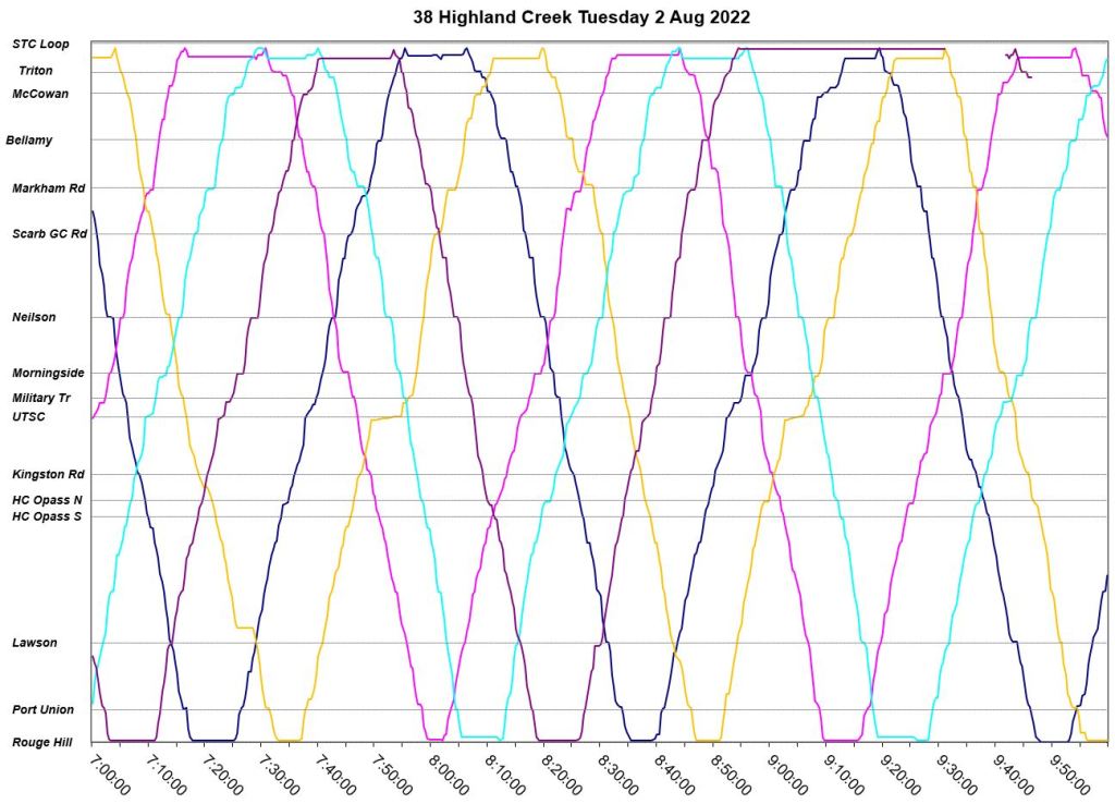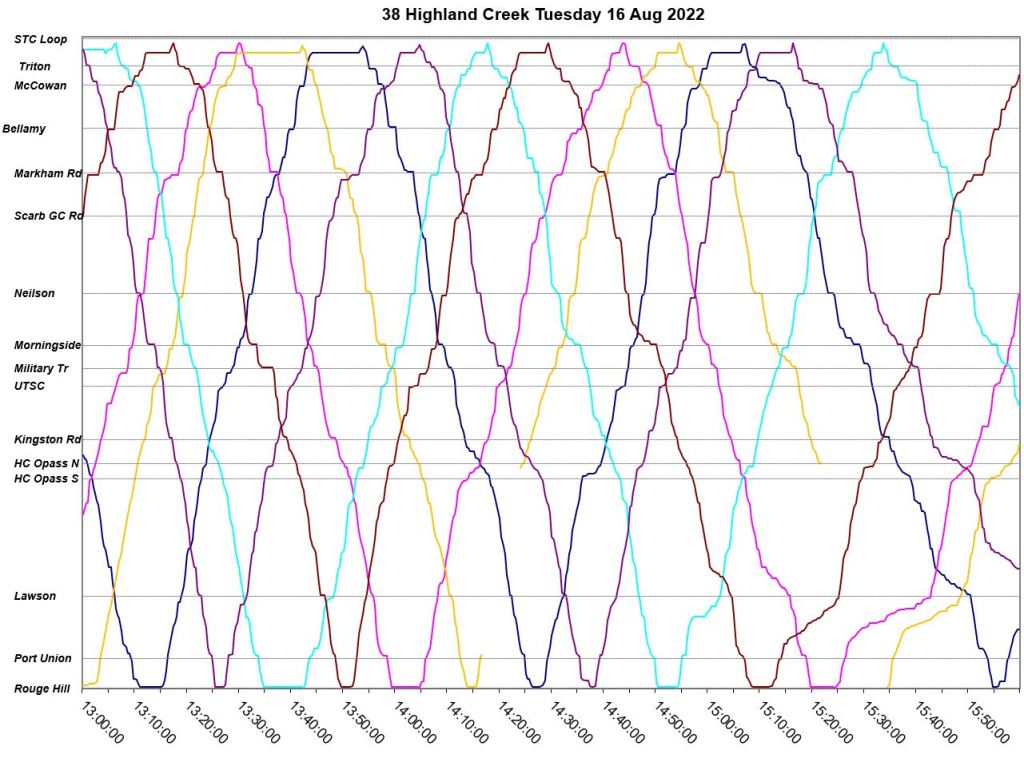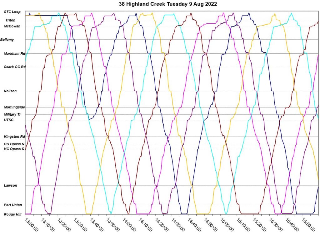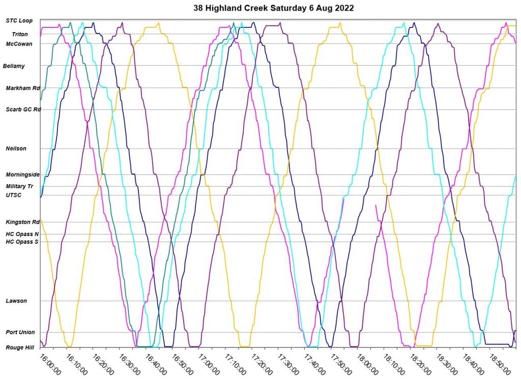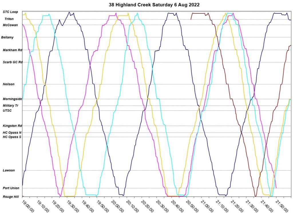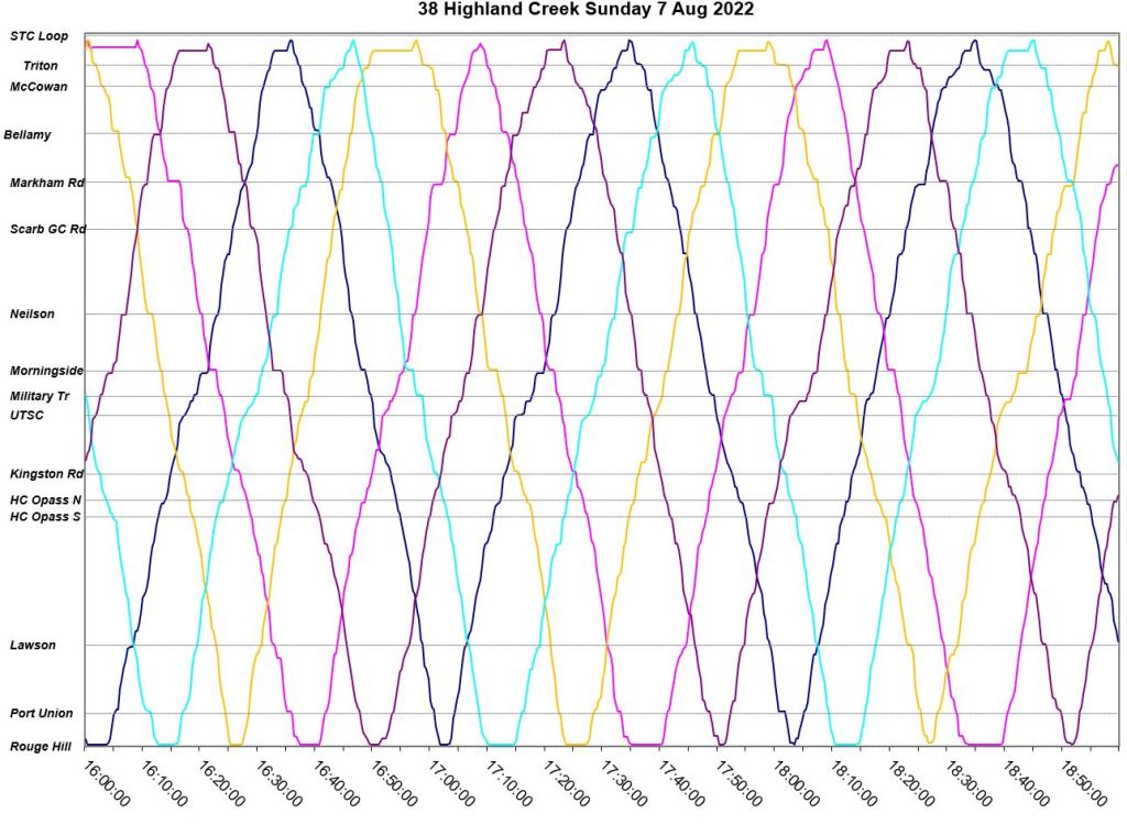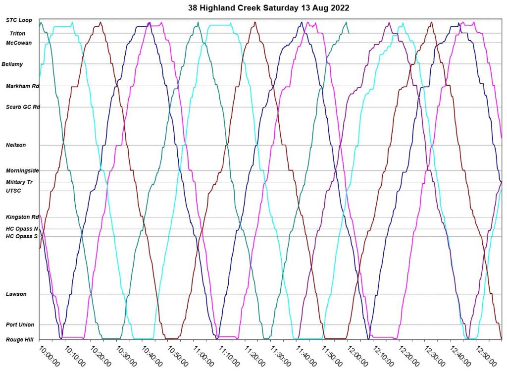 Back on August 20, when I was part of a Twitter thread about lousy service on 7 Bathurst, the day of the TTC’s birthday party at Hillcrest, one person said “I have the same problem on Highland Creek”. When I looked at the tracking data, the result was stunning, and not in a way anyone would like to see.
