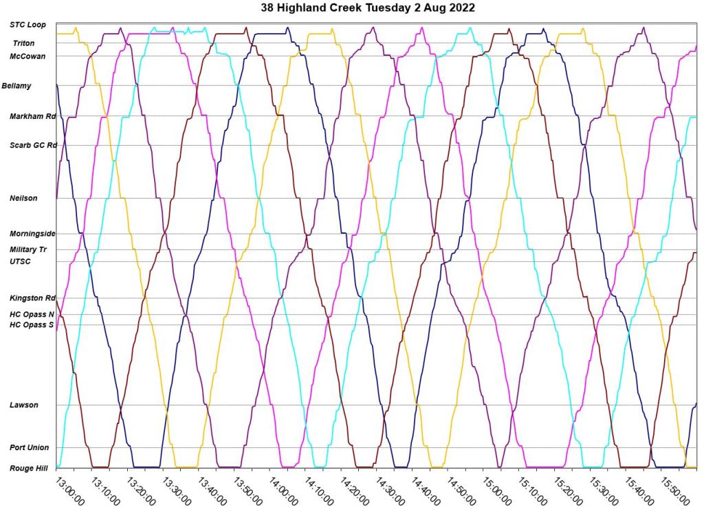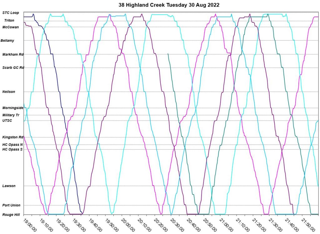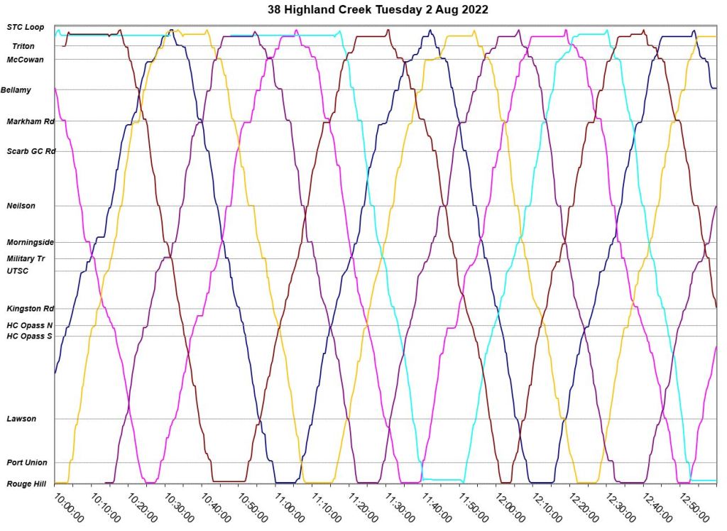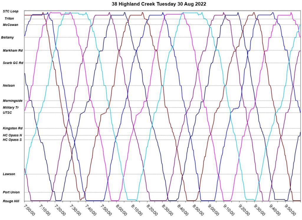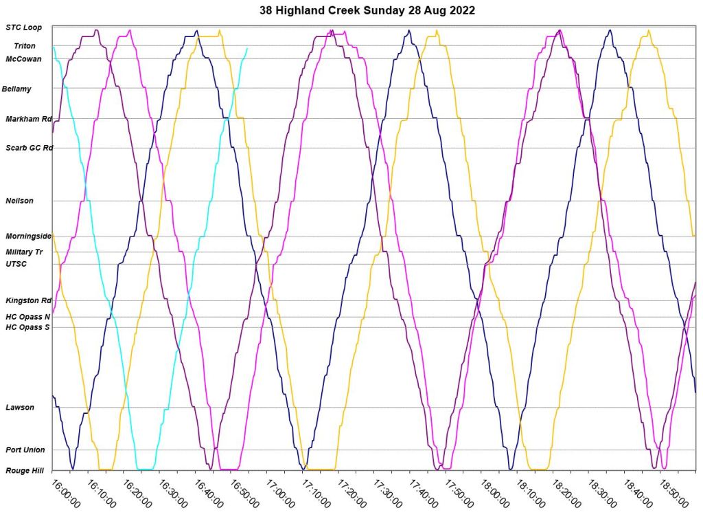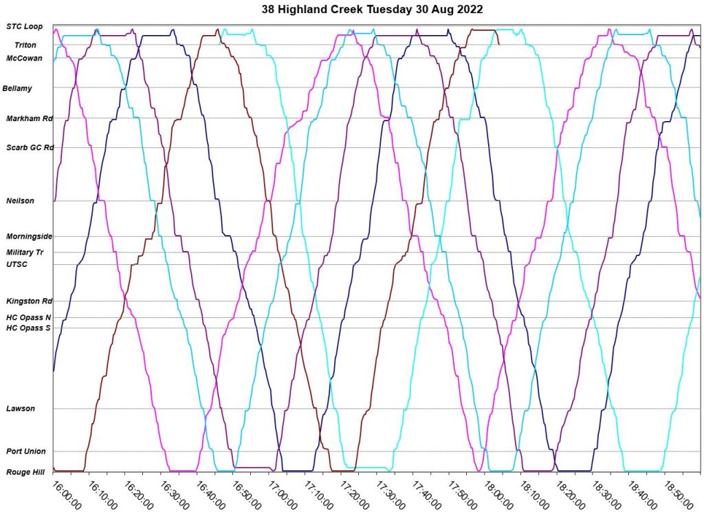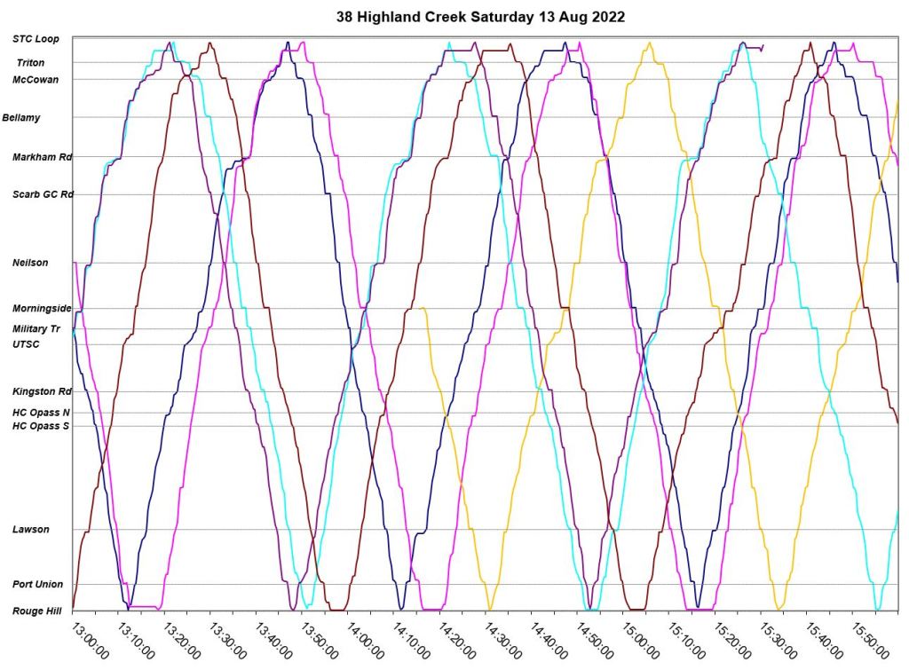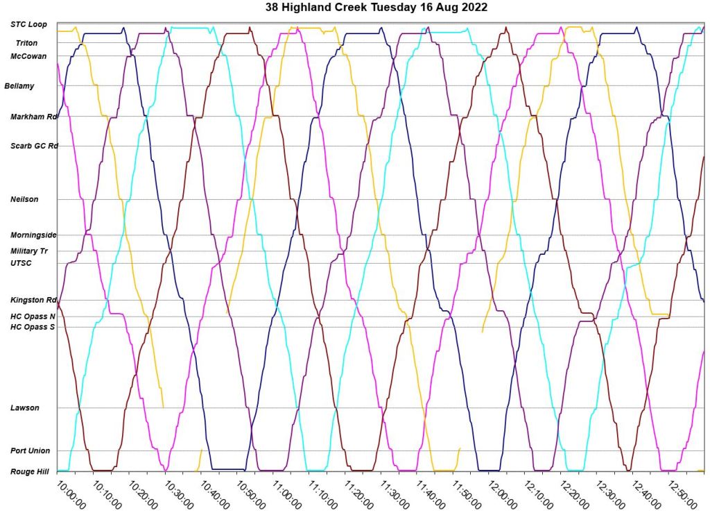 Back on August 20, when I was part of a Twitter thread about lousy service on 7 Bathurst, the day of the TTC’s birthday party at Hillcrest, one person said “I have the same problem on Highland Creek”. When I looked at the tracking data, the result was stunning, and not in a way anyone would like to see.