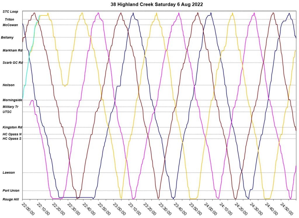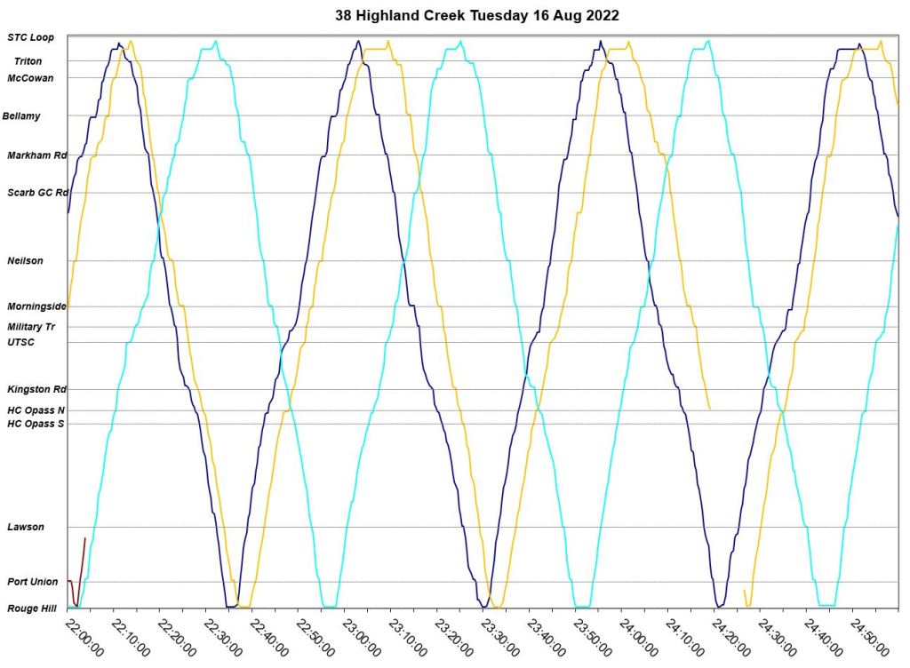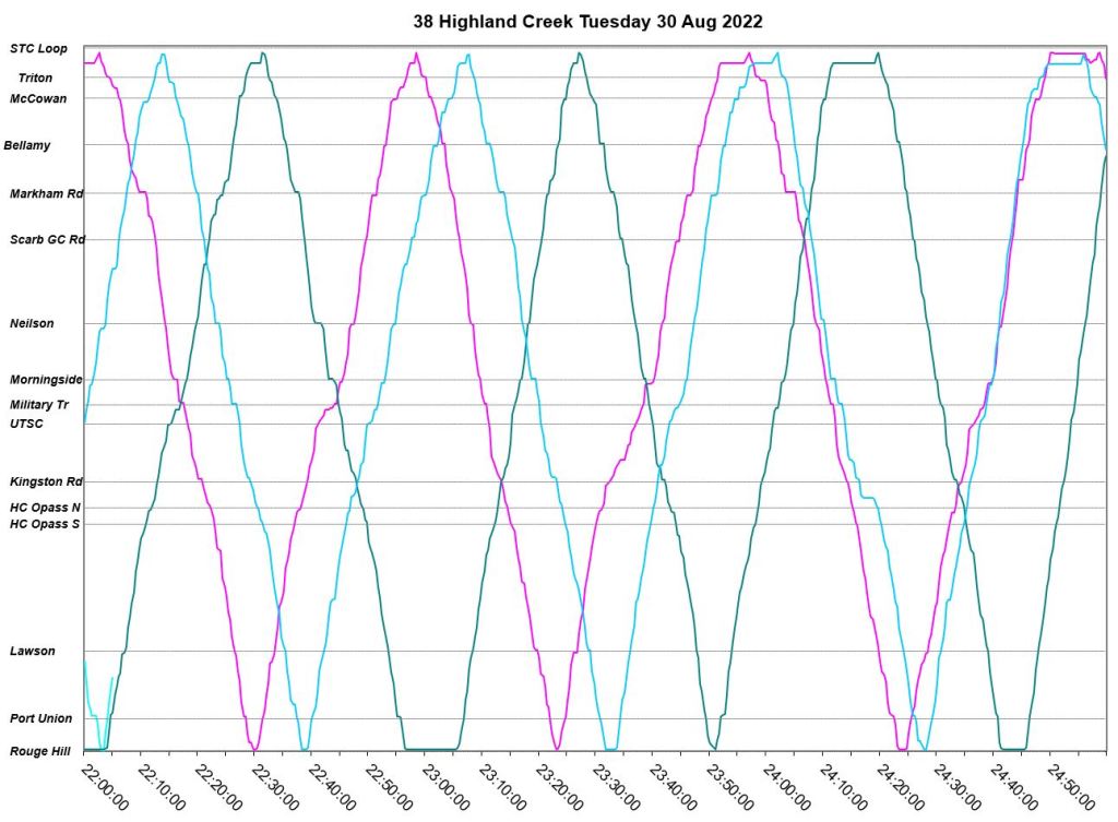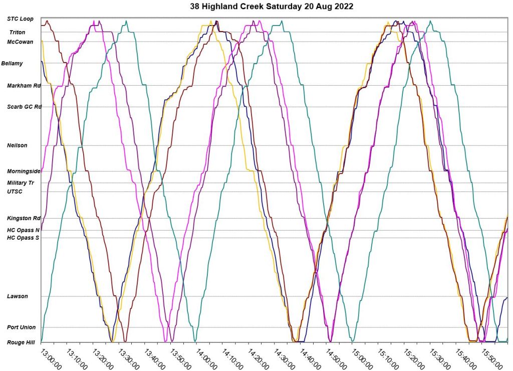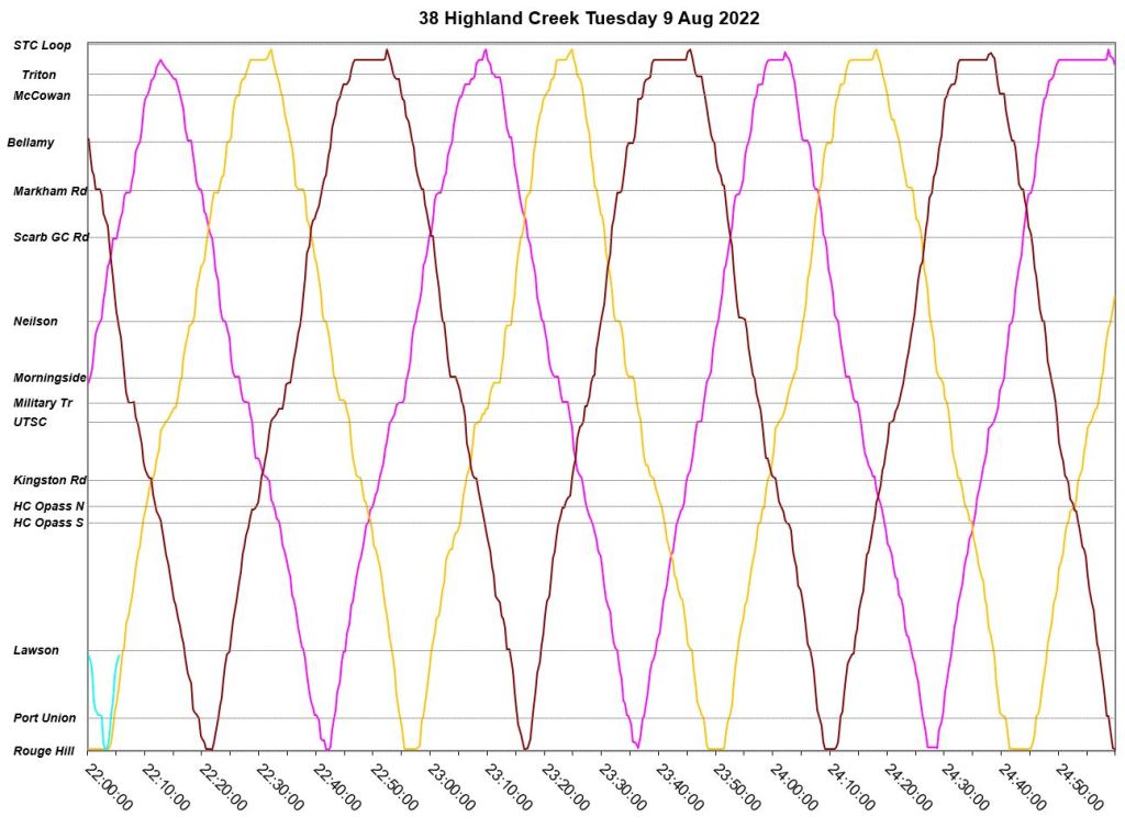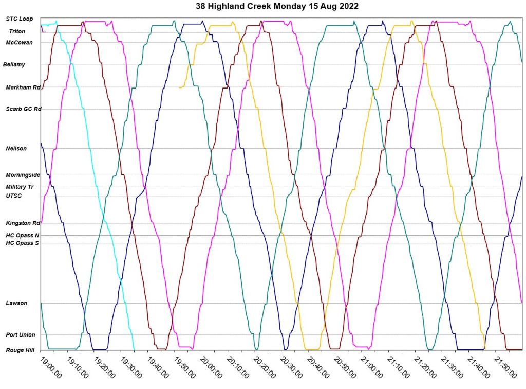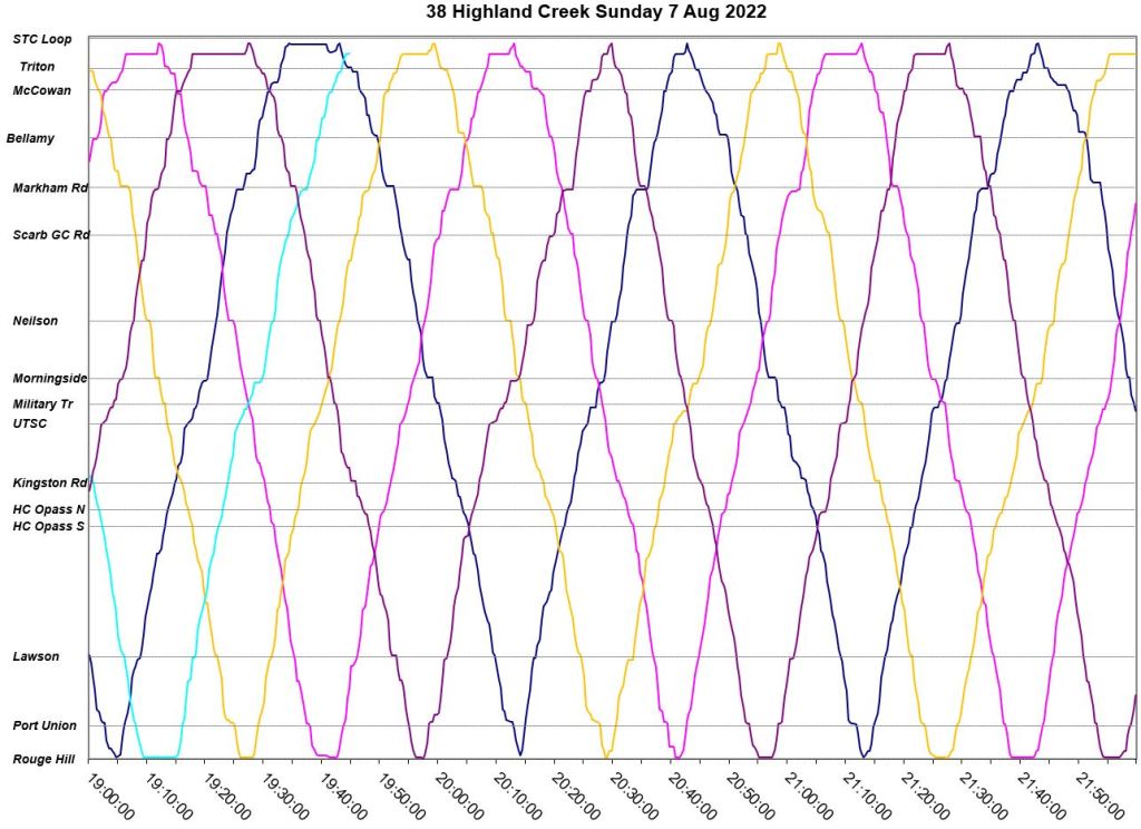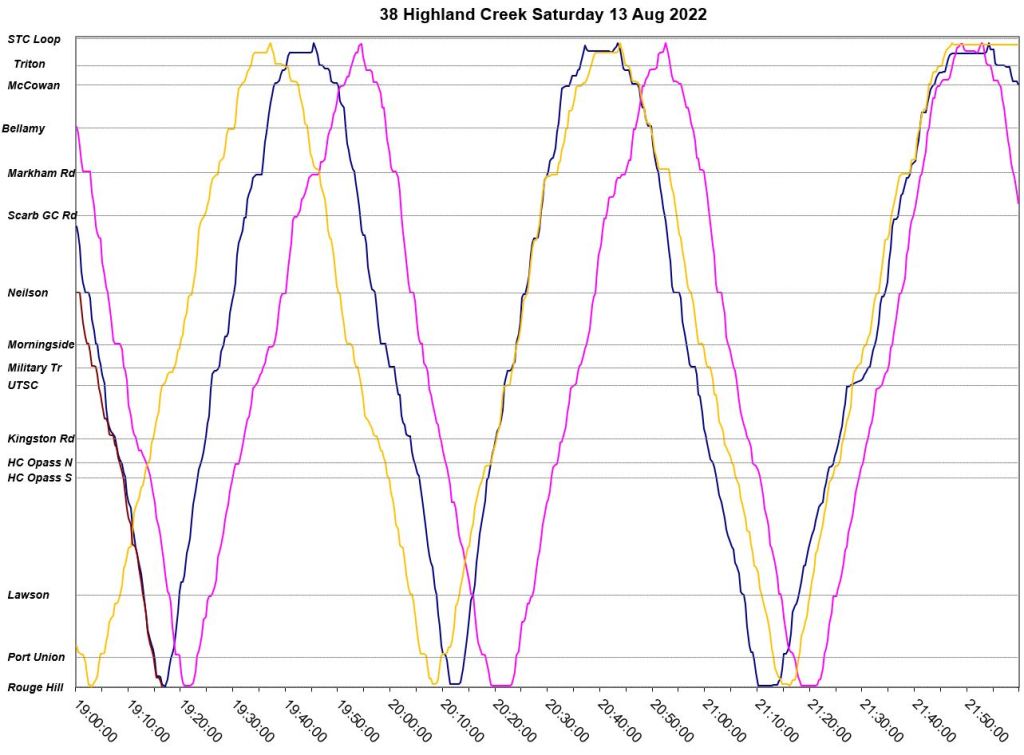 Back on August 20, when I was part of a Twitter thread about lousy service on 7 Bathurst, the day of the TTC’s birthday party at Hillcrest, one person said “I have the same problem on Highland Creek”. When I looked at the tracking data, the result was stunning, and not in a way anyone would like to see.