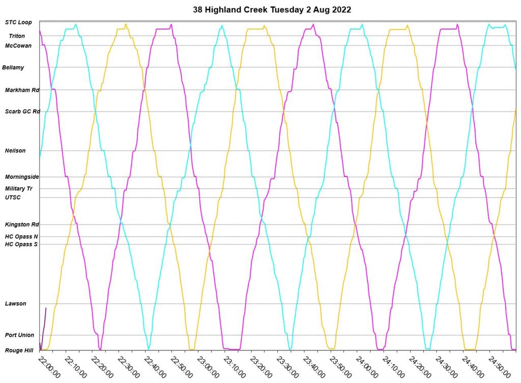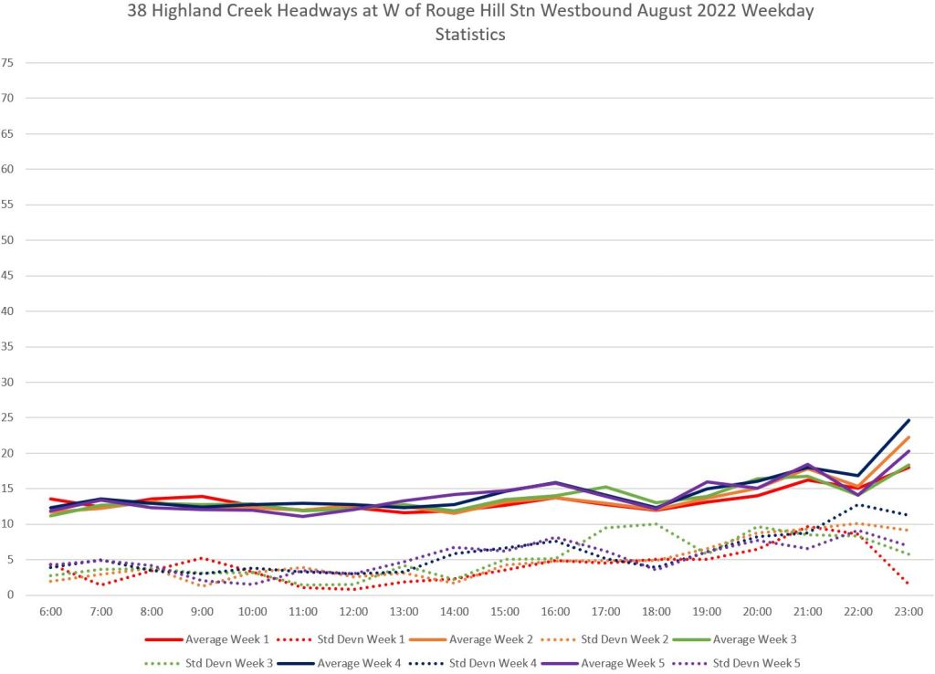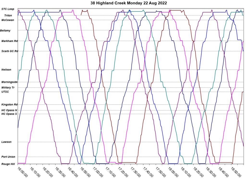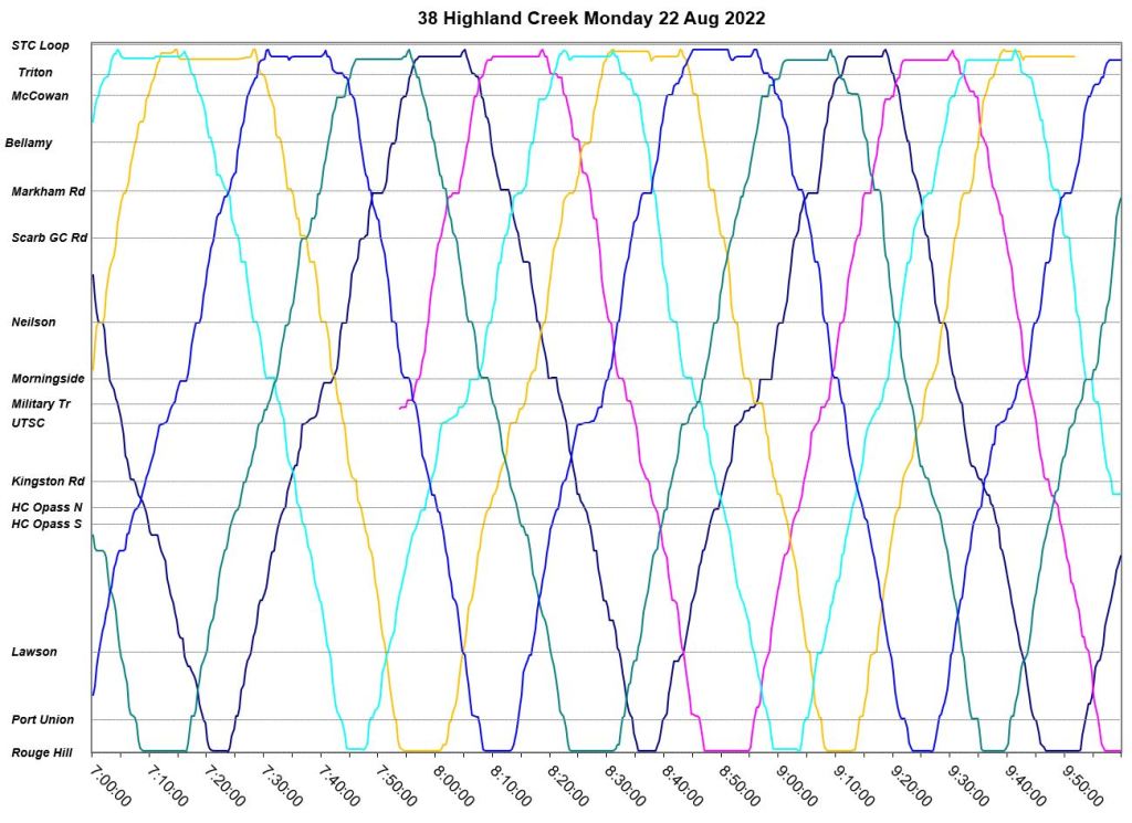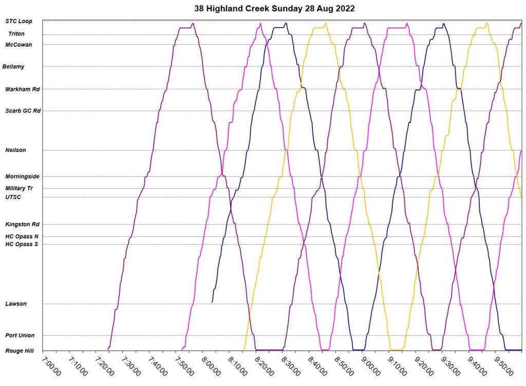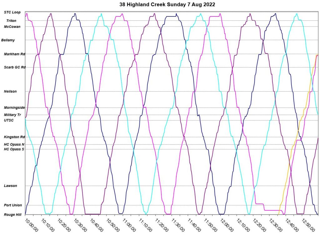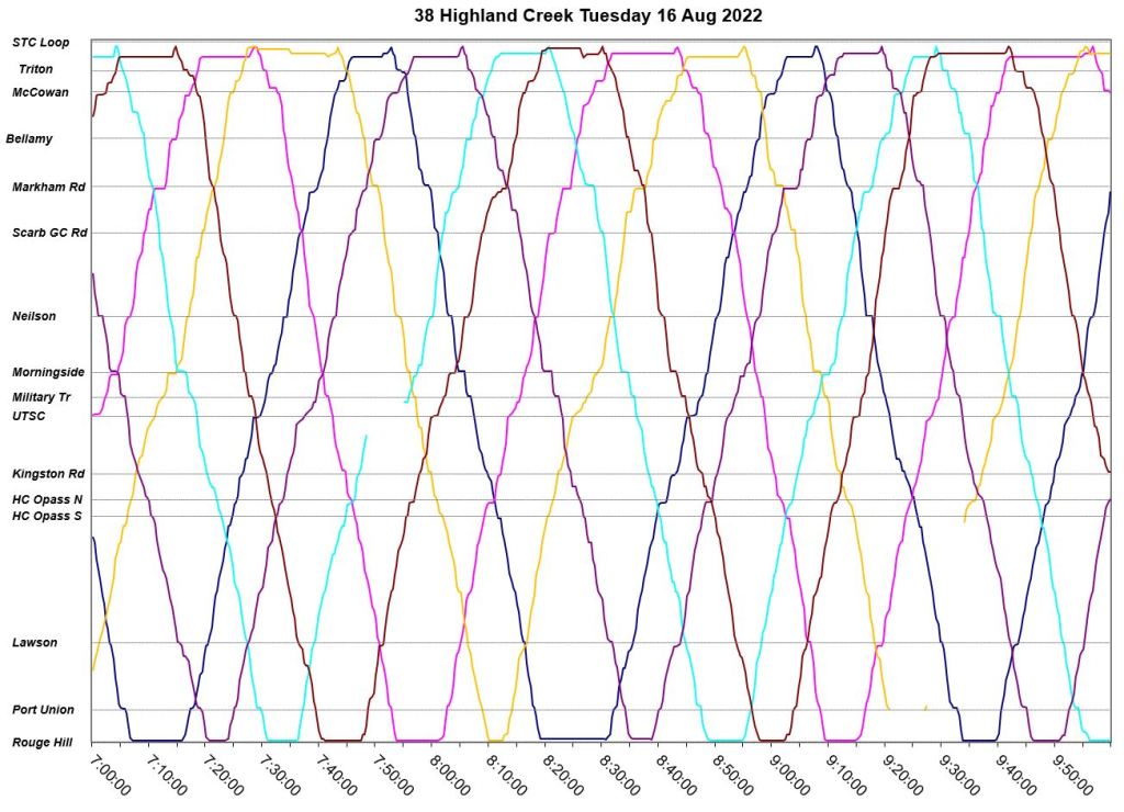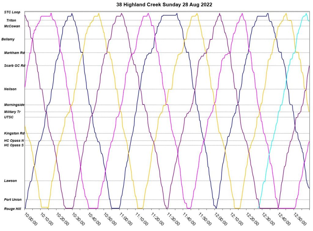 This article reviews 38 Highland Creek for the month of August 2022. The short version is that on weekdays, the route is somewhat unreliable and suffers at time from missing buses, but on weekends, the problems are worse than anything I have seen in my travels through operating stats.