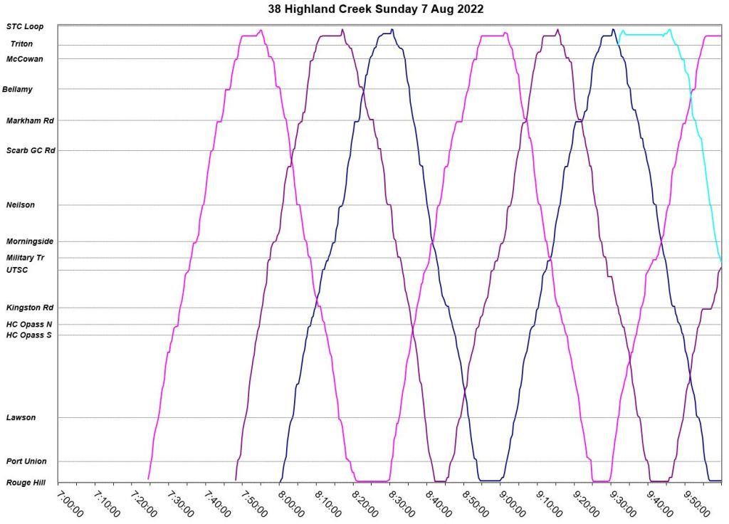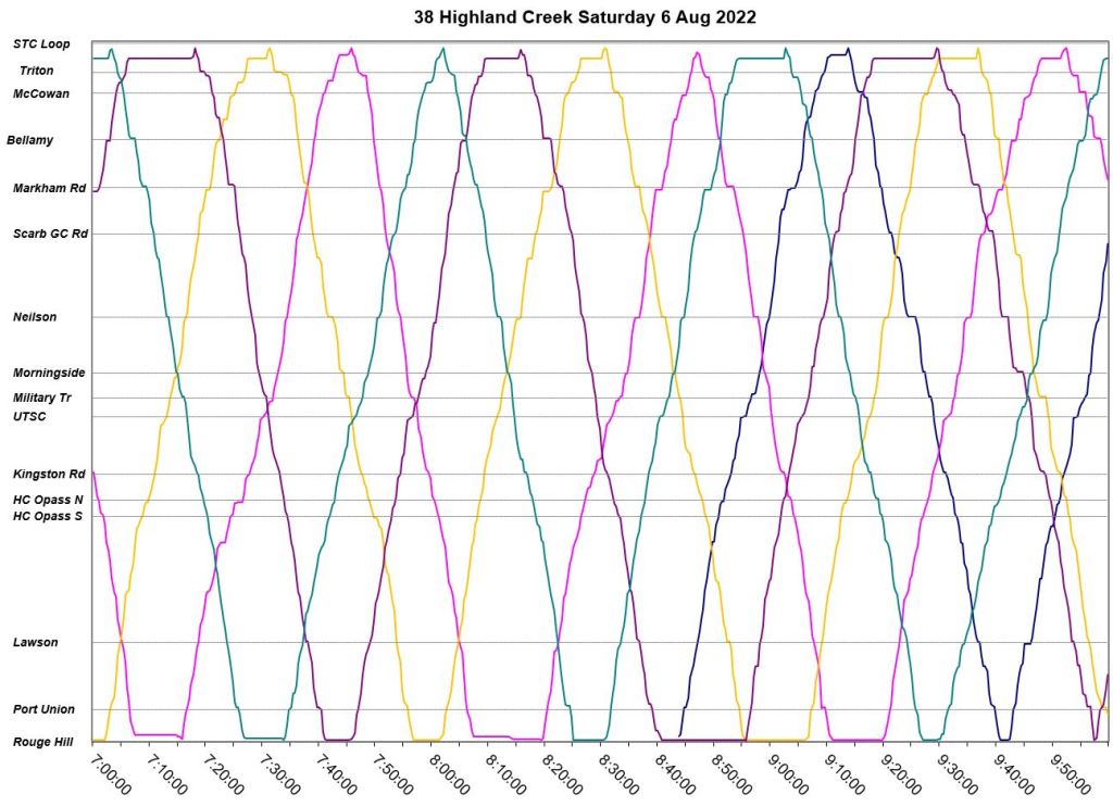 Service on 38 Highland Creek can operate on fairly reliable headways, but is often disrupted, especially on weekends. The primary issues are: