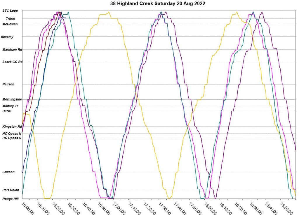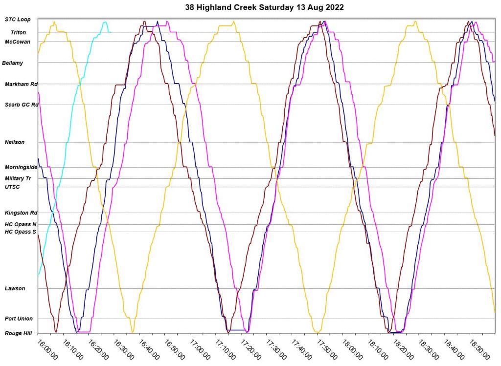 On the westbound trip, one of these, “yellow”, short turns at UTSC and returns to Rouge Hill while the other five buses continue to STC. Of those, two (“brown” and “dark blue”) disappear at STC (probably missed crew changes) while the other three travel back to Rouge Hill leaving STC at about 4:20pm. These three continue to travel in a pack until 6:30pm. Meanwhile, “yellow” which had short turned to split the gap, finds itself back in the parade just before 7pm.