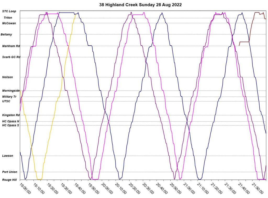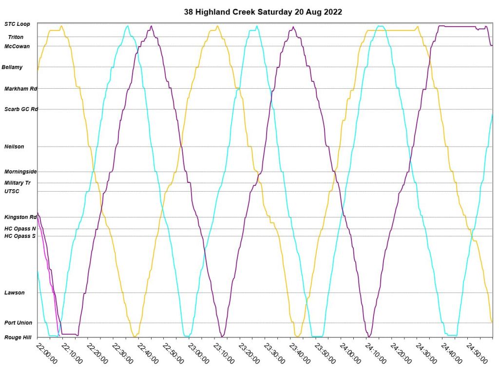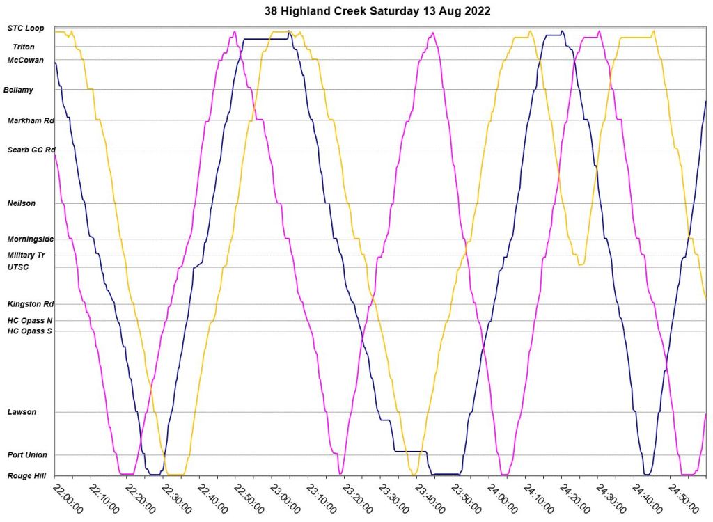 Two more buses (“dark green” and “mauve”) go out of service at 7pm leaving “yellow” and “pink” to run as a pair westbound from Rouge Hill GO. “Yellow” short turns at Markham Road while “mauve” (which has reappeared) and “pink” run east as a pair. It does not take long for the trio to meet up again at UTSC.