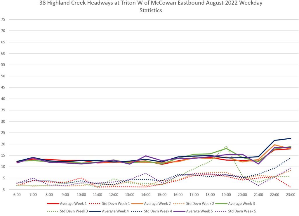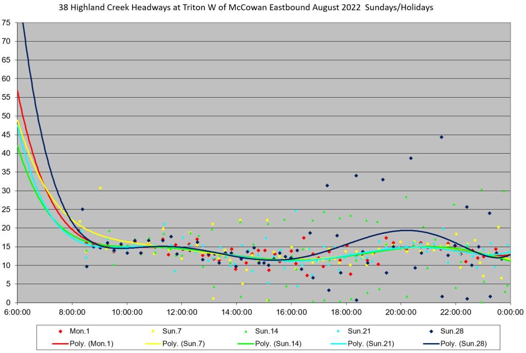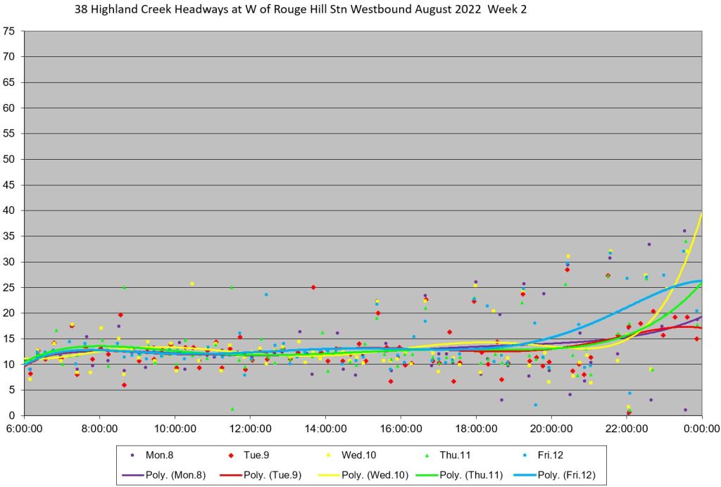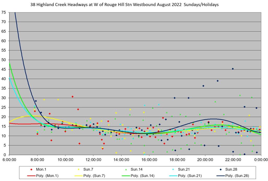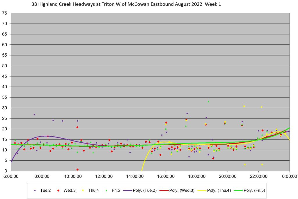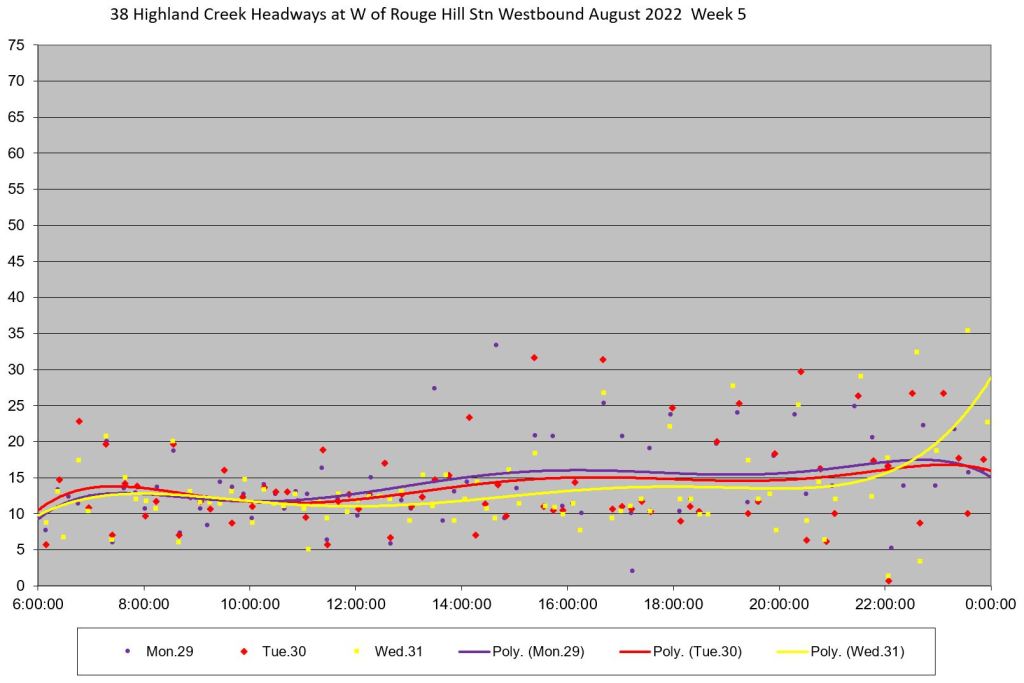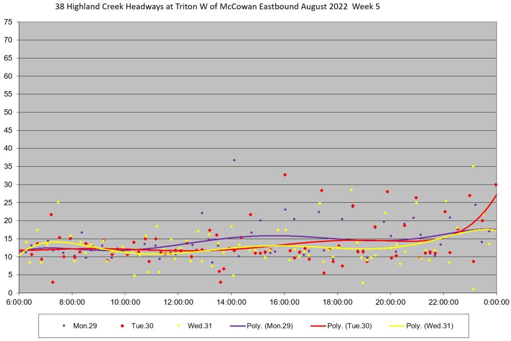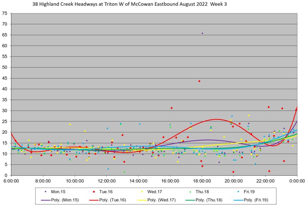 In Week 3, the trend line is pulled away from the scheduled/average values by some very wide headways on Monday and Tuesday August 15 and 16.