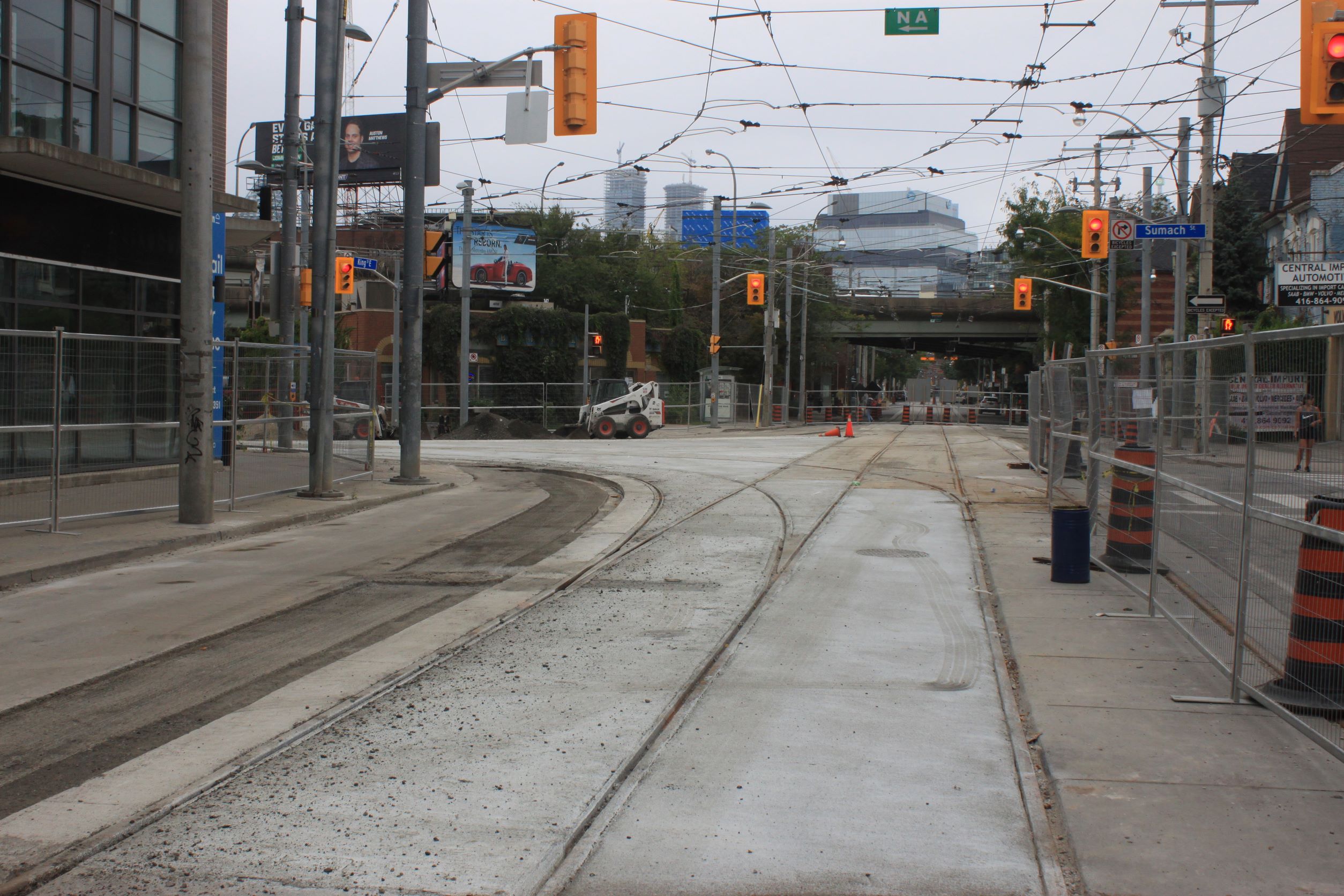 Looking south on Sumach from King: installation of the new wheel greaser on the northbound track under the bridge is in progress.