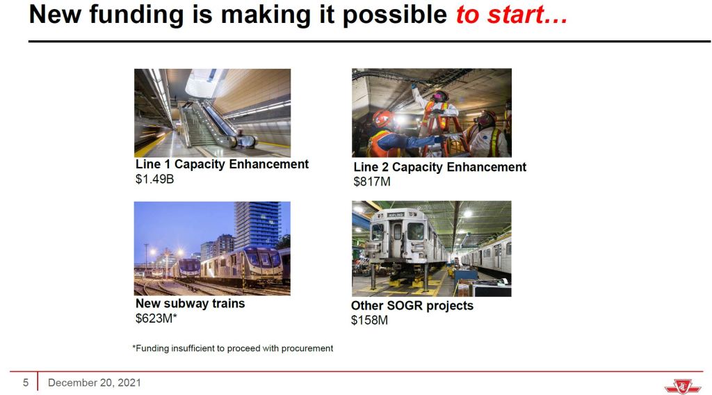 The TTC has acquired some capital funding, albeit nowhere near enough, from Toronto’s “City Building Fund”. This is an additional property tax increase that will build in over time to support borrowing on the TTC’s behalf (part of the fund will also be used to address the Toronto Housing maintenance backlog). Among the fully funded projects (left below) is ATC for Line 2. Some of the money will fund other projects (right below), but not completely.