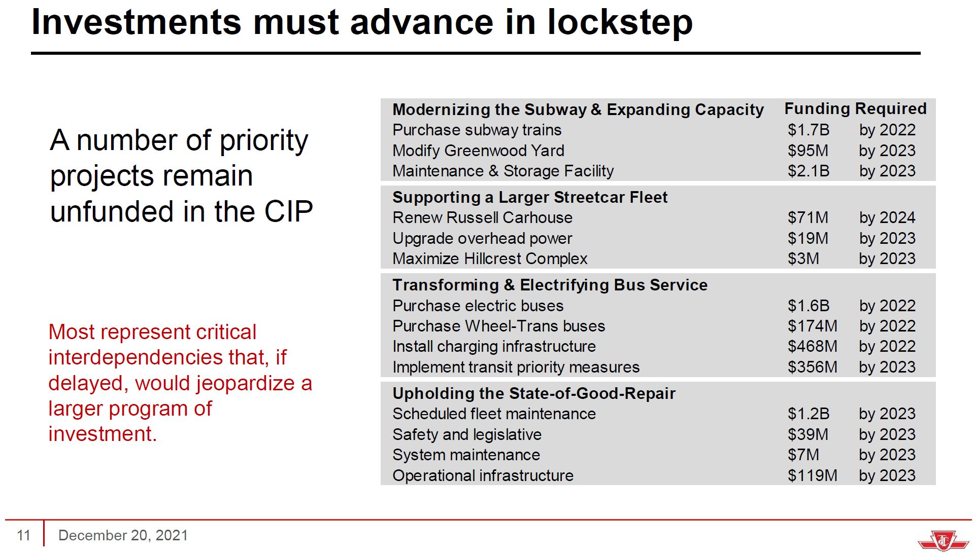 This plan requires a lot of funding that the TTC still does not have, action to launch procurement of long lead time rolling stock and infrastructure, and a level of project co-ordination for which the TTC is not particularly noted.