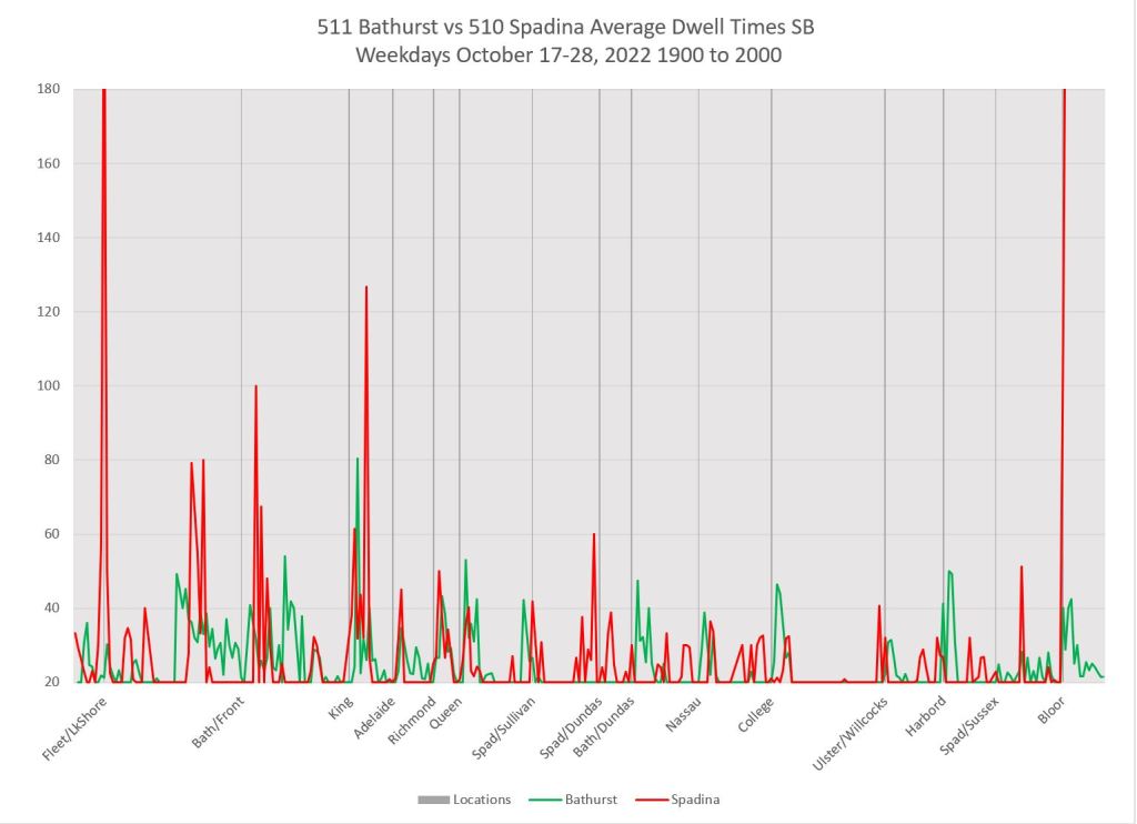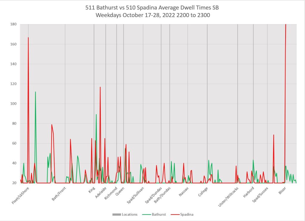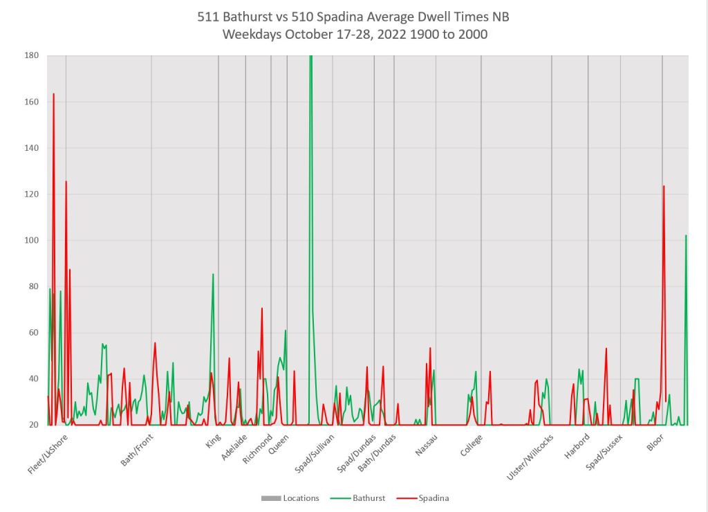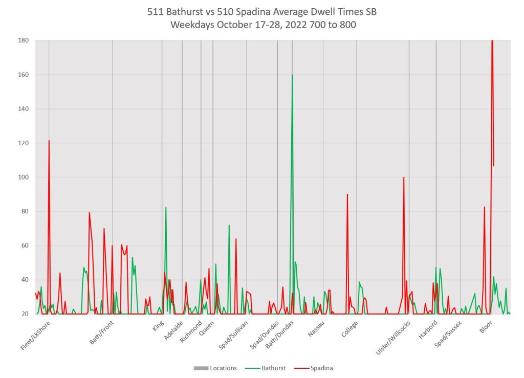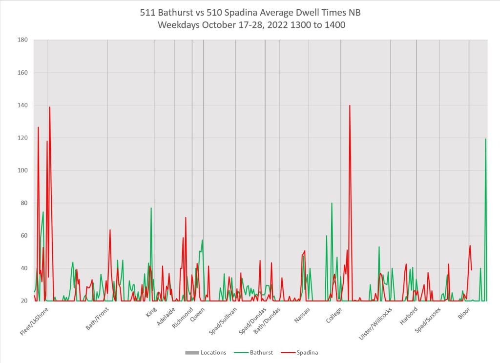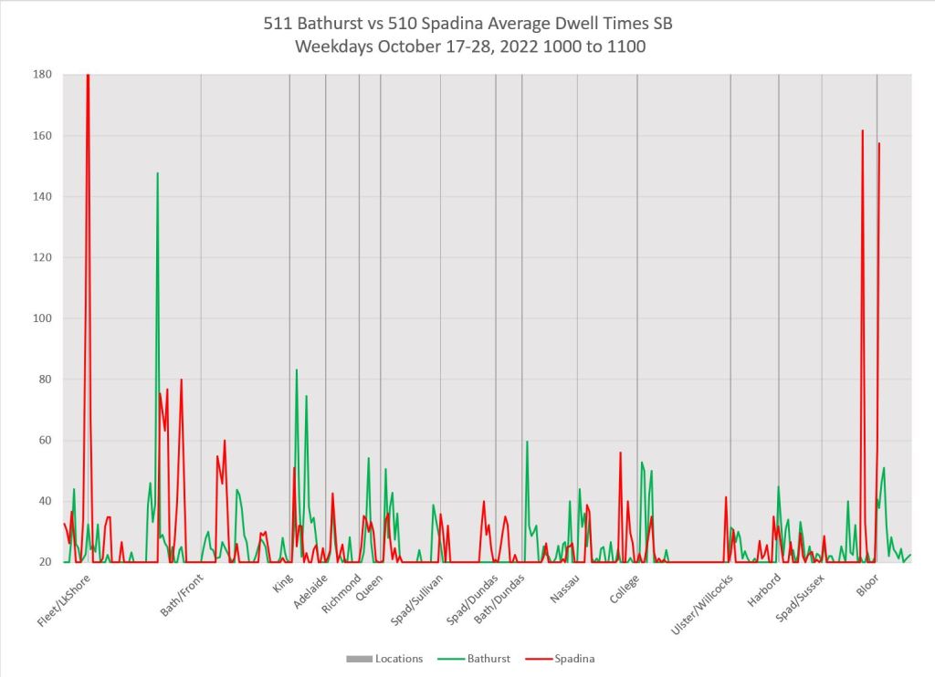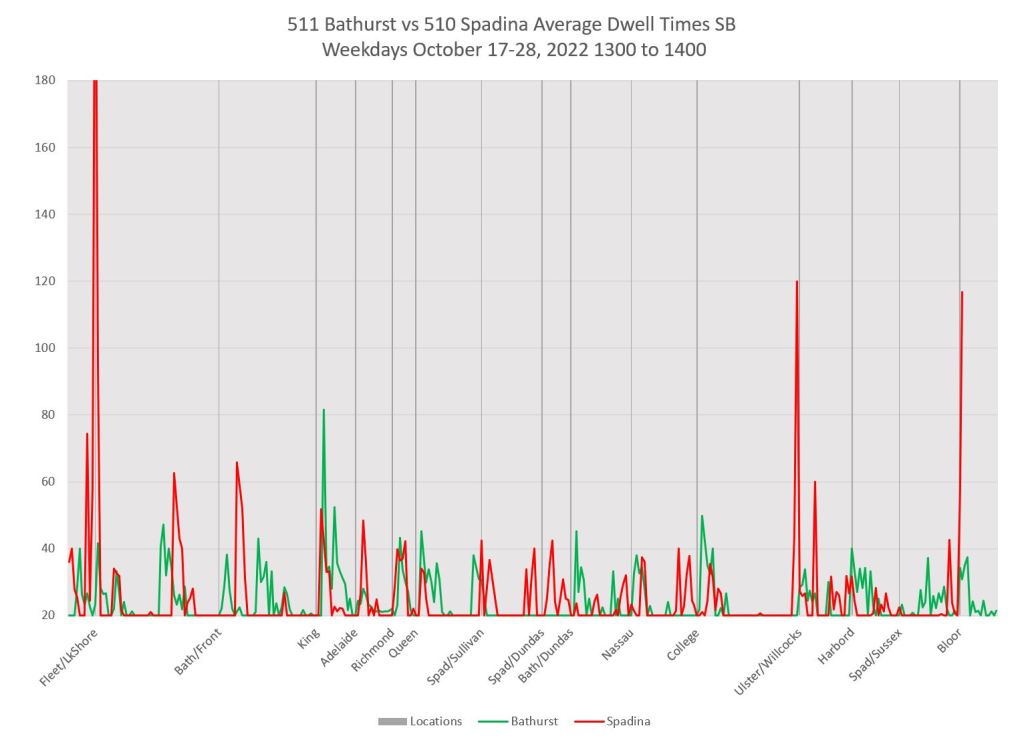 The charts show the major stopping locations clearly including the difference between nearside stops on Bathurst (green) and farside stops on Spadina (red). This also shows the contribution of traffic signals to delays on Spadina where the time spent waiting for a green signal can be as high as the time serving the farside stop.