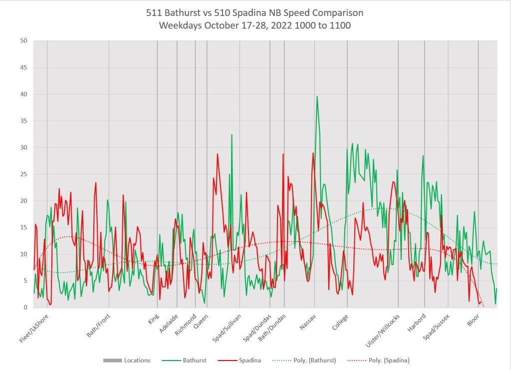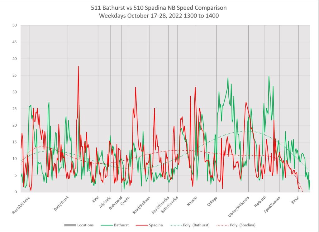 The charts in this section compare operating speeds for Spadina and Bathurst cars on weekdays during the last two weeks of October 2022. This period was chosen to avoid data from earlier in the month when construction affected the south end of Spadina.