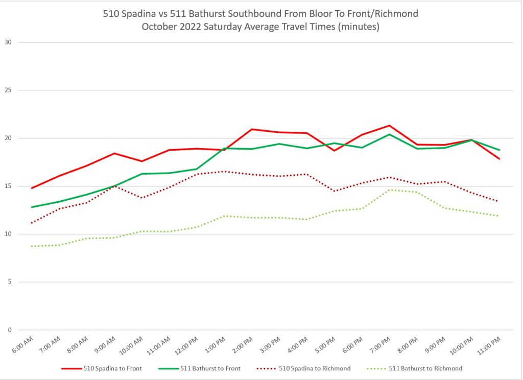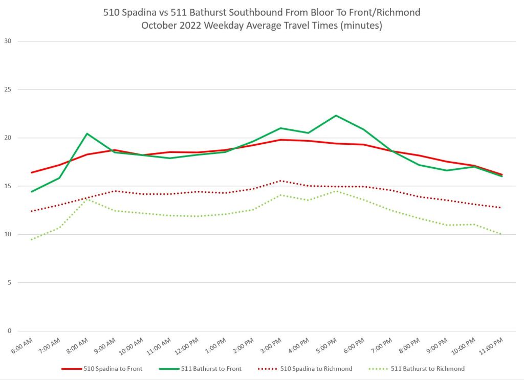 Back in August 2021, I published an article about running times on the 510 Spadina streetcar including comparisons with the nearby 511 Bathurst car. Despite being on its own right-of-way, the Spadina car is almost always slower than the Bathurst car.