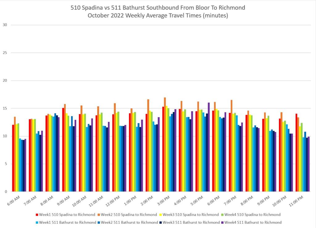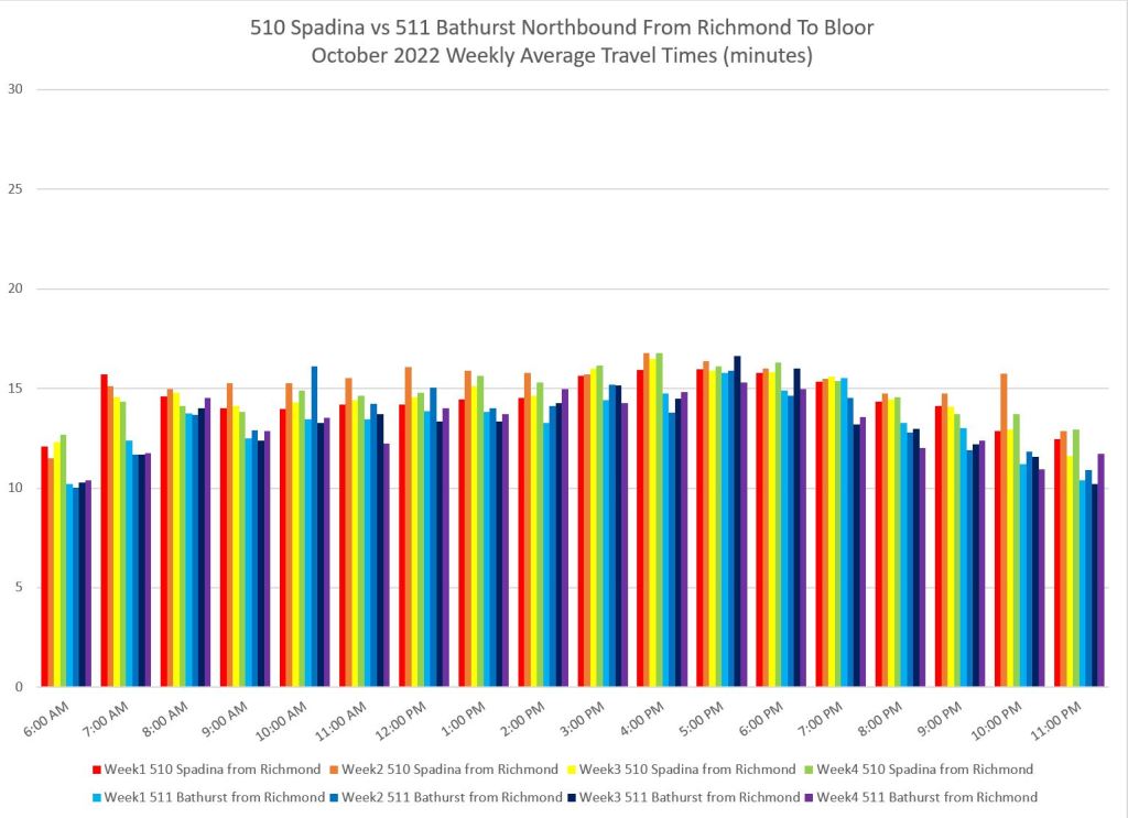 The situation has not changed much in the intervening year and a half. 511 Bathurst cars still win the race during most time periods, although on a few occasions the 510 Spadina cars take the prize.