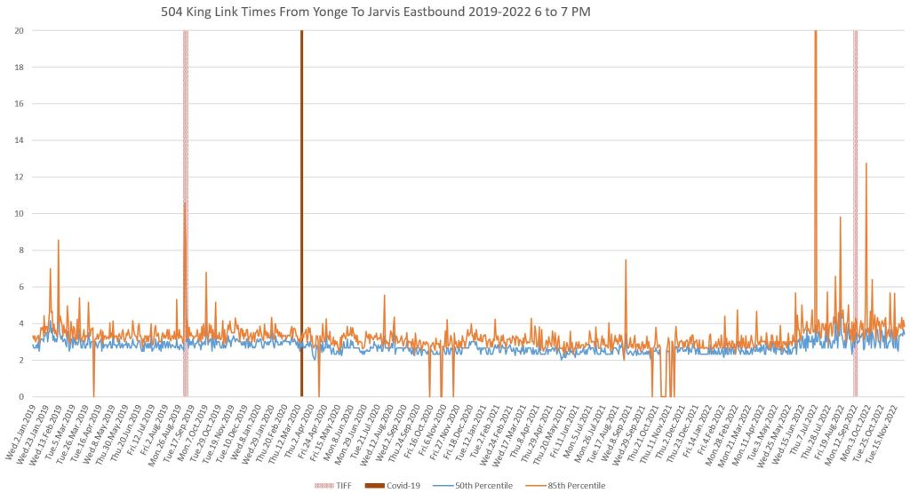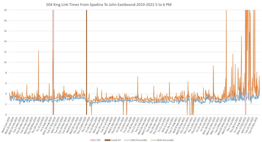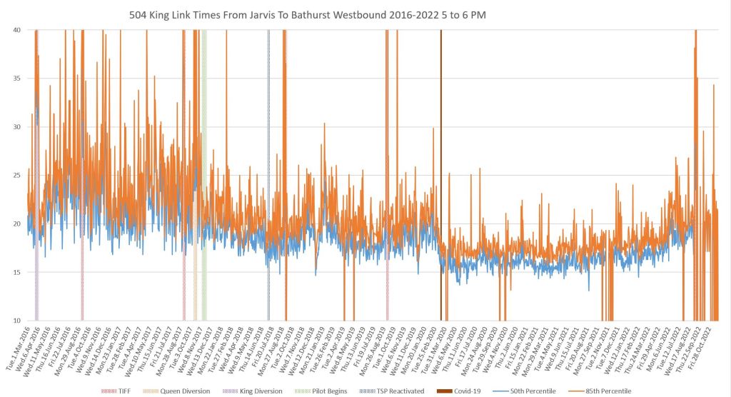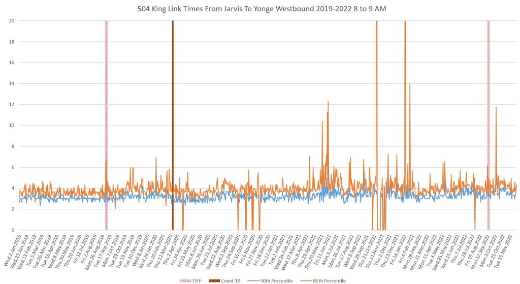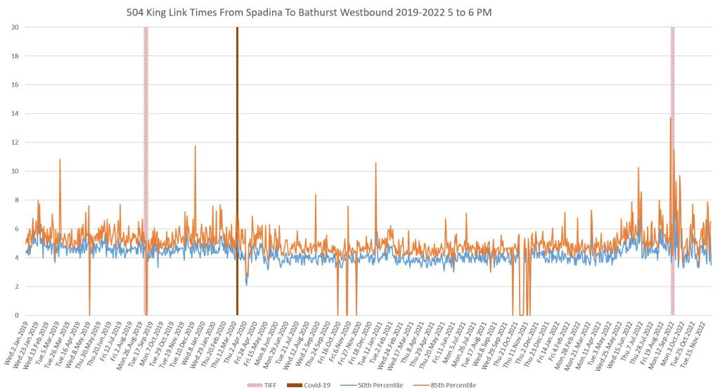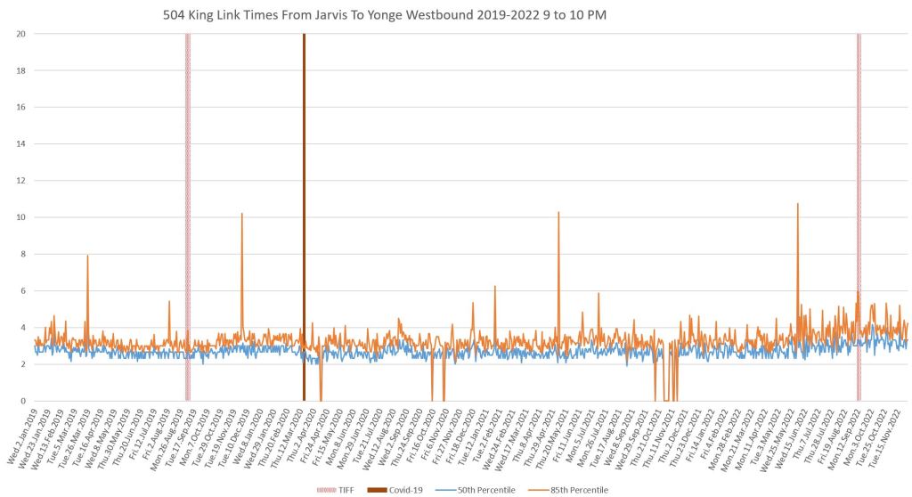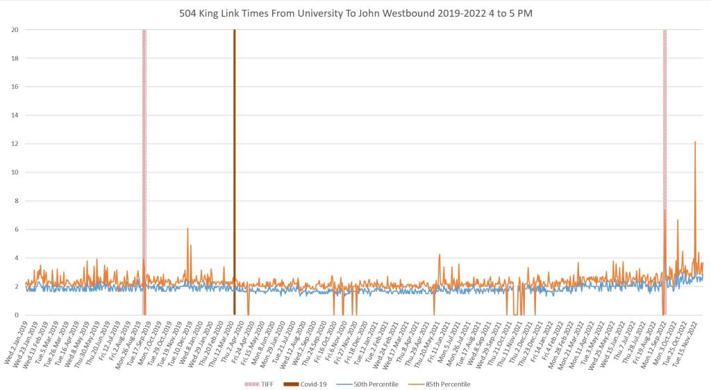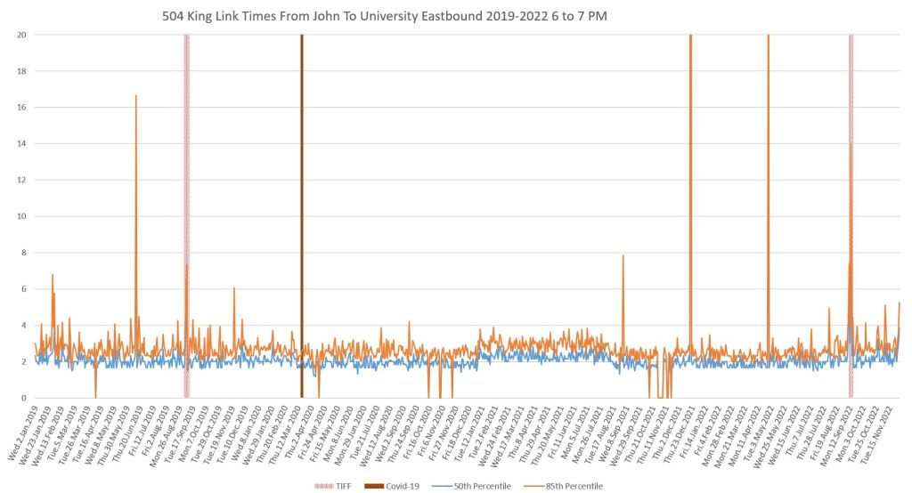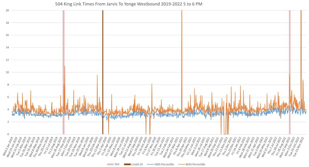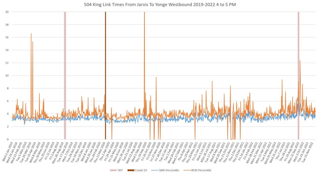 This article continues a series looking at the travel times on King Street in the “transit priority” segment between Bathurst and Jarvis Streets with data to the end of November 2022.