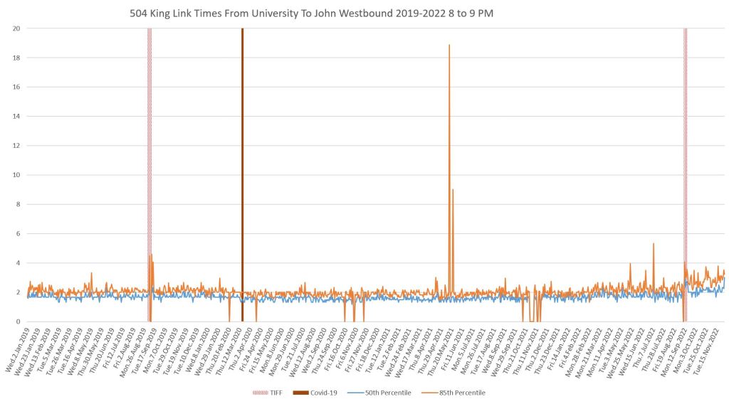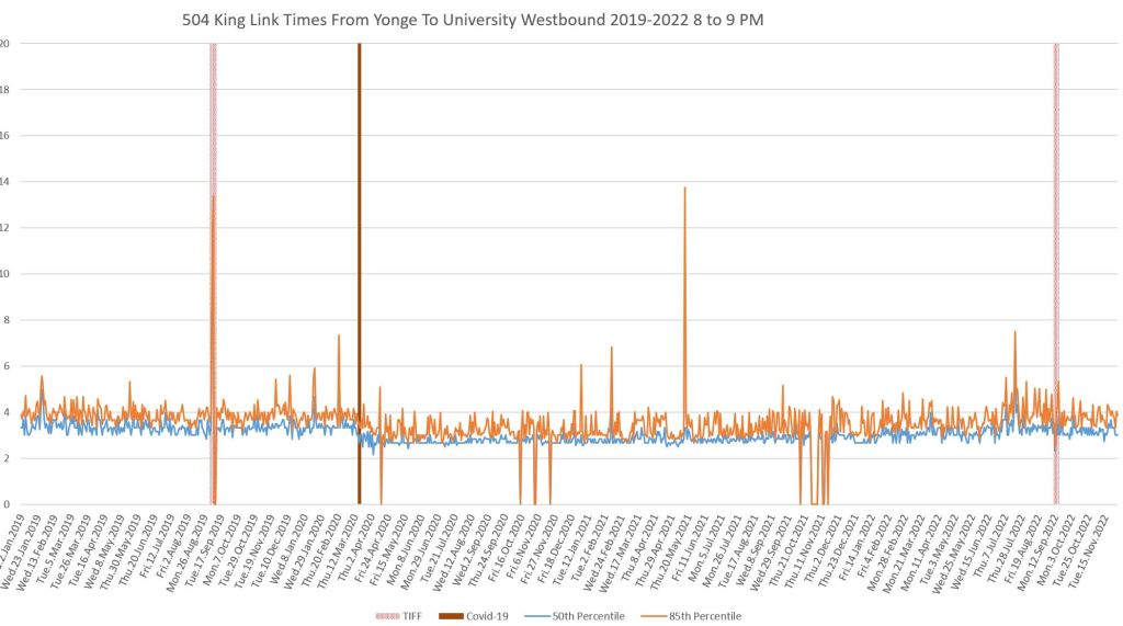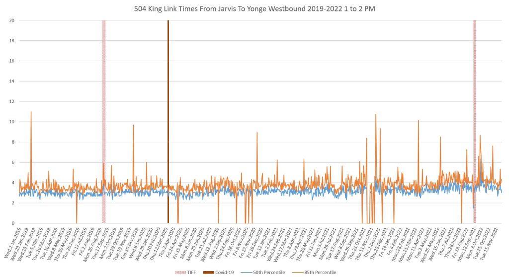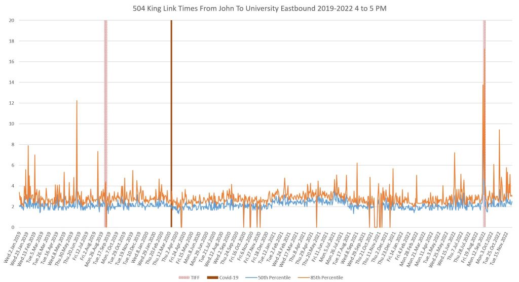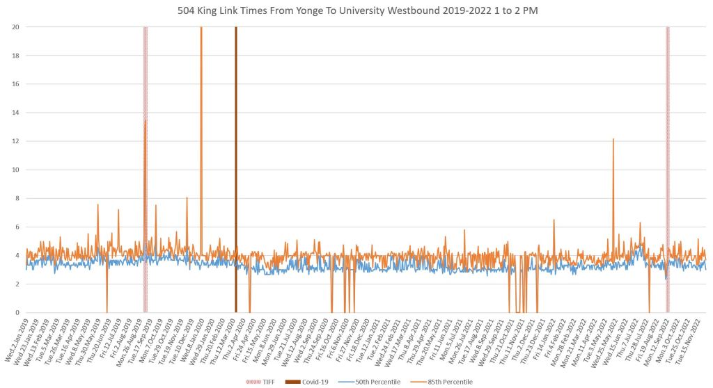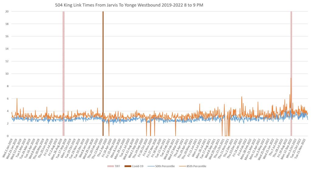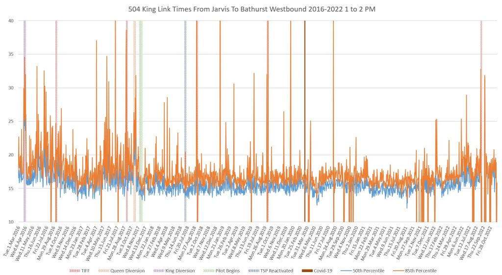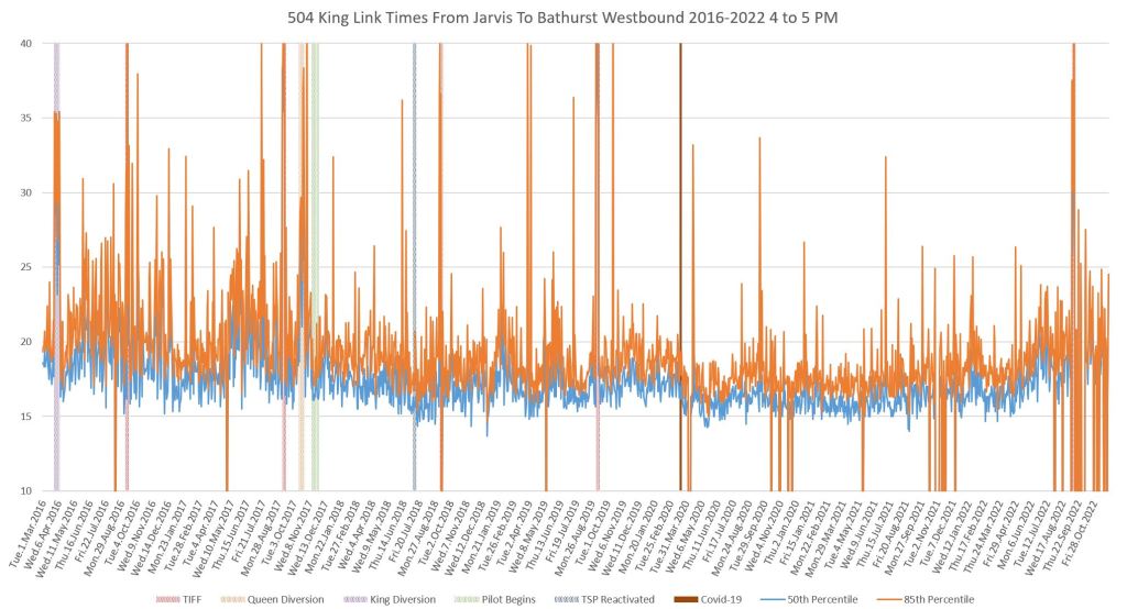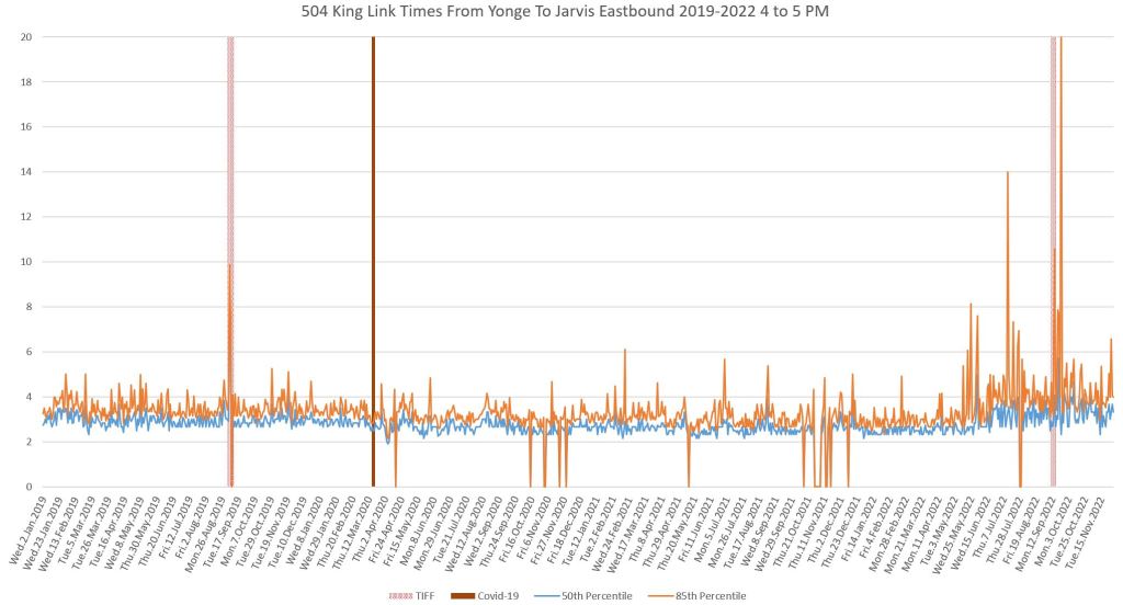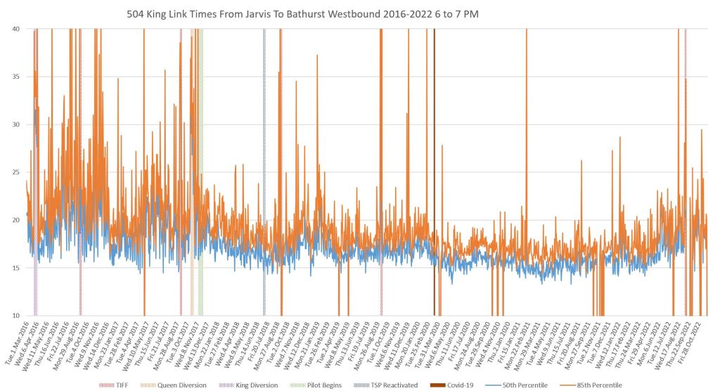 This article continues a series looking at the travel times on King Street in the “transit priority” segment between Bathurst and Jarvis Streets with data to the end of November 2022.