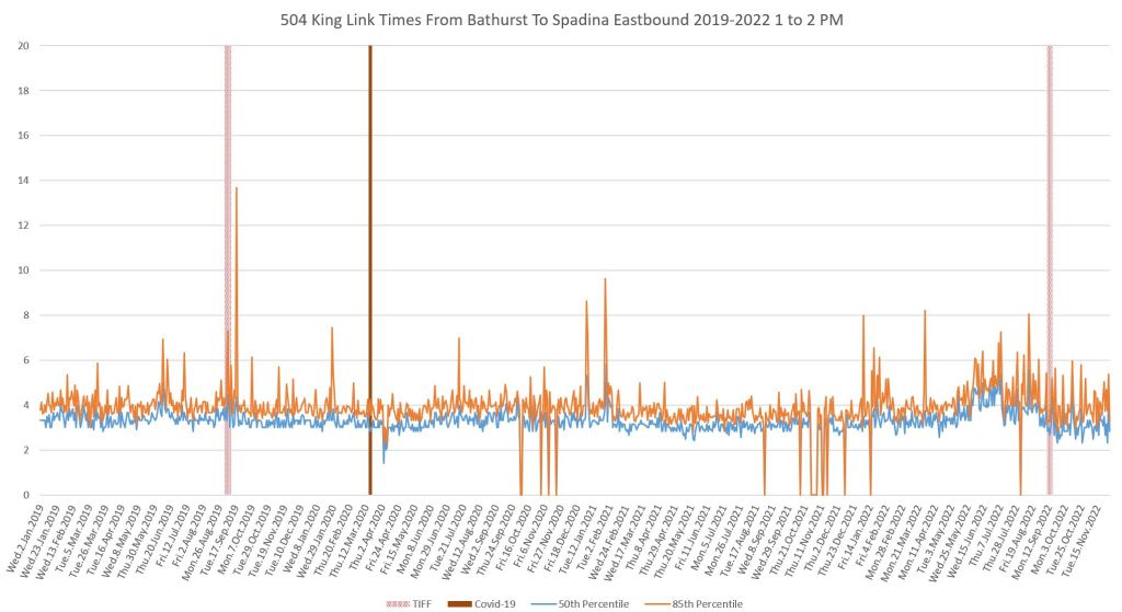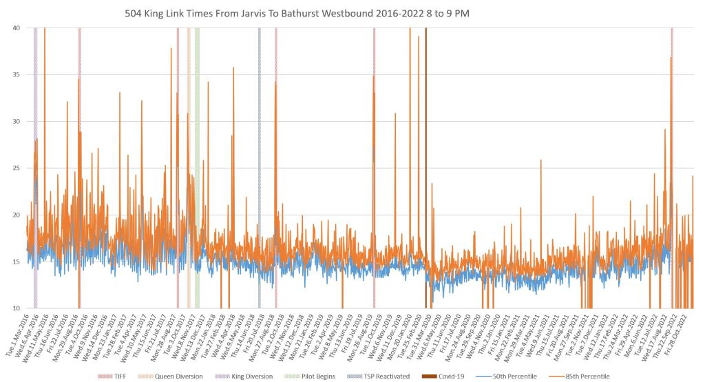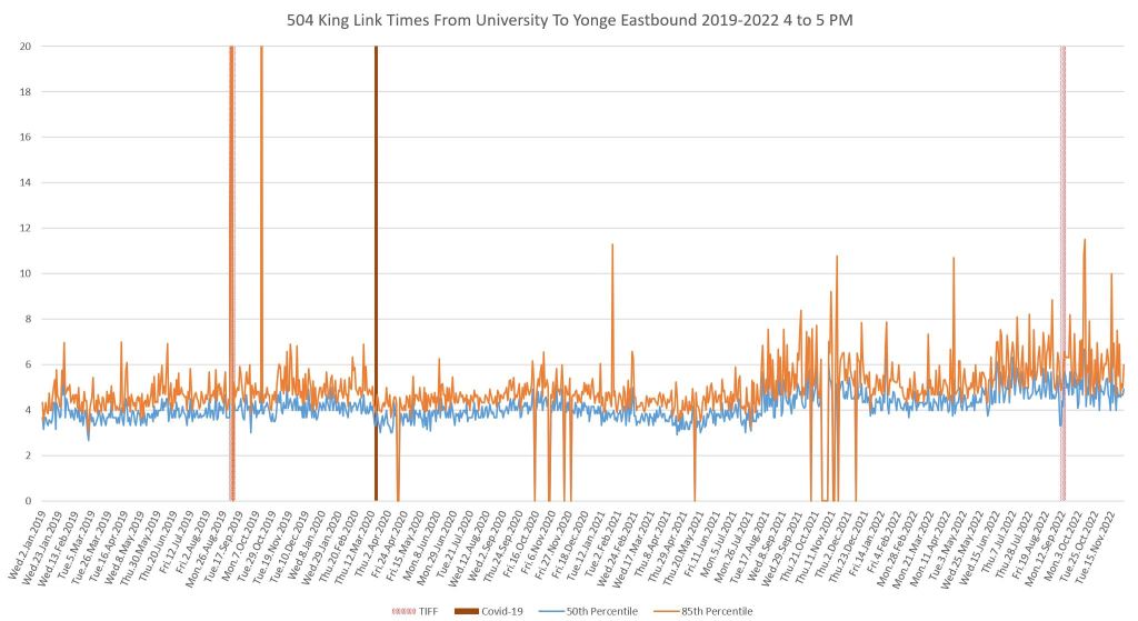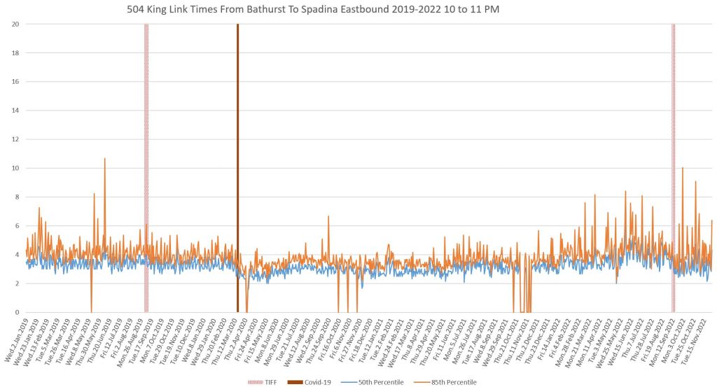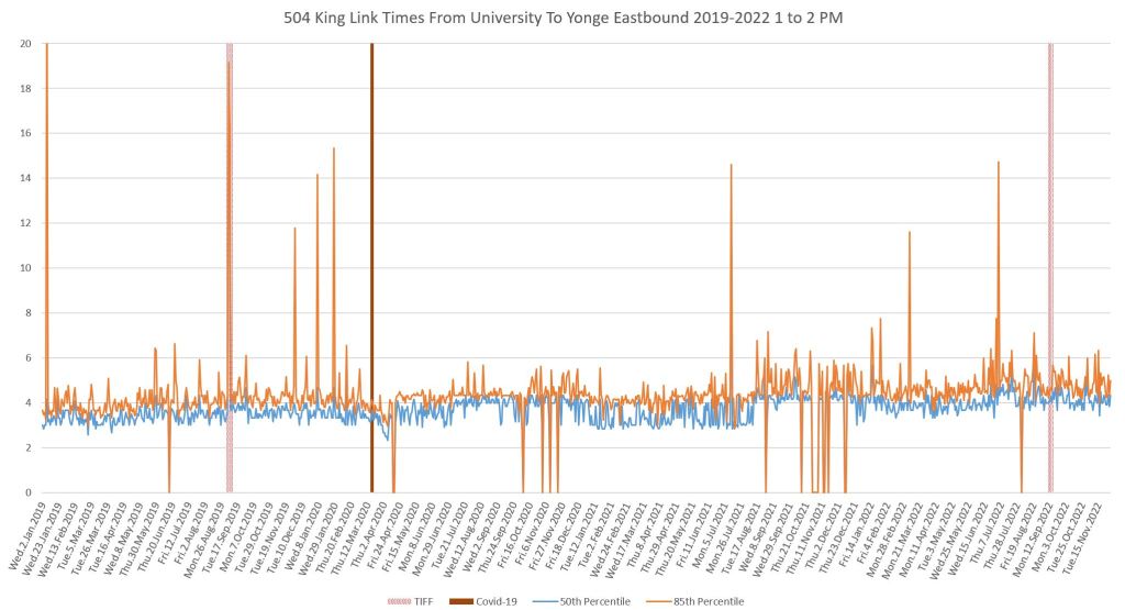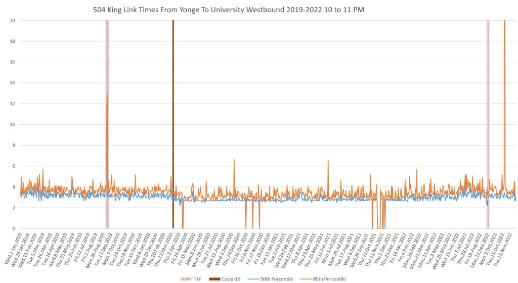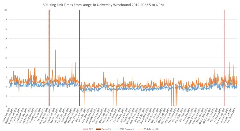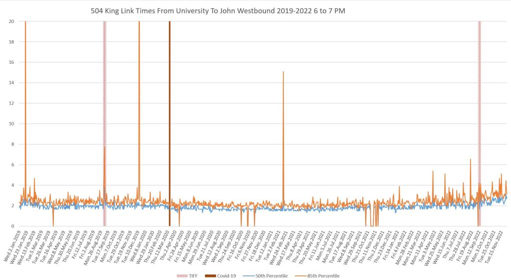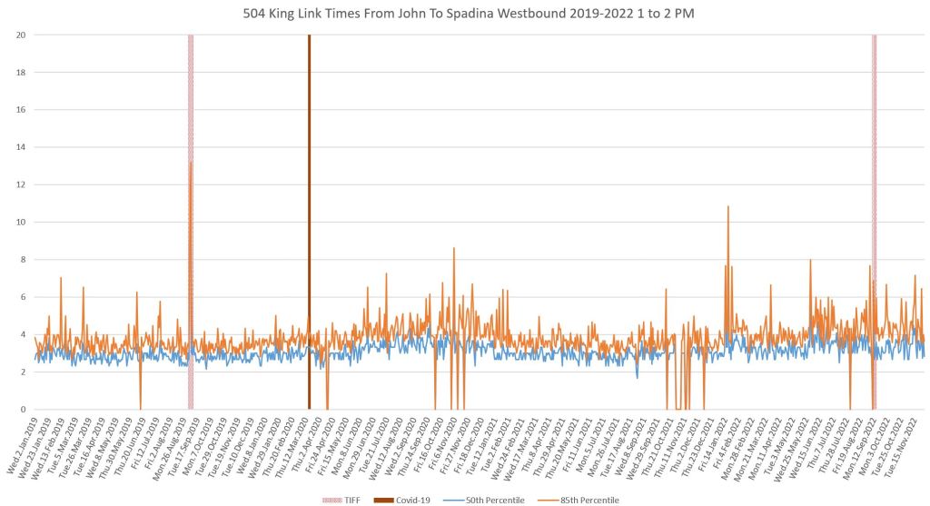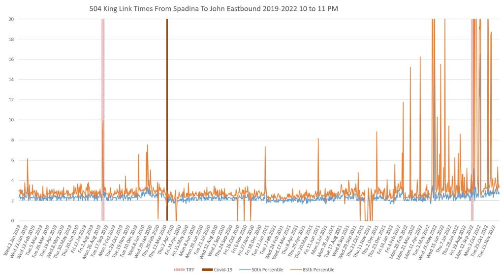 This article continues a series looking at the travel times on King Street in the “transit priority” segment between Bathurst and Jarvis Streets with data to the end of November 2022.
