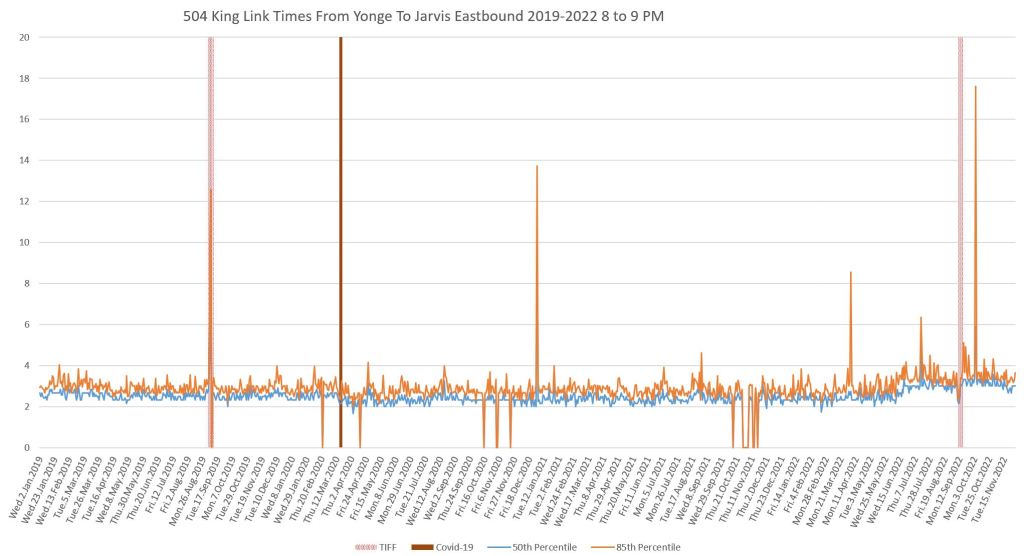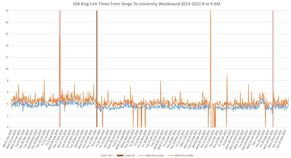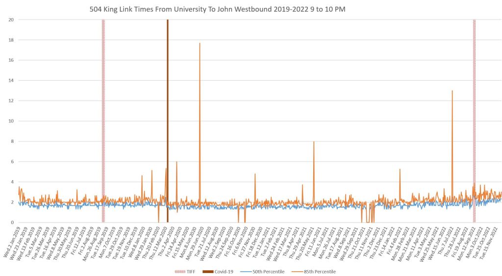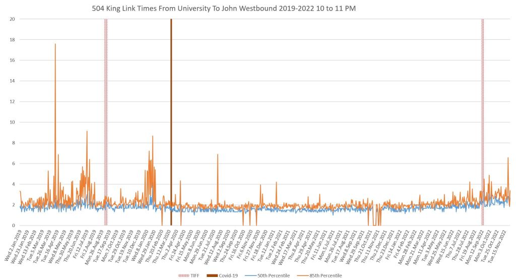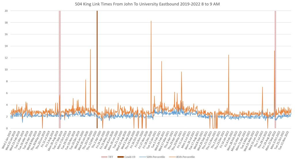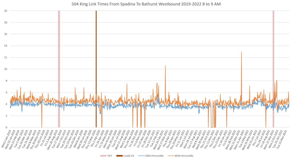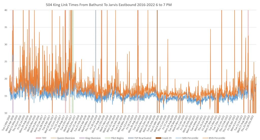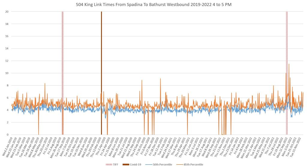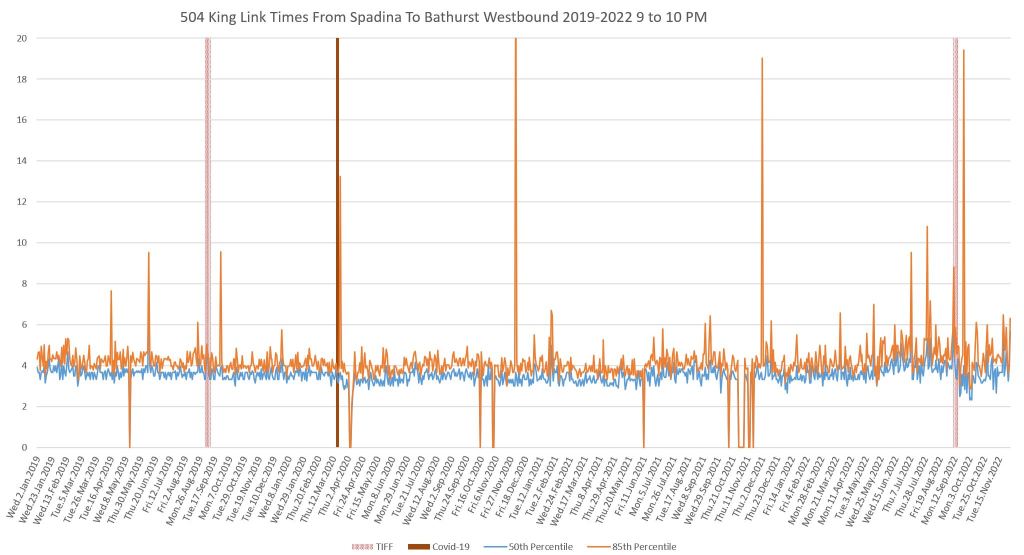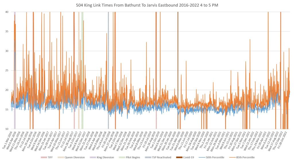This article continues a series looking at the travel times on King Street in the “transit priority” segment between Bathurst and Jarvis Streets with data to the end of November 2022.