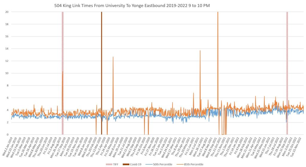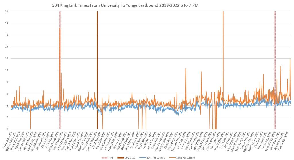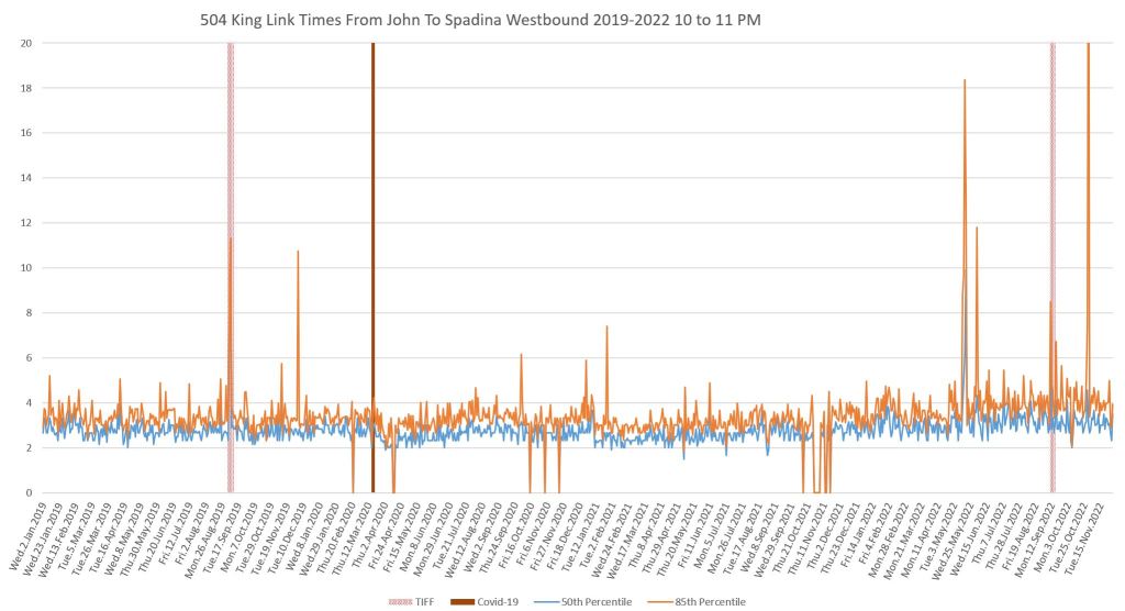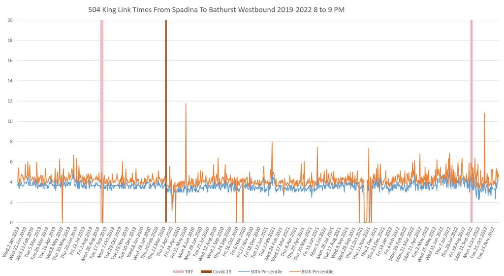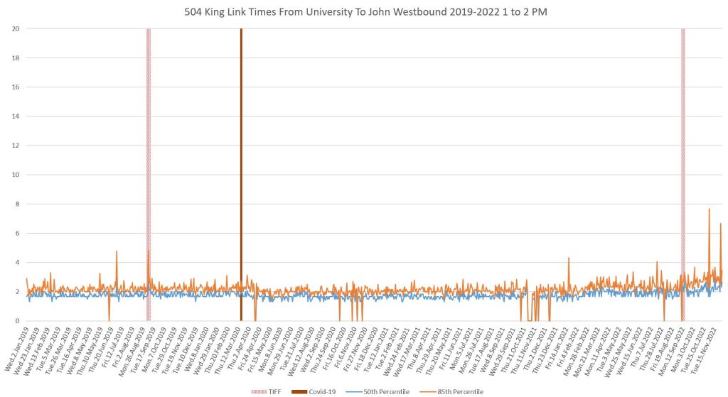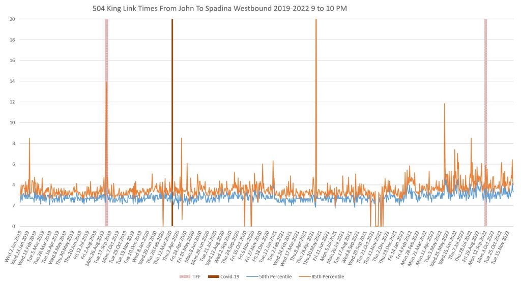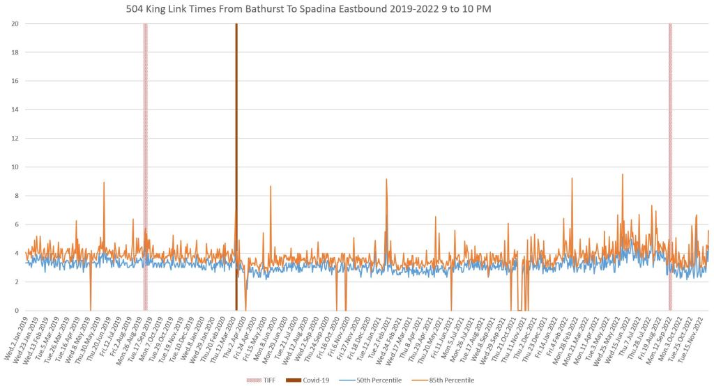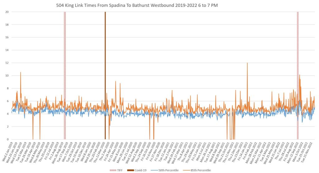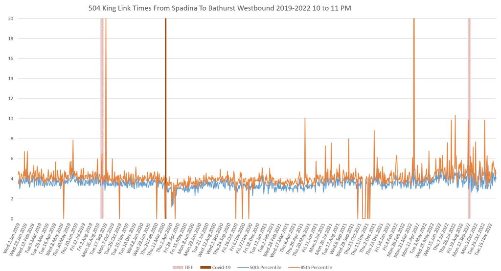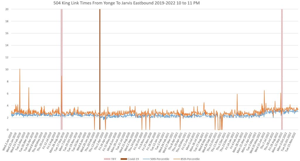 This article continues a series looking at the travel times on King Street in the “transit priority” segment between Bathurst and Jarvis Streets with data to the end of November 2022.
