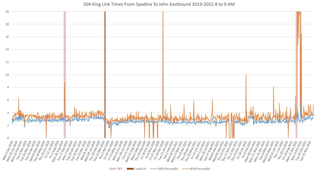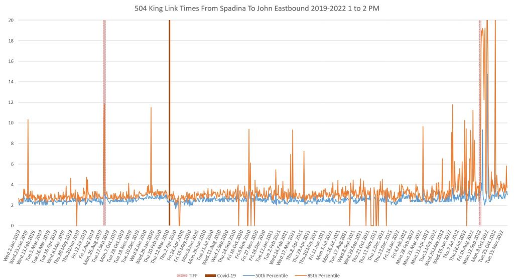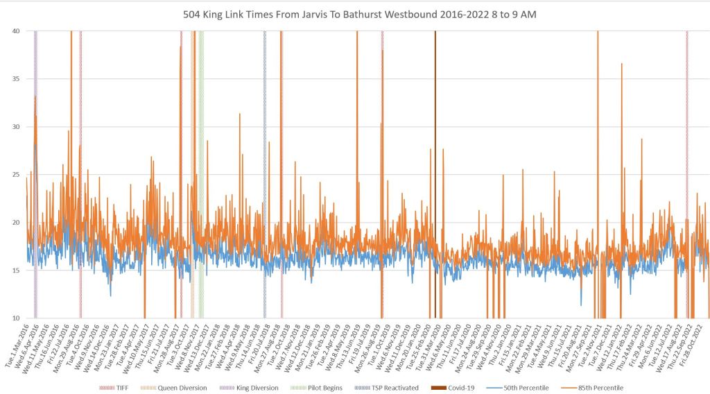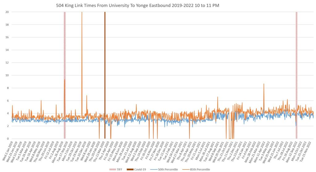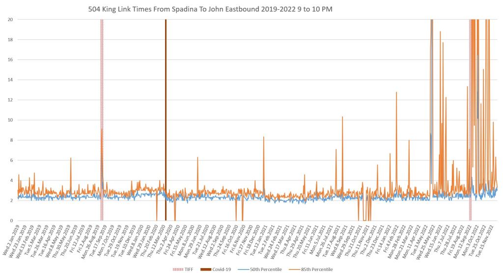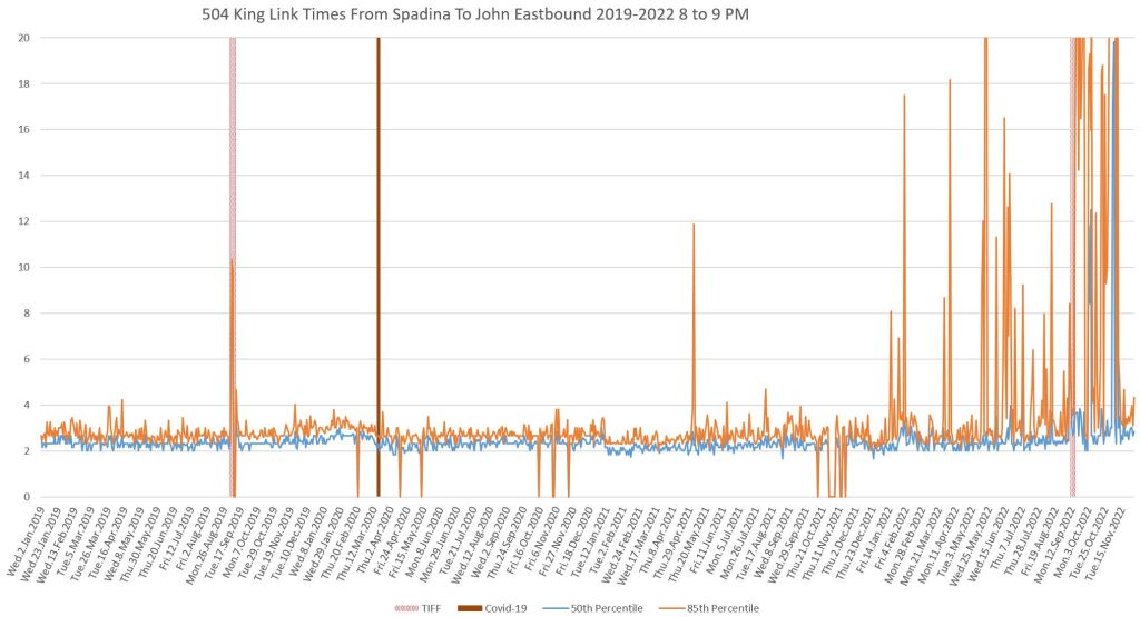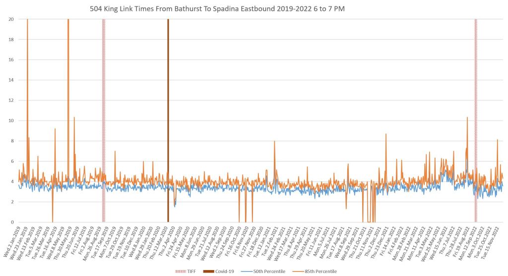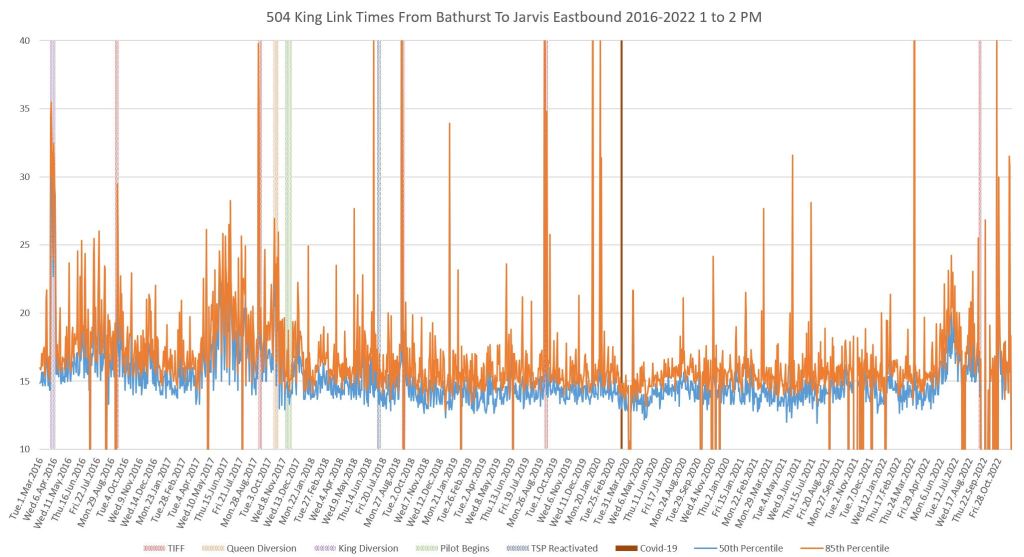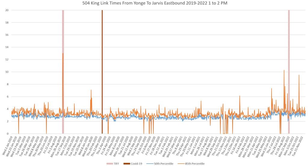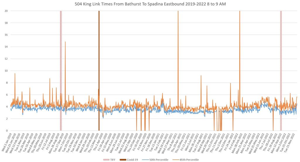 This article continues a series looking at the travel times on King Street in the “transit priority” segment between Bathurst and Jarvis Streets with data to the end of November 2022.
