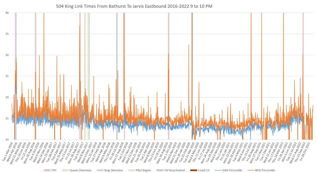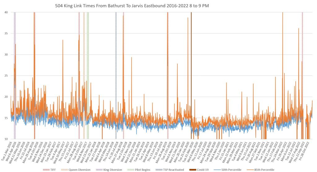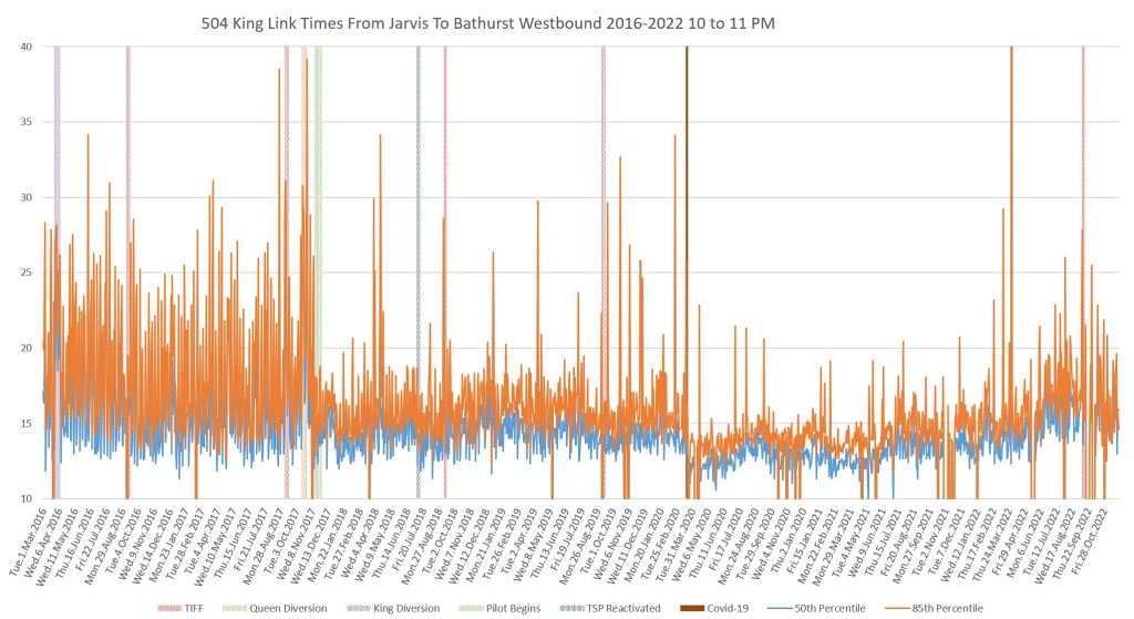 Steve: I have looked at the data in more detail for the segments between Jarvis and Yonge, and from Yonge to University. There is an increase both in average travel time and in the degree of variation at certain times of the day, although not the same as the segments further west which have the entertainment district effects. I will update the article with additional charts for the two segments east from University.