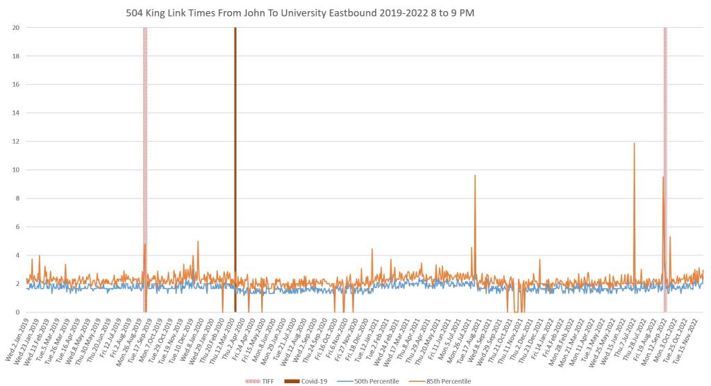In late 2022, there are several times where the values fall to zero. The reason for this is that during the King/Shaw reconstruction, many streetcars, sometimes all of them, turned back eastbound at Spadina even though at least some were to scheduled to operate to Bathurst Street. This meant that there are no Jarvis-Bathurst trips and no travel time measurements over the full span. Normal service was restored at King/Shaw in early December, and almost concurrently the loop via Charlotte Street at Spadina became unavailable due to construction. The effect of these changes should be visible once the December 2022 data are available.
