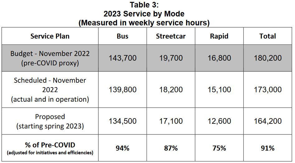 Note that this includes minimal reductions on the bus network, but more substantial cuts on streetcar and especially on rapid transit lines. [Table 3, p. 26 of Operating Budget Report]