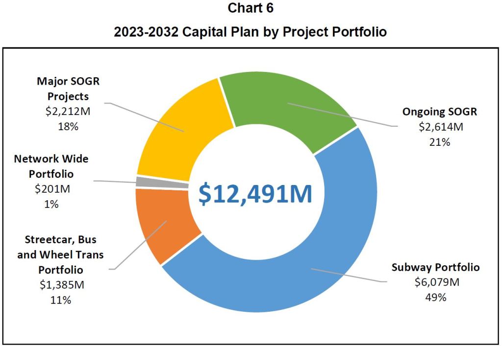 Looking at the plan another way with the unfunded portion broken out shows how deep the hole is. Well over half of the total is for subway work, primarily the capacity enhancement and renewal programs for Lines 1 and 2 (Yonge-University-Spadina and Bloor-Danforth), as well as for station upgrades and maintenance. This vividly demonstrates how expensive subways are to own, especially as they age.