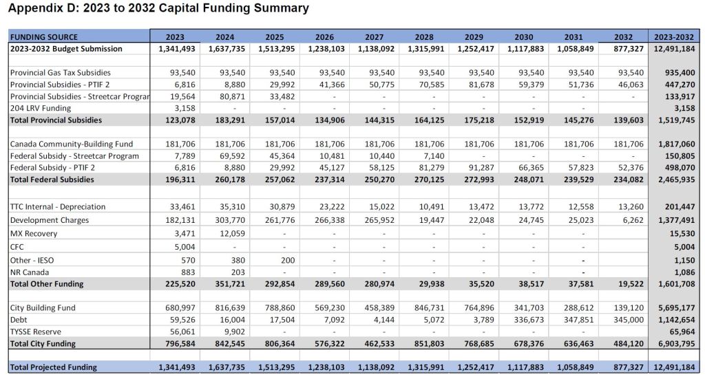 The funding summary below shows where the TTC expects to get $12.5 billion over the next ten years.