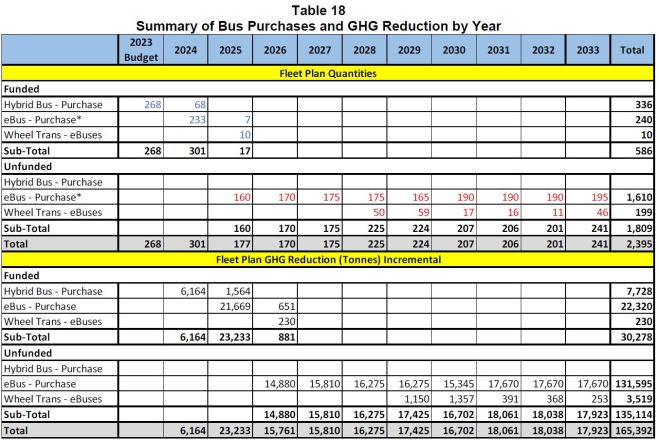 The Bus Fleet Plan is touted as an example of how the TTC will contribute to emission reductions in the City, but it is symptomatic of other problems. First and most obvious is the lack of funding beyond 2024. Note also that this chart only shows the vehicle component, and additional spending will be needed to convert garages from diesel to electric operation.