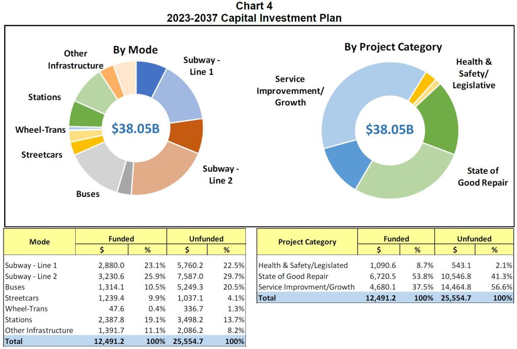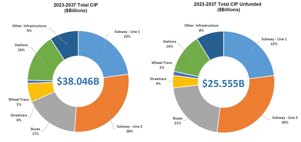 When the TTC first unveiled its 15-year Capital Investment Plan in 2019, this was a great shock to the City thanks to a major change in the content. In prior years, only the 10-year budget was produced, and many potential and necessary projects were either shown as “below the line” (unfunded), or were completely omitted. Every year brought big surprises when previously unbudgeted projects had to be acknowledged and started. The 15-year version shows everything including a mountain of unfunded proposals amounting to two-thirds of the total.