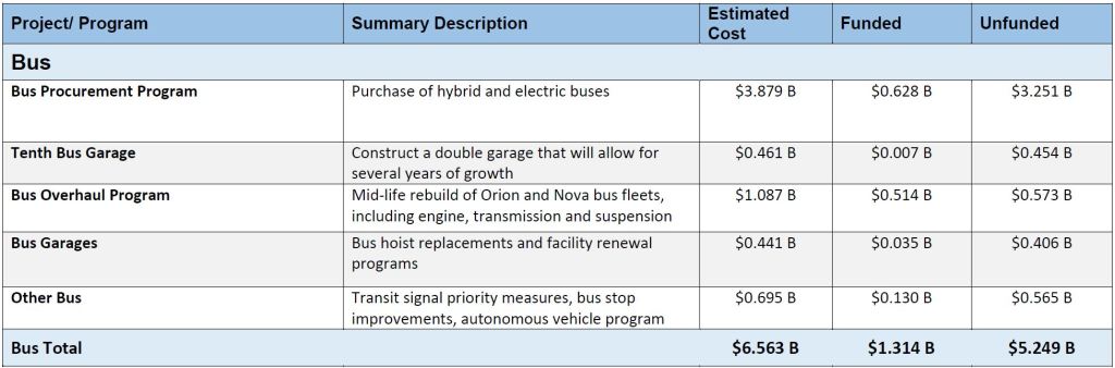 At one time, the “below the line” items were treated as a wish list, projects that would be nice to have if Santa Claus appeared one day with bags of transit cash. However, the unfunded portion of the plan now includes much work that is ongoing “State of Good Repair”. Failure to fund and undertake this work will inevitably lead to a decline in the condition of capital assets and transit service. Later in this article there is a chart showing the accumulating SOGR backlog if more funding is not found.