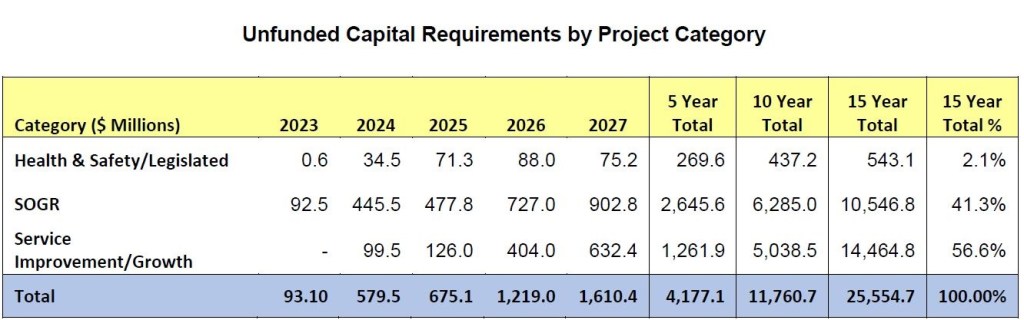 There is an obvious contrast between this Capital Budget, of which over a third is earmarked for “Growth” and “Service Improvement” at a time when retrenchment in day-to-day service is proposed by the Operating Budget. There is a further $11.8 billion in unfunded requirements over the 10-year period as shown in the table above which includes $5 billion for growth and service improvement.