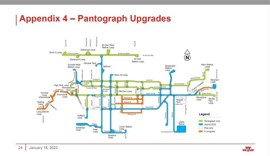 Gradually, and several years behind the original target date, the TTC has converted overhead wiring designed for trolley poles first to a hybrid pole/pantograph configuration, and then to pure pantograph style. A map of the current status was included in the staff presentation.