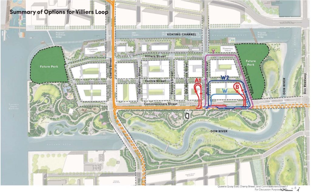 Steve: The Commissioners Loop avoids the need for a twin of the “yellow bridge” carrying Cherry south over the new river. Also, the assumption is that development south of that channel will occur considerably later. On a larger scale, I have my doubts that the Broadview extension will ever be built, and without it the Commissioners extension (which also needs a twin of the “orange bridge” plus relocation of hydro towers) is very unlikely. The Commissioners Loop serves both sides of Villiers Island as an “initial” service that may be more permanent than we care to think.