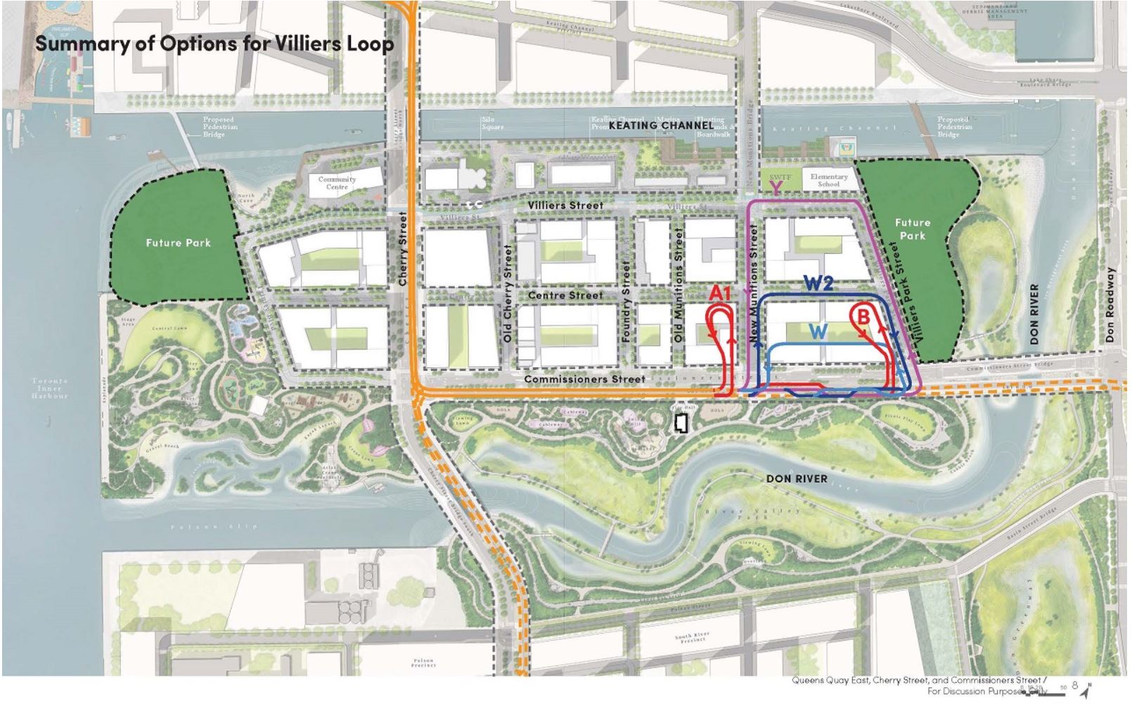 Various options were considered for a loop on Villiers Island, the new island created by the rerouted river on the east and south, the Keating Channel on the north and the harbour on the west.