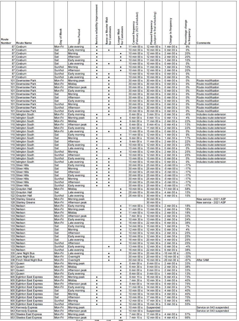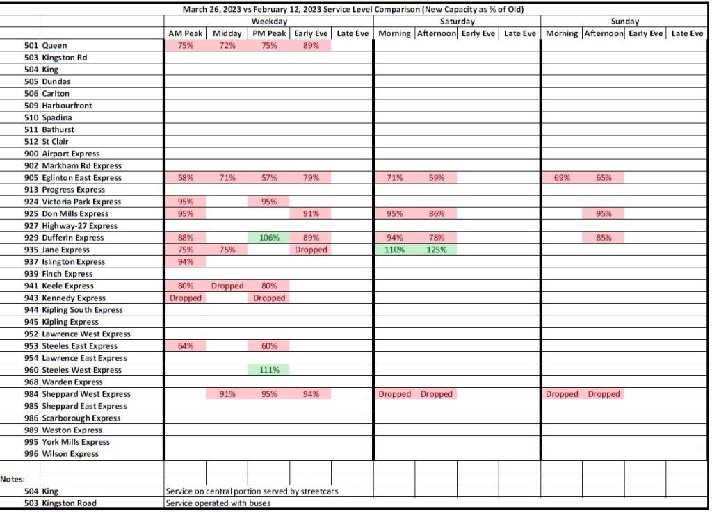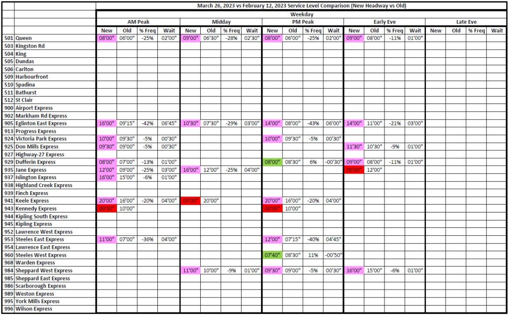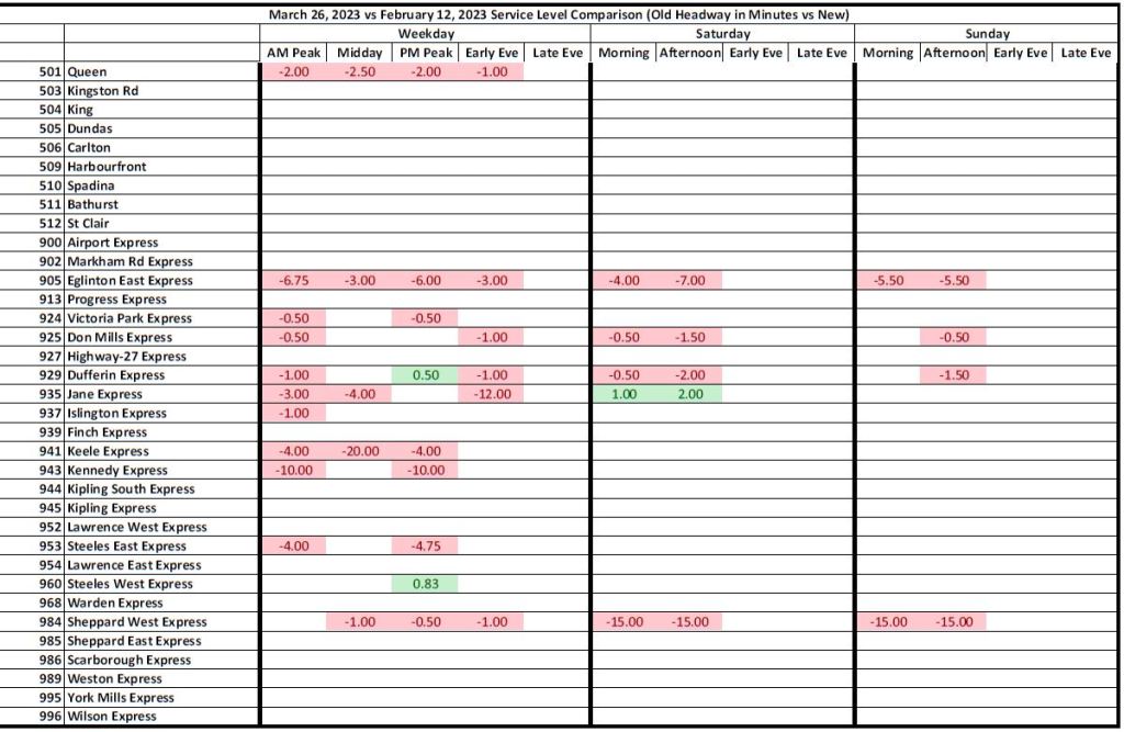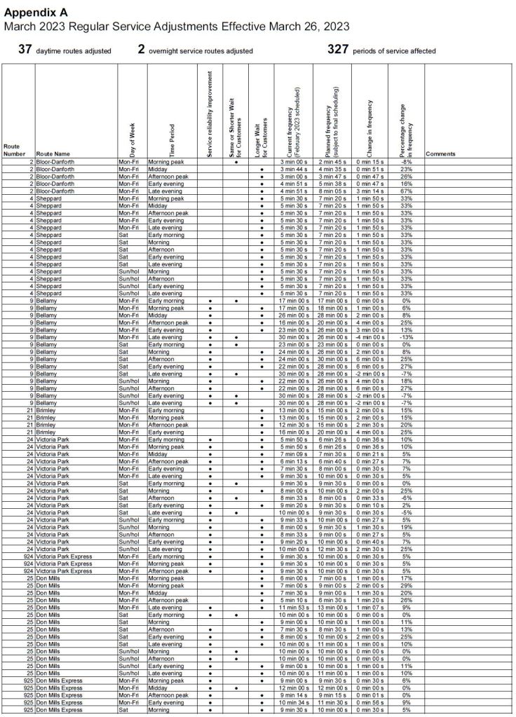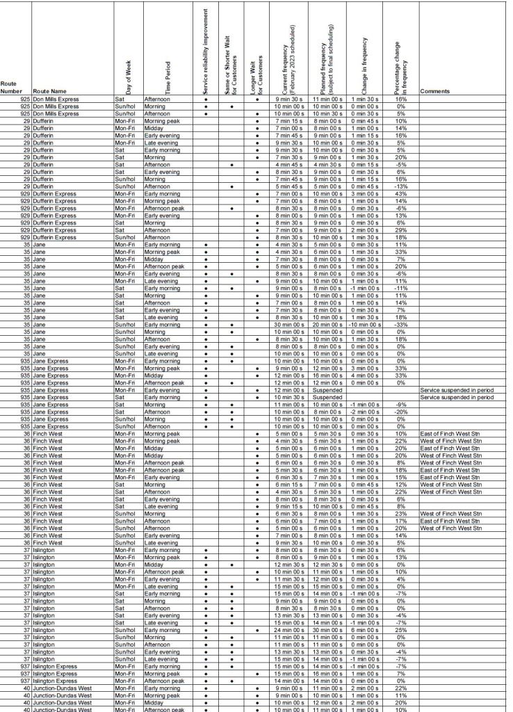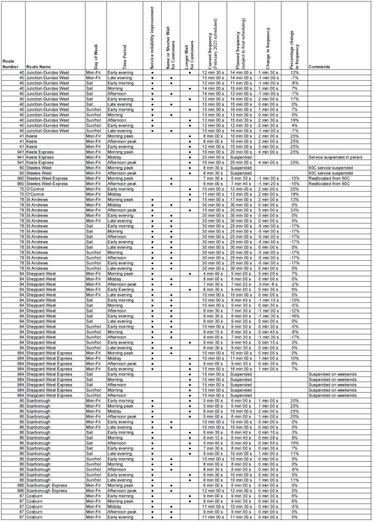 The big challenge will be that this year, and likely 2024 will be “austerity” years where any improvements will come from robbing one route to fund another. Various proposed extensions are on hold due to resources. Don’t forget that changes in Scarborough are linked to the SRT shutdown and so you won’t see anything there until November, assuming that remains the target month. 150 Eastern is on hold due to construction in various locations.
